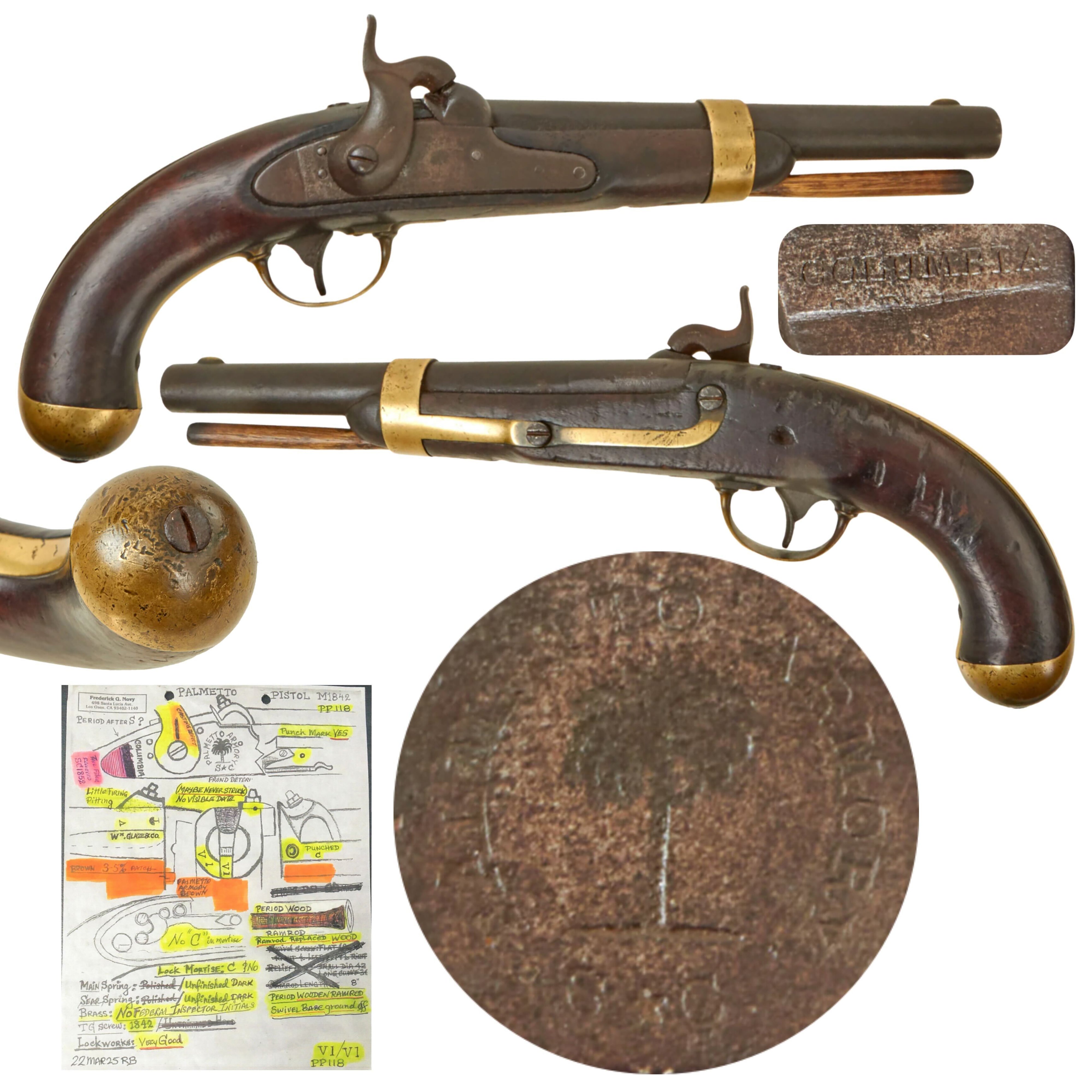 This armory initially retained its original name, the Palmetto Iron Works, which was famous for making tools, barrels and cotton gins. In 1851 the state of South Carolina contracted this company to produce arms for the South Carolina militia in preparation for a potential war, and the name was changed to Palmetto Armory. They also sold and/or produced numerous model 1842 muskets for South Carolina as well. When the U.S. Civil War broke out, these pistols were among the first to be sent out to arm confederate troops.