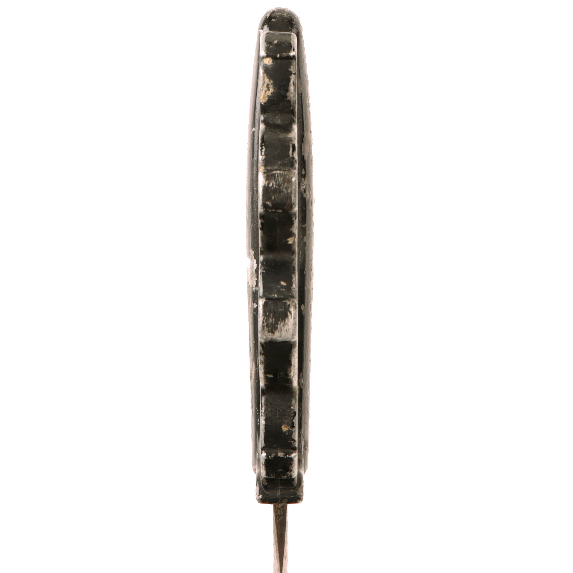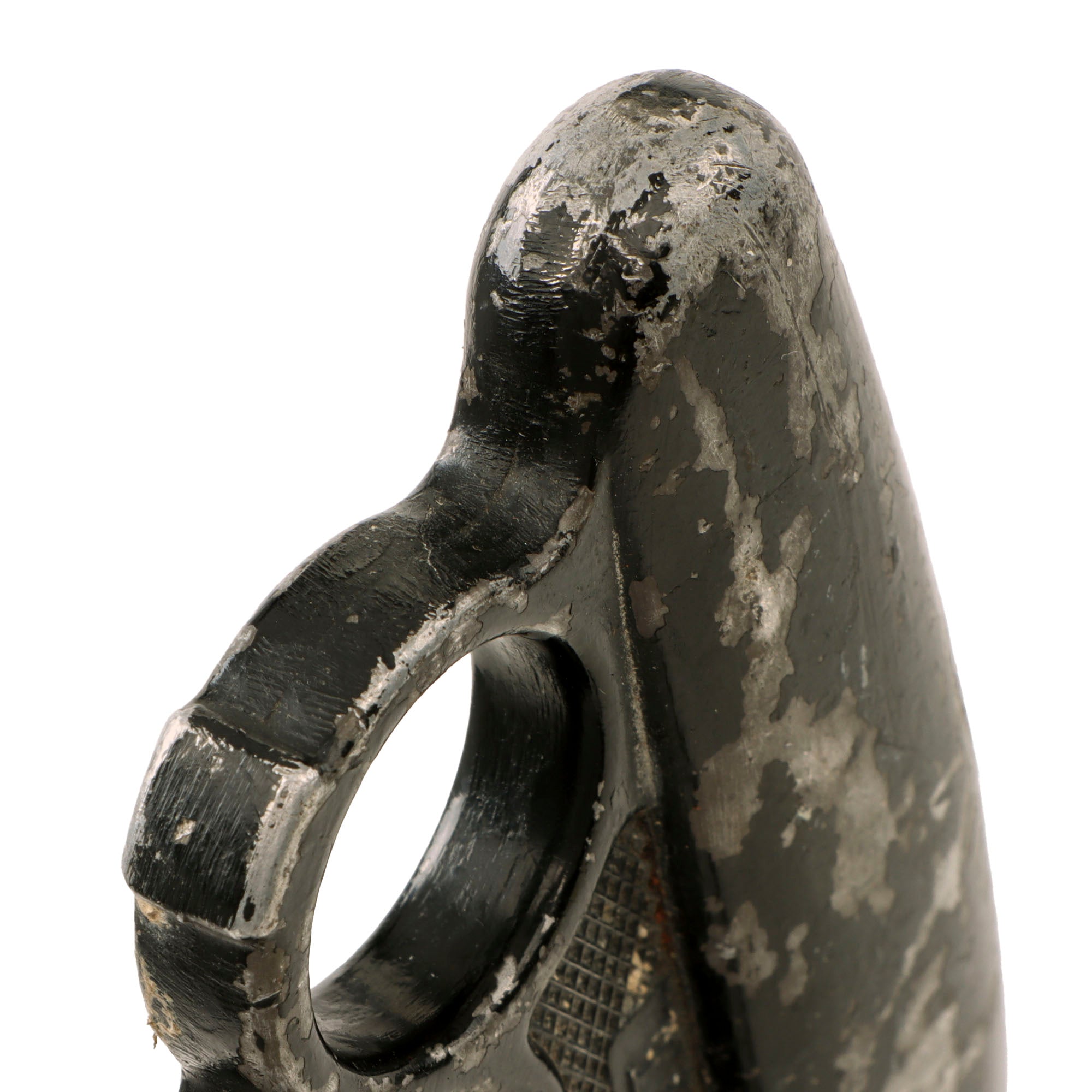 What is known is that these fighting knives were produced for use by US troops in the Pacific Theater of operations, and measure almost 12 inches in overall length. They feature a 5 inch long cast aluminum hilt, with four finger holes, which have small flat raised areas on the outside of each. The "palm" area of the grip is checkered, with a raised EVERITT marking. This is important to note, as most replicas of these have a stamped marking, and lack the proper texture. These knives came with either a black or green enamel paint on the handle, and this example has black paint. There is some chipping to the paint, but it is very well retained. These are often found nearly devoid of paint.