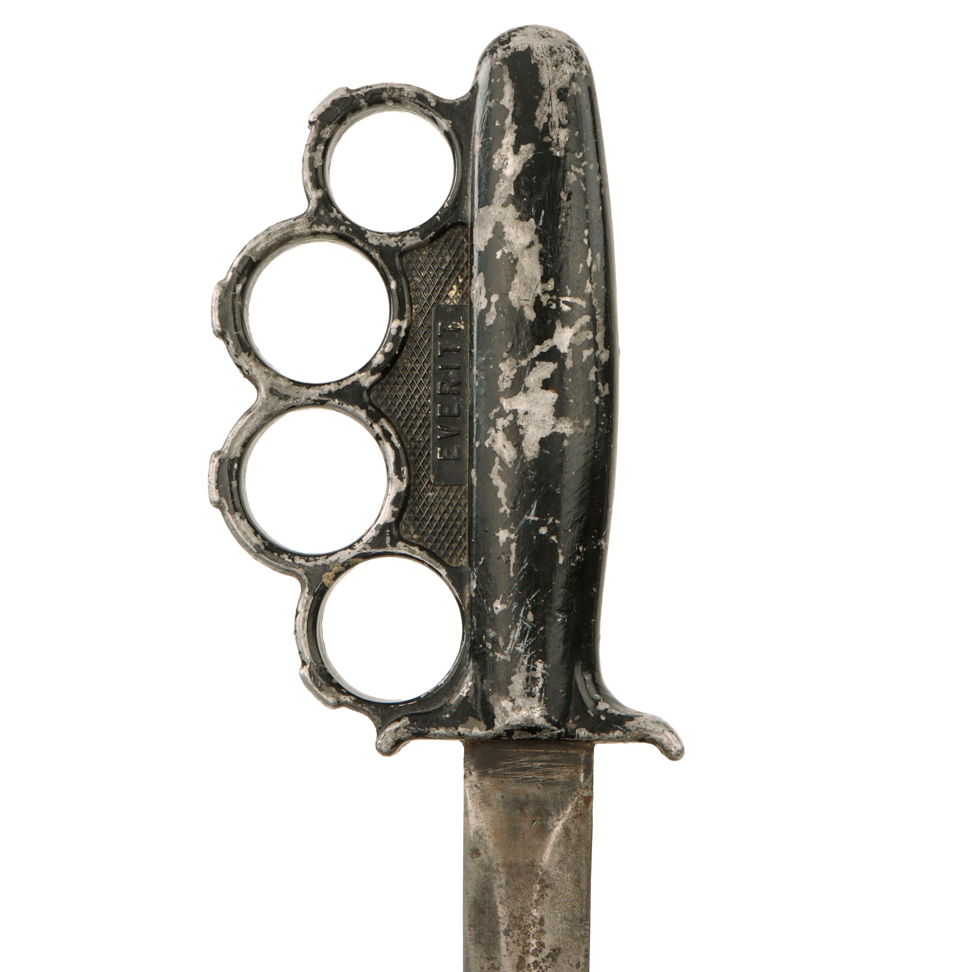 • Original Item: Only One Available. This is a solid well-used example of the rare U.S. WWII Everitt Knuckle fighting knife. It features a black painted handle, with the correct original scabbard which is missing the securing strap. No reference indicates that anyone knows who “Everitt” was, or who the company that produced the knives was. Some have surmised that it was the location of manufacture, but due to the passage of time, most likely the true answer will never be known.