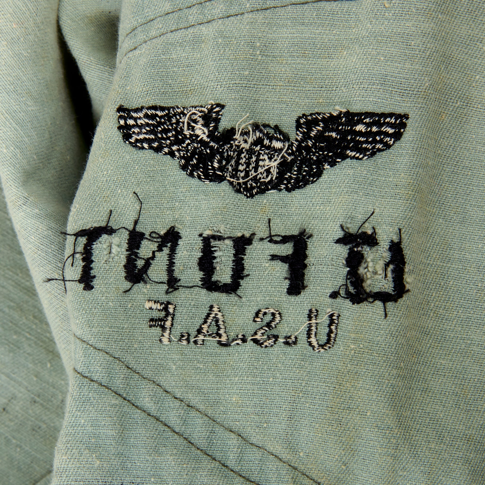 On the left breast is an embroidered set of Pilot wings over the embroidered name LT. FUNT over U.S.A.F.. There are also Lieutenant bars embroidered on the shoulders. We were unable to identify Lieutenant Funt, but there is more research to be done. The only marking to be found was 67 under the collar, possibly the size.