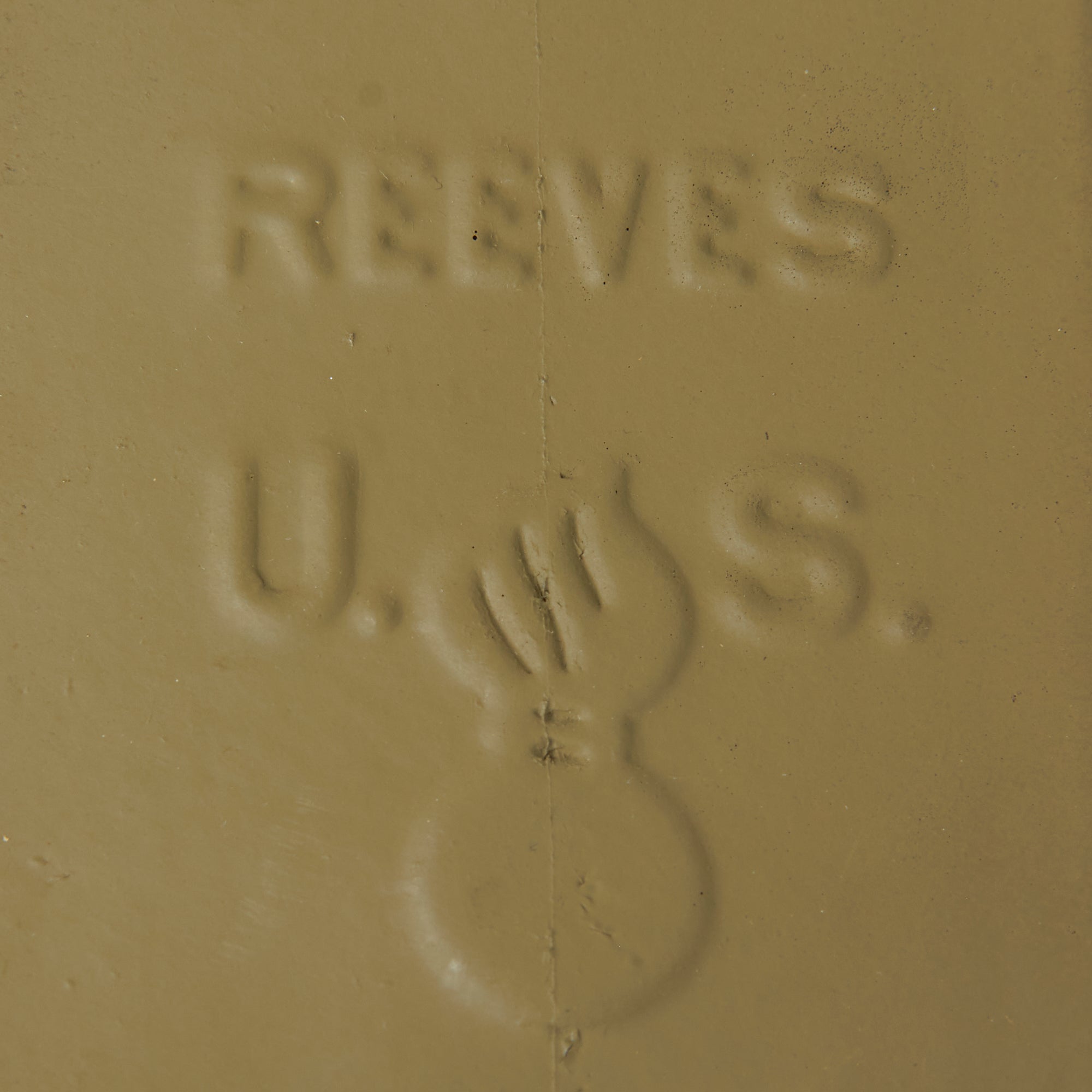 The canister measures roughly 10 ½ x 3 ½ x 7” tall and is marked REEVES over U.S. and a Flaming bomb on the side. The handle does not function. A great show prop. Comes ready for further research and display.