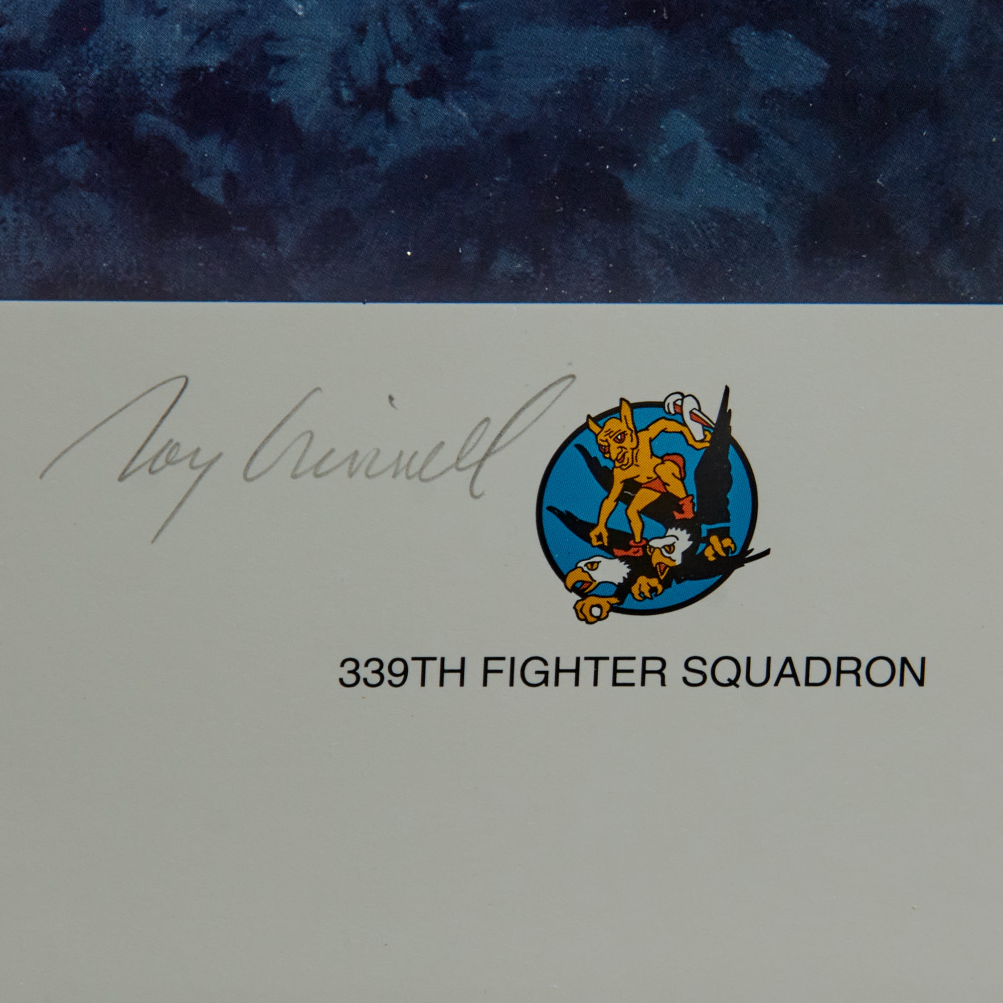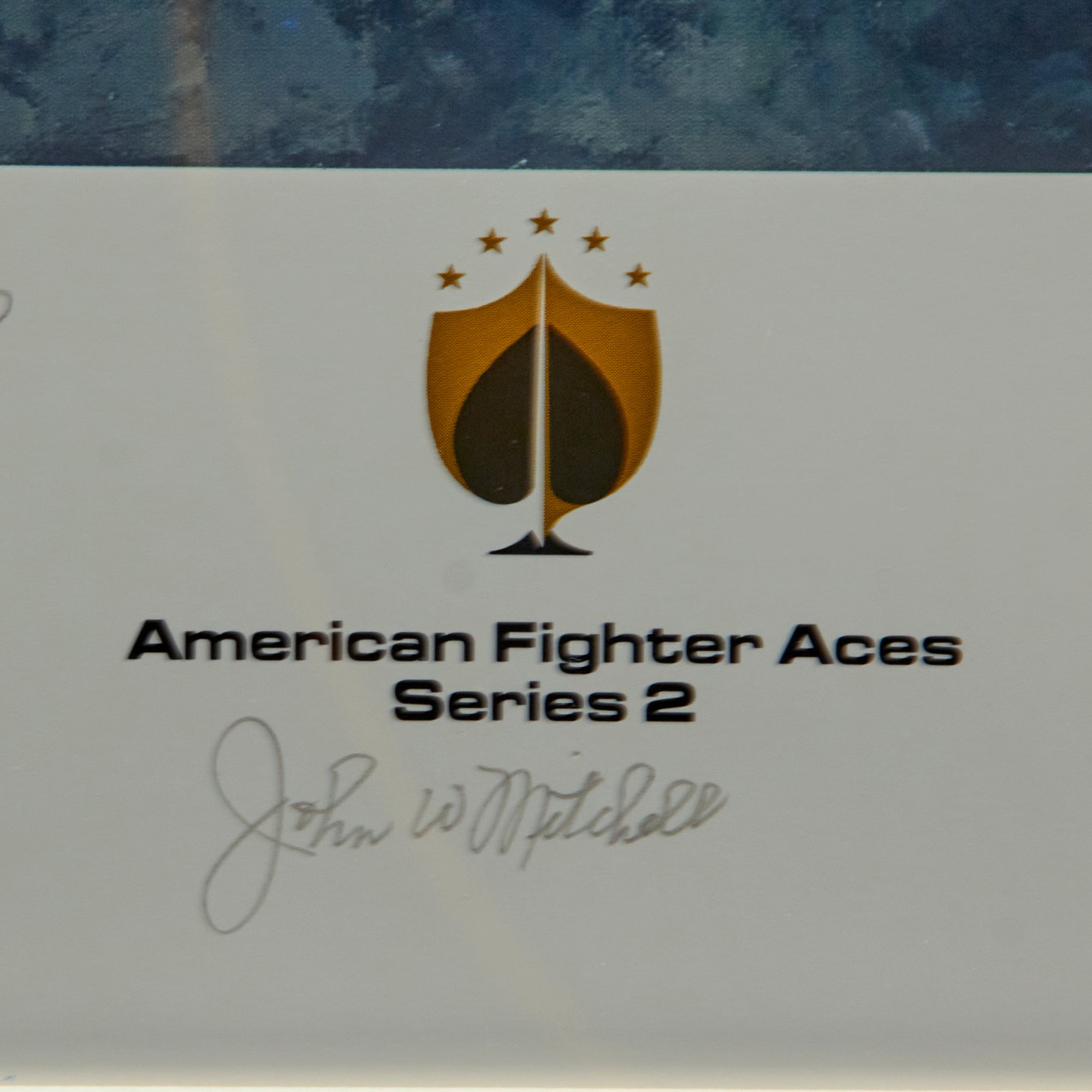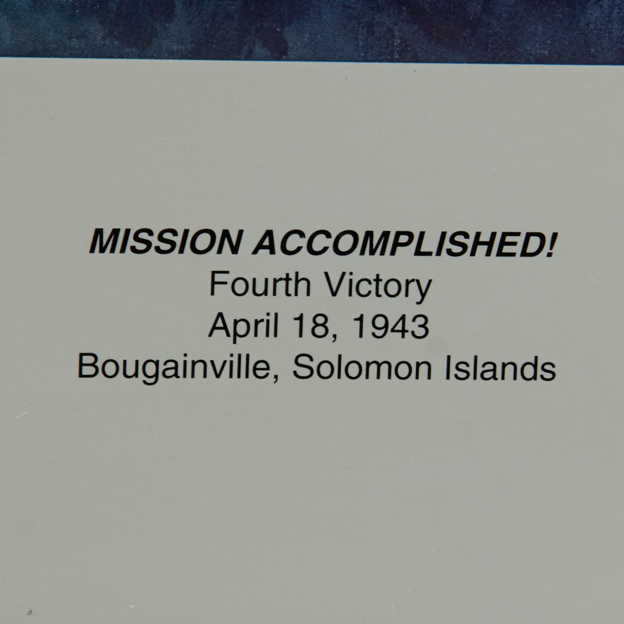 Original Item. Only One Available. This is a signed American Fighter Aces Series 2 print of “Mission Accomplished” by Roy Grinnell, signed at the bottom by Nine Pilots Who Flew on the Yamamoto Mission. The frame is well-put together and the print is very clear. This is a limited run print, number 422 out of 1250.