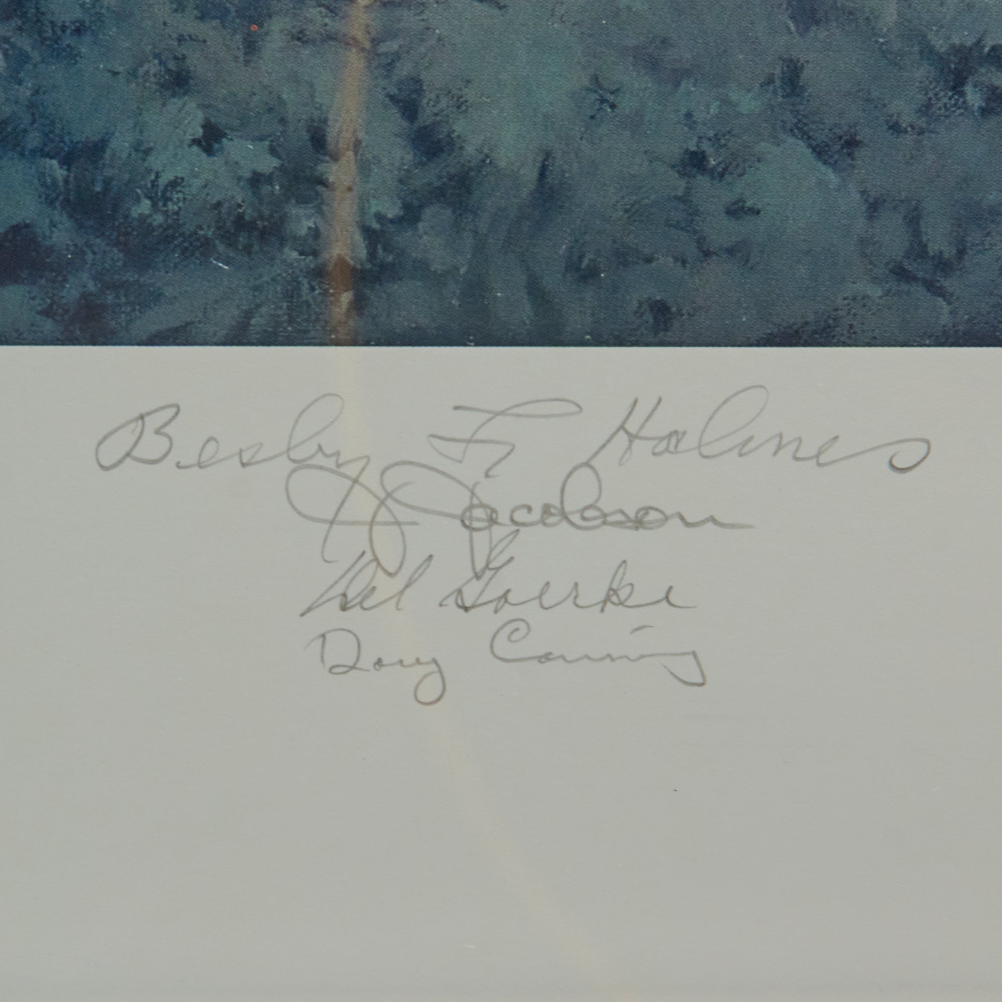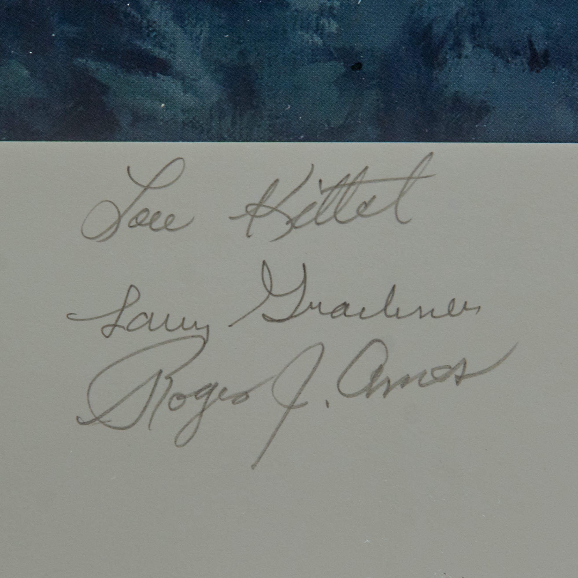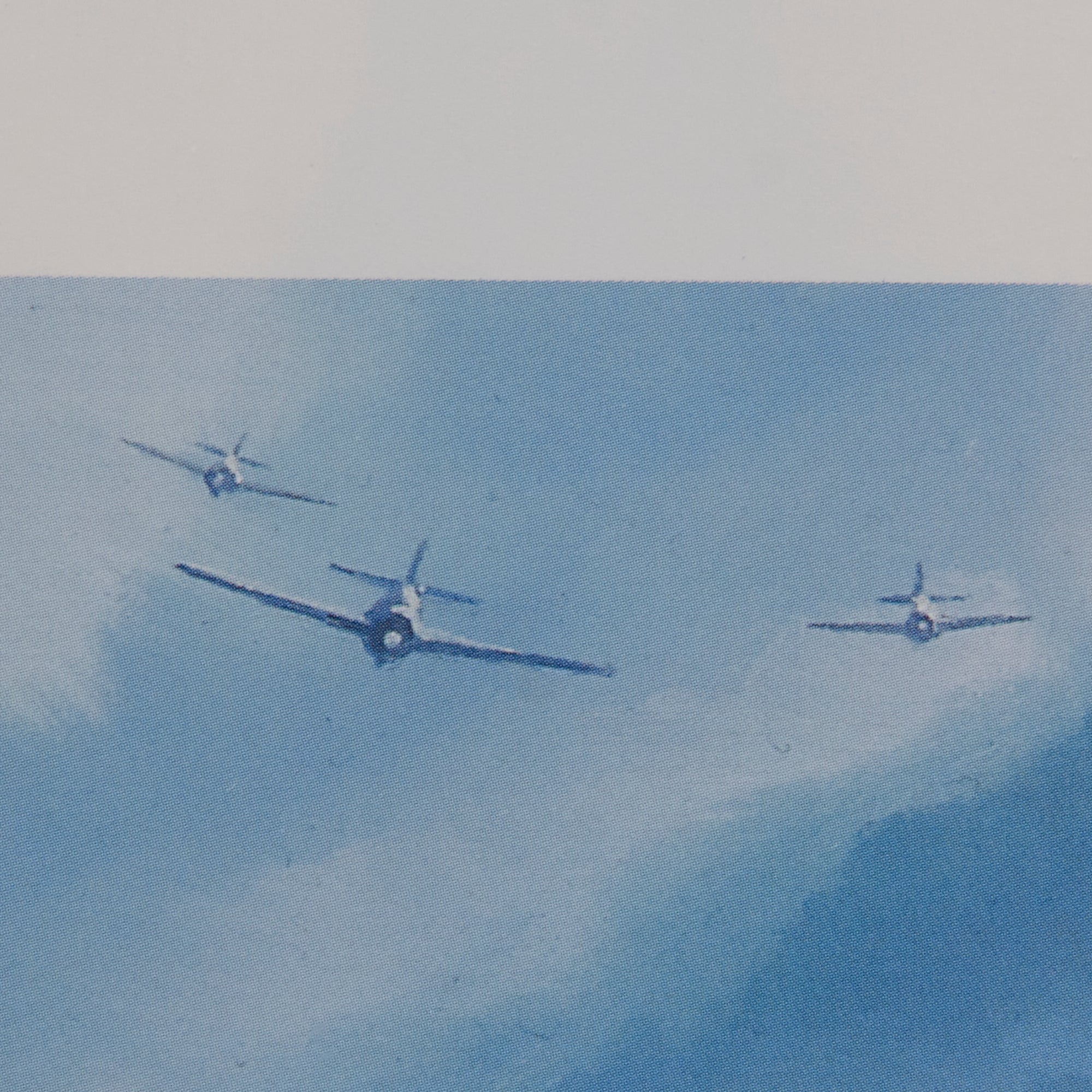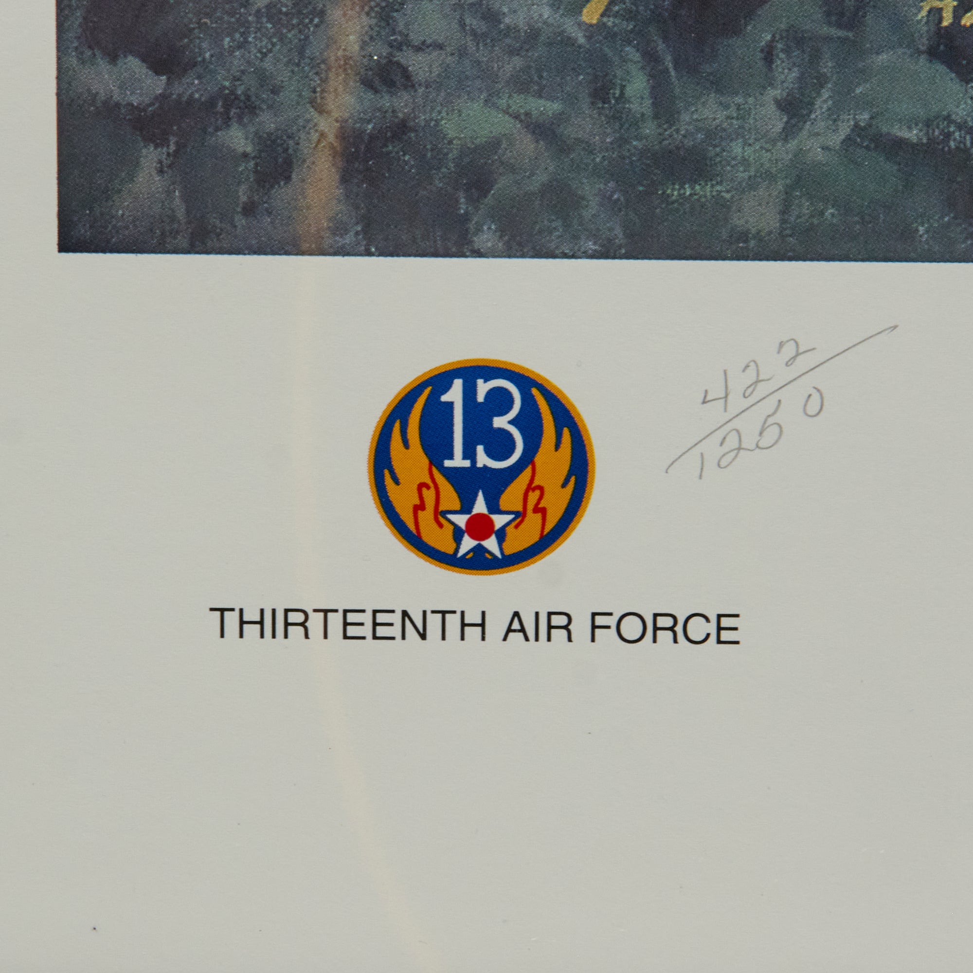 Original Item. Only One Available. This is a signed American Fighter Aces Series 2 print of “Mission Accomplished” by Roy Grinnell, signed at the bottom by Nine Pilots Who Flew on the Yamamoto Mission. The frame is well-put together and the print is very clear. This is a limited run print, number 422 out of 1250.