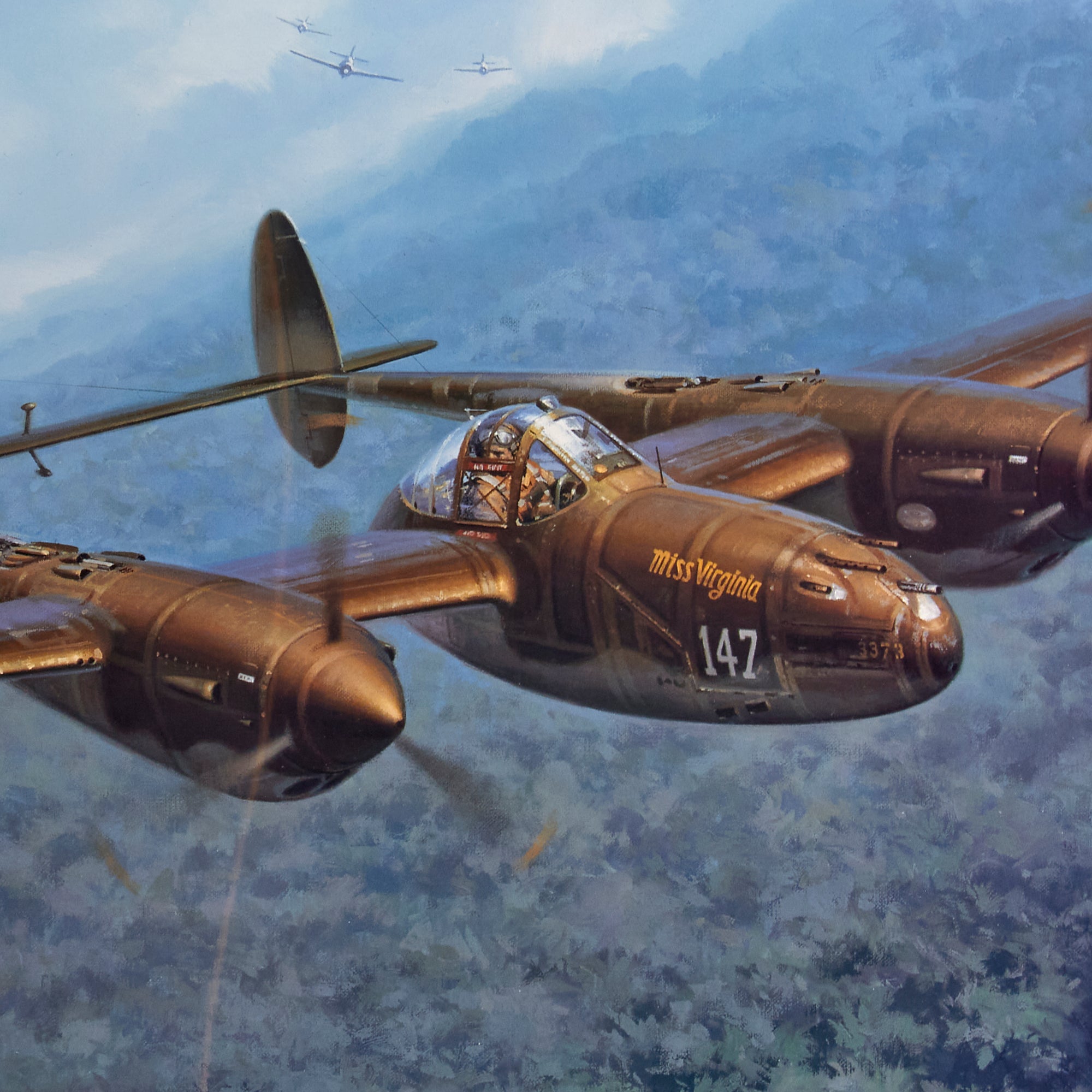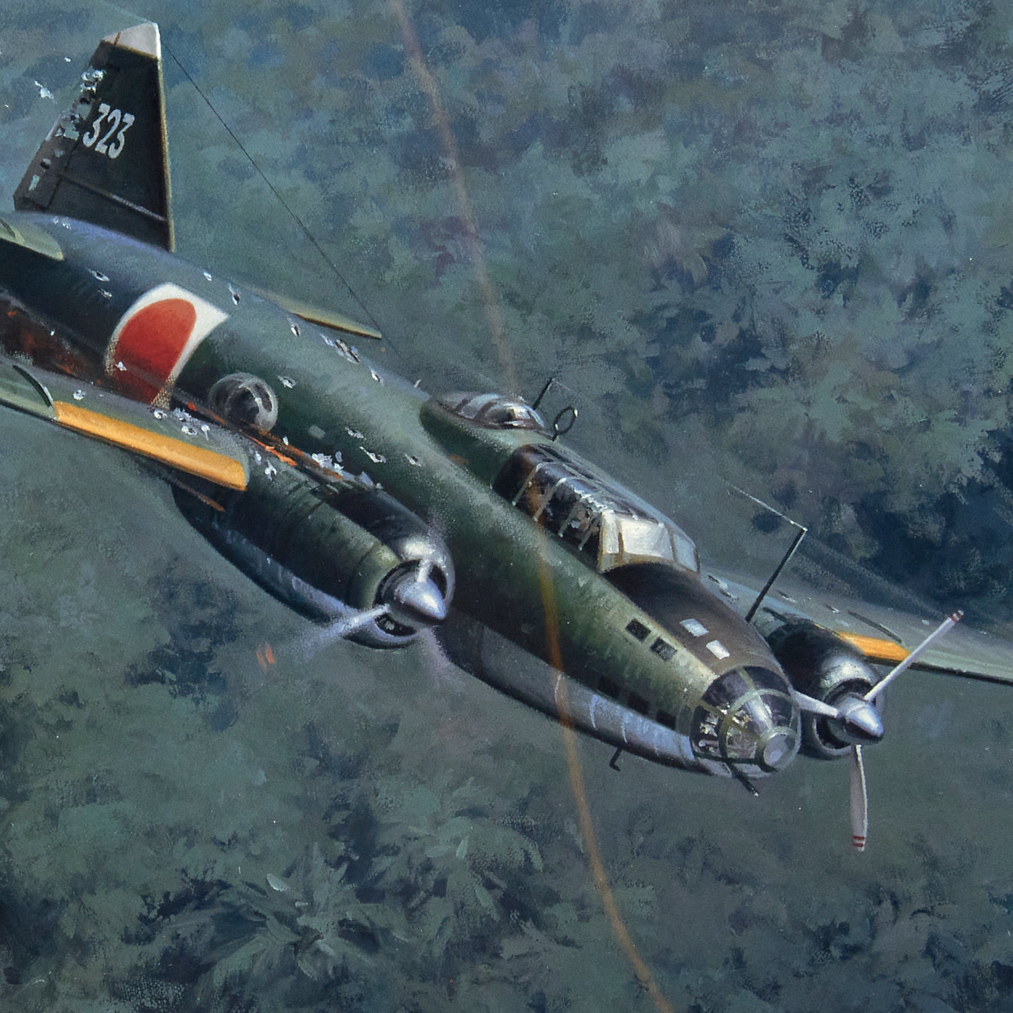 Maj. Mitchell and twelve Lightnings climbed to provide high cover while Capt. Tom Lanphier and Lts. Rex Barber, Frank Holmes and Ray Hine, the designated “attack flight,” turned to intercept the bombers. As they climbed toward the Bettys, Lanphier saw three Zeroes diving to defend the bombers and turned sharply into the lead fighter, leaving Barber to continue the attack on the bomber.