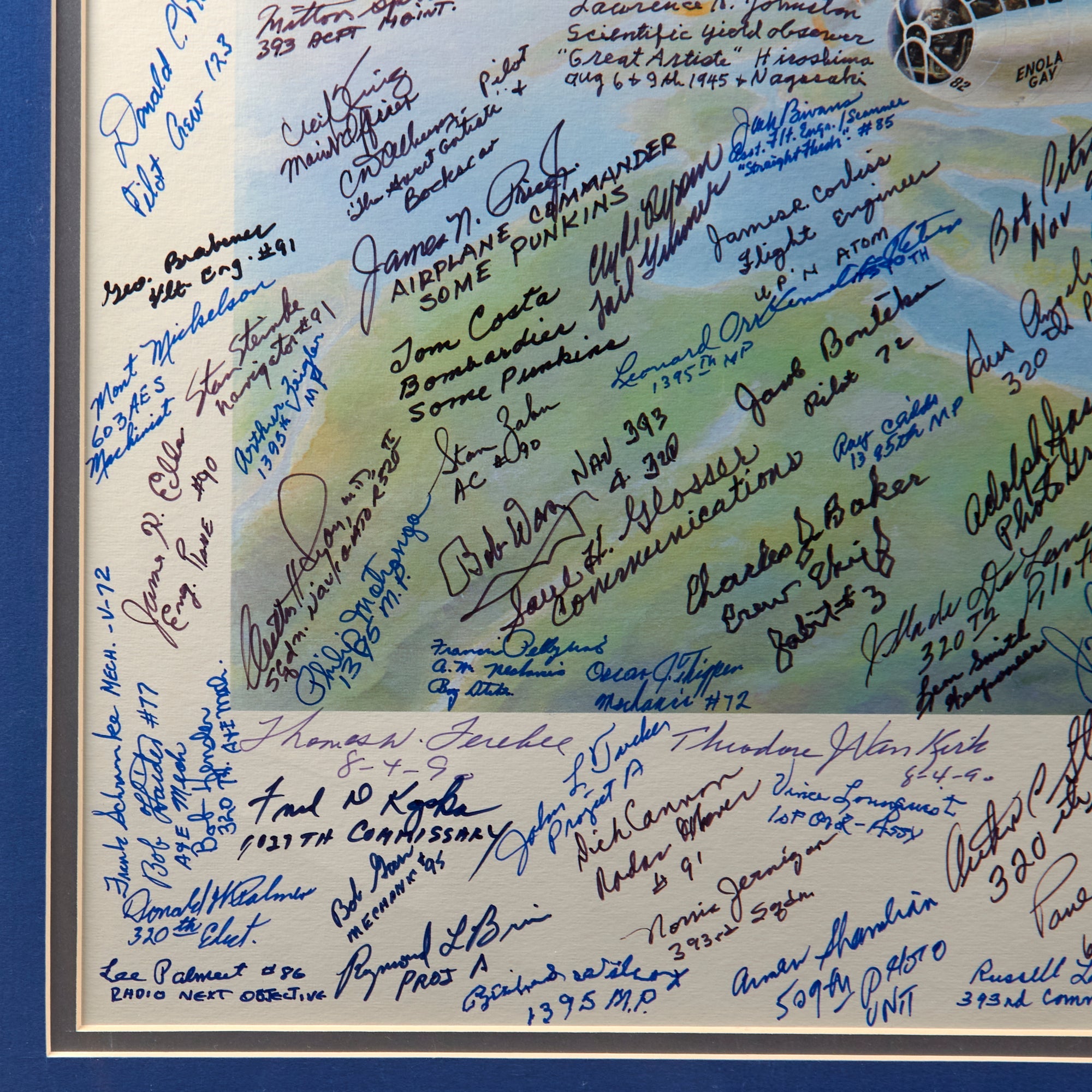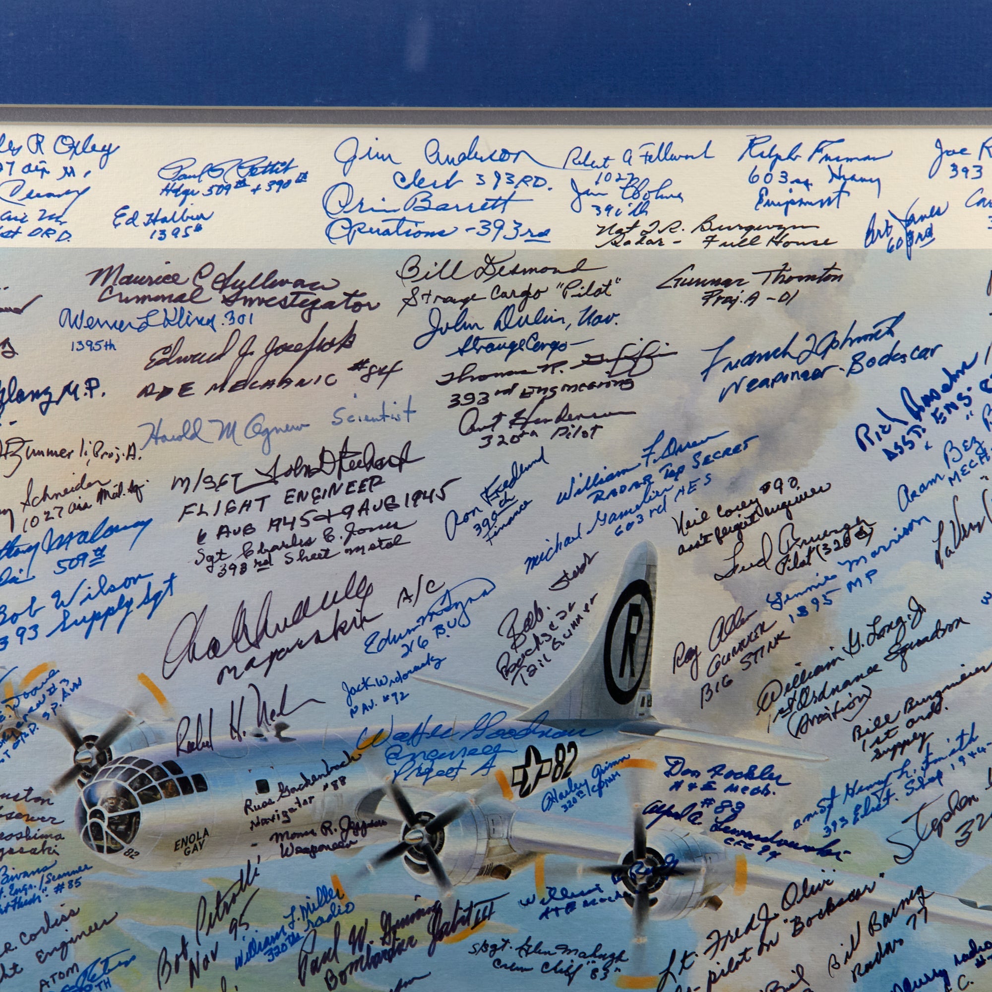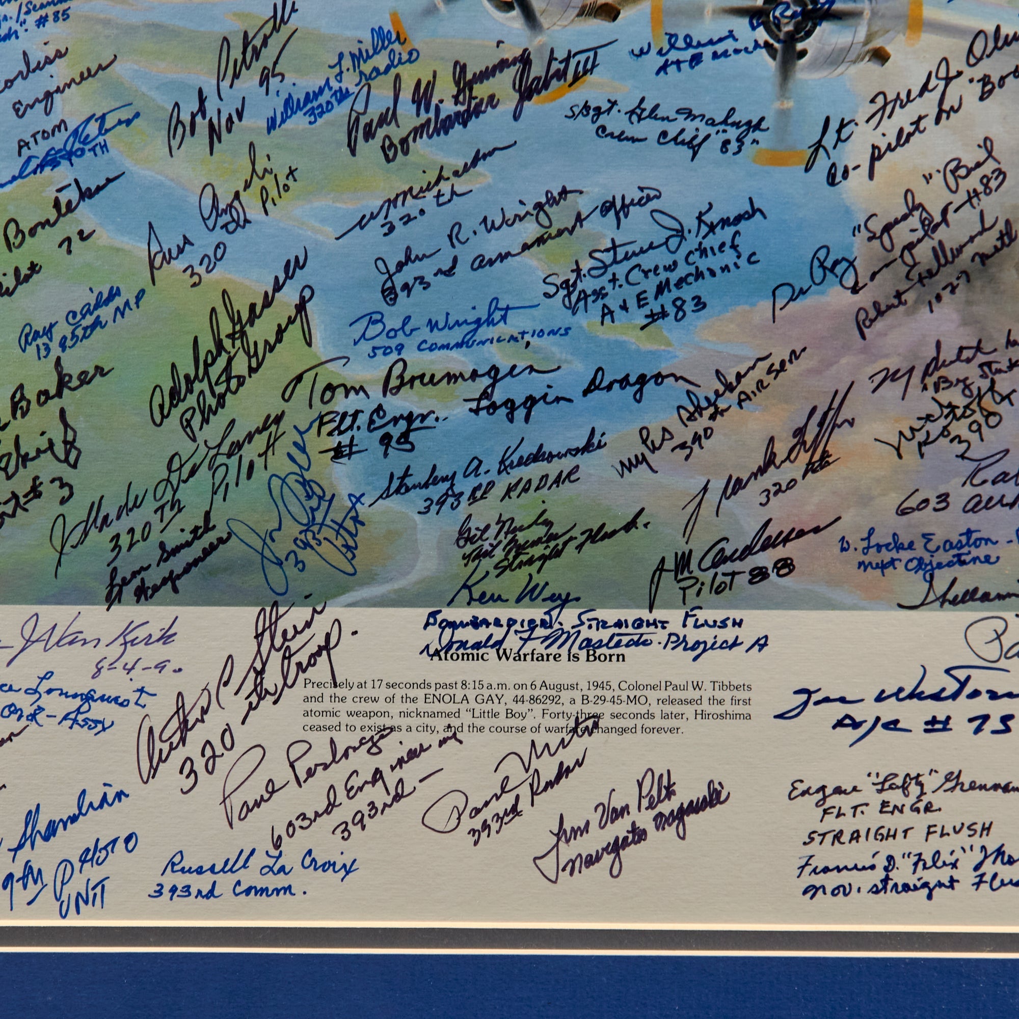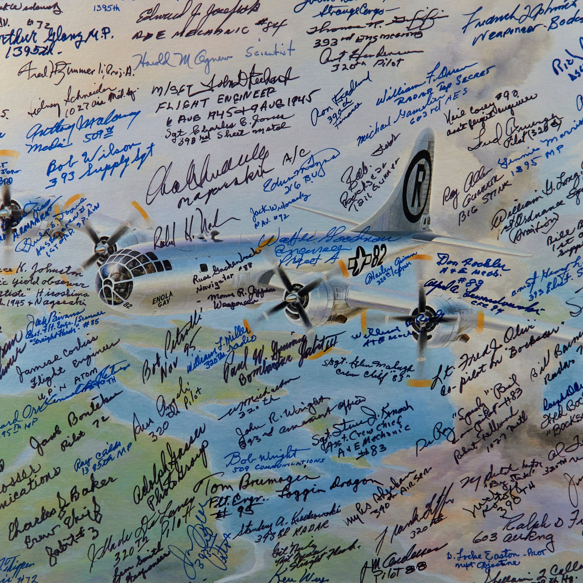 The print was originally issued with the signatures of Enola Gay crew members Paul Tibbets, Thomas Ferebee, and Theodore Van Kirk. The owner then likely took the print to reunions, military shows, and other events, having nearly 200 more men sign the print. These include members of the 393rd Bomb Squadron, the 320th Troop Carrier Squadron, the 390th Air Service Group, the 1027th Air Materiel Squadron, the 603rd Air Engineering Squadron, the 1395th Military Police Company, and the 1st Ordnance Squadron, Special (Aviation).