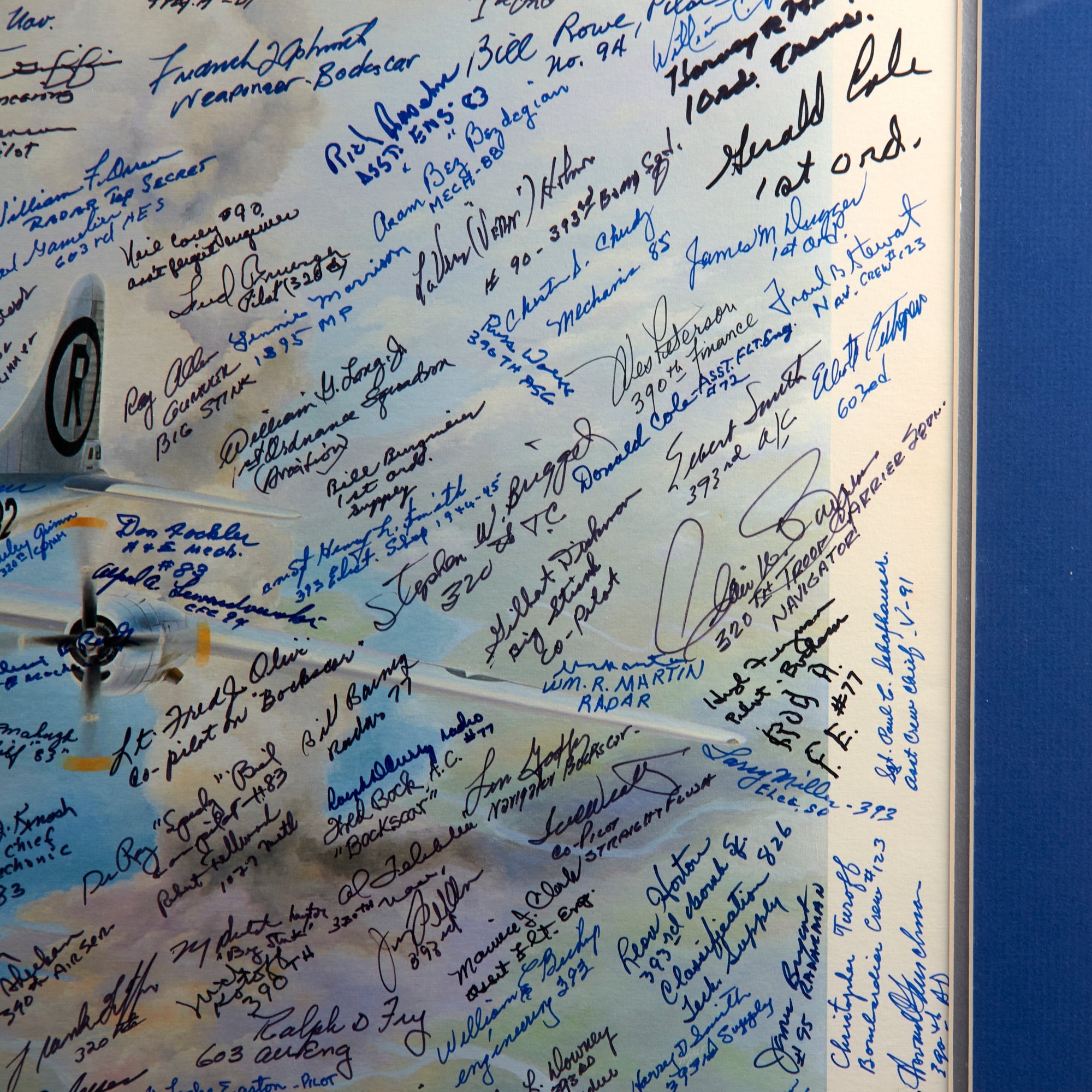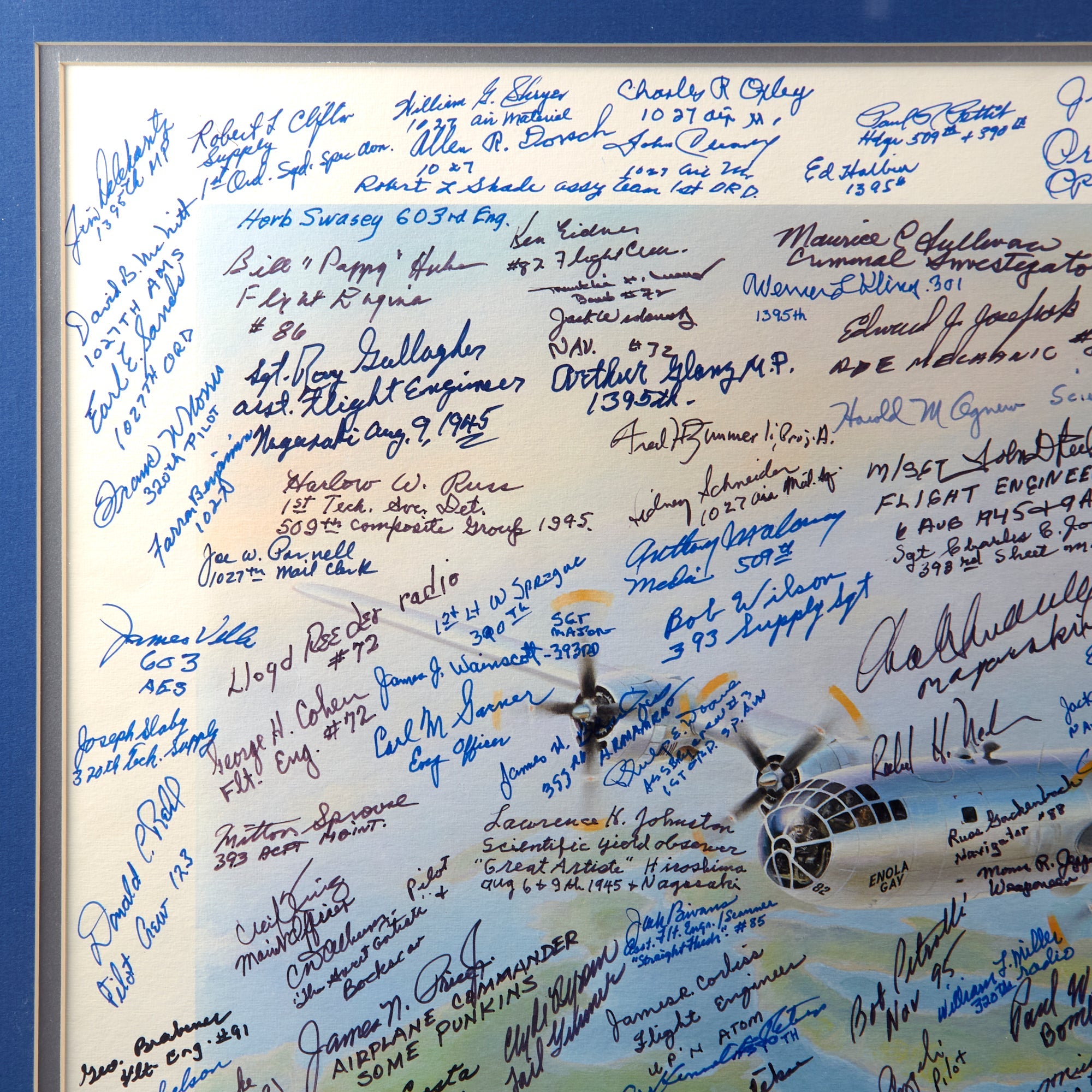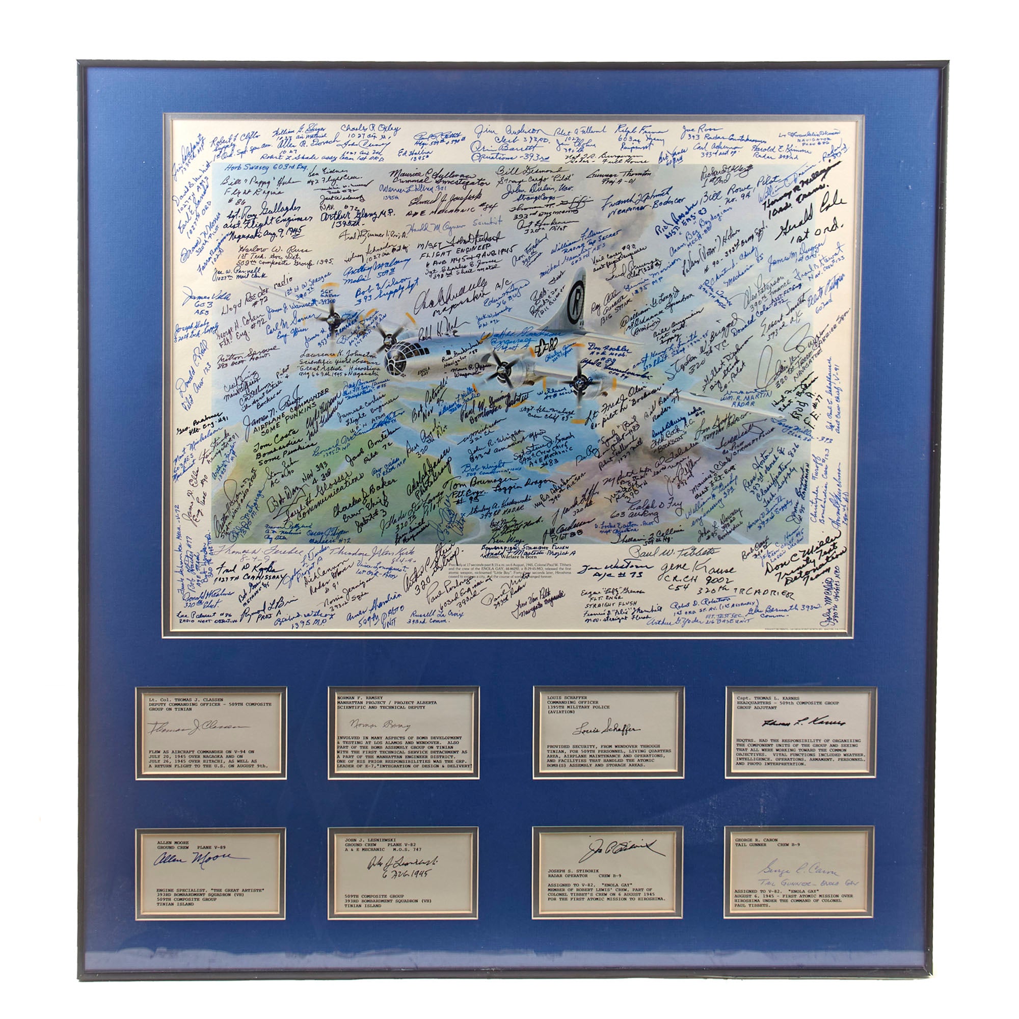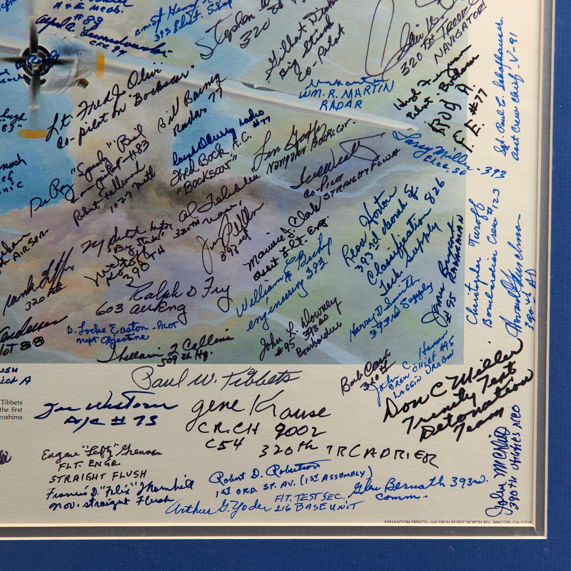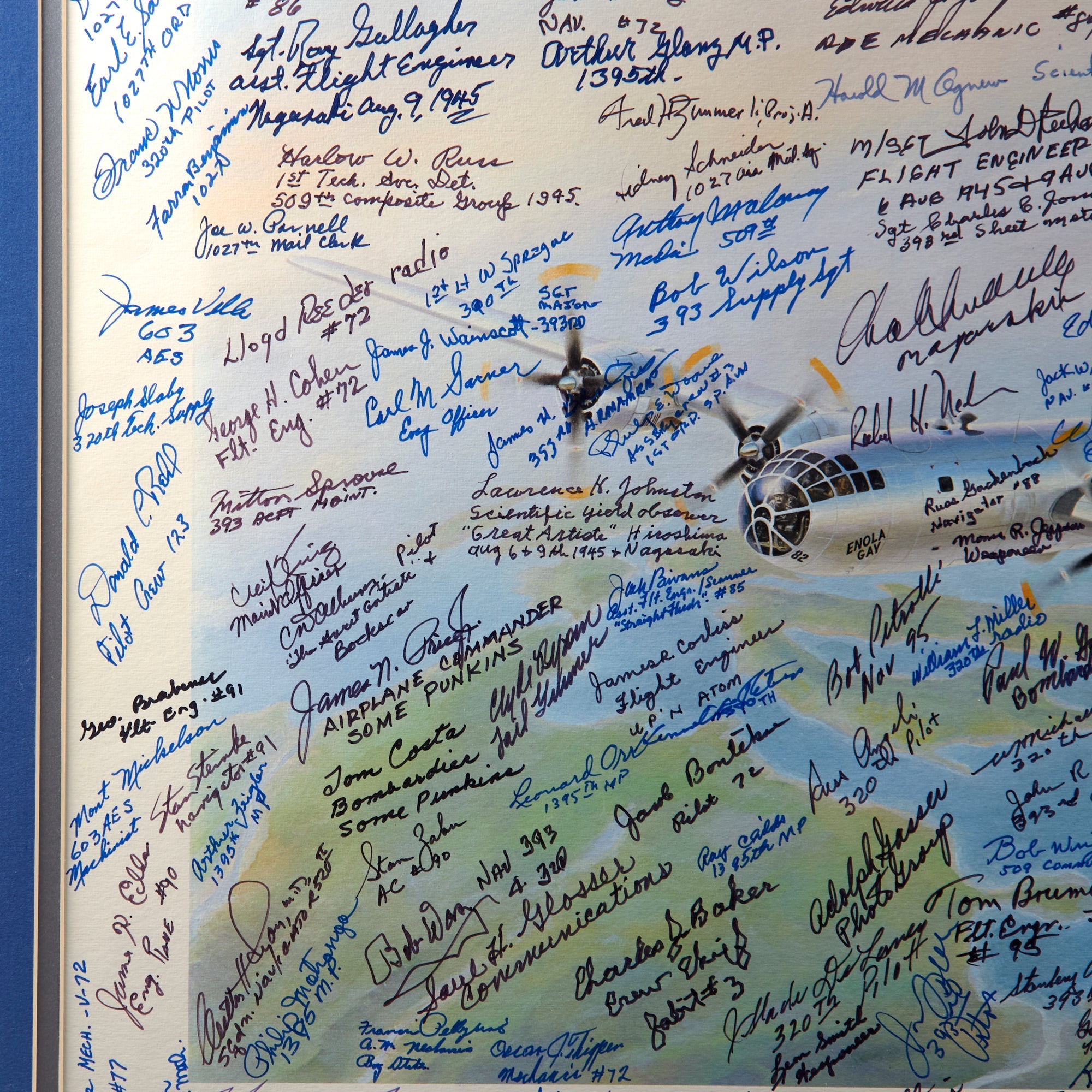 The print was originally issued with the signatures of Enola Gay crew members Paul Tibbets, Thomas Ferebee, and Theodore Van Kirk. The owner then likely took the print to reunions, military shows, and other events, having nearly 200 more men sign the print. These include members of the 393rd Bomb Squadron, the 320th Troop Carrier Squadron, the 390th Air Service Group, the 1027th Air Materiel Squadron, the 603rd Air Engineering Squadron, the 1395th Military Police Company, and the 1st Ordnance Squadron, Special (Aviation).