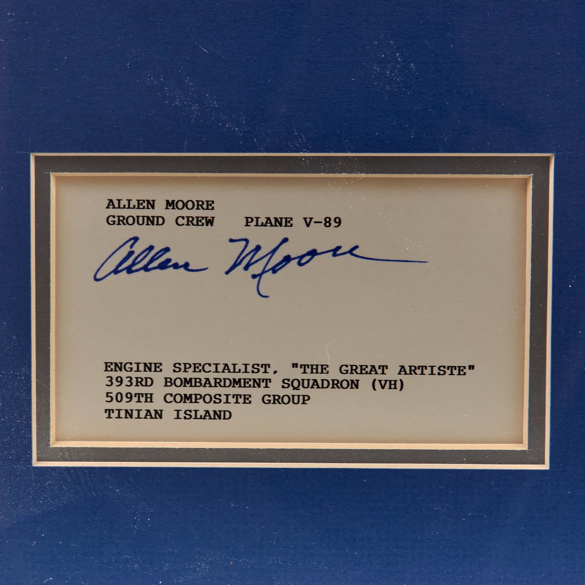 - Allen Moore, Ground Crew, Plane V-89, Engine Specialist “The Great Artiste”.