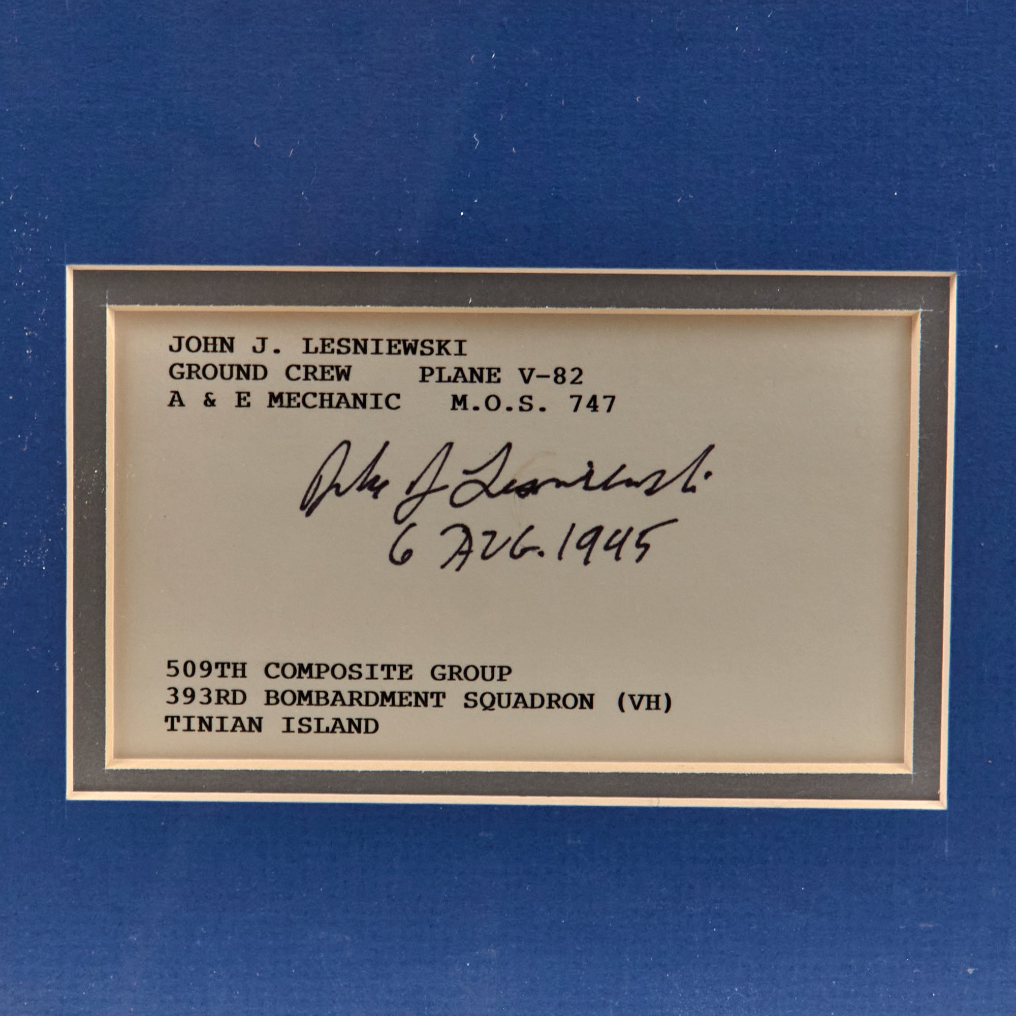 - John J. Lesniewski, Ground Crew, Plane V-82, A&E Mechanic M.O.S. 747, 393rd BS, 509th Composite Group.