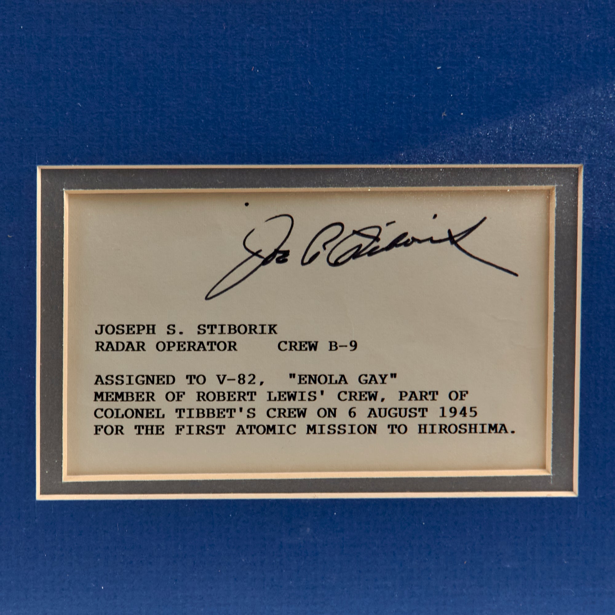 - Joseph S. Stiborik, Radar Operator, Crew B-9, Assigned to V-82 “Enola Gay”. Was on the Enola Gay on August 6th, 1945.
