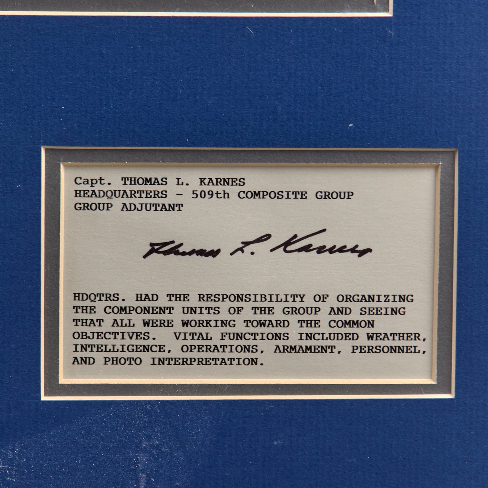 - Captain Thomas L. Karnes, Headquarters, 509th Composite Group, Group Adjutant.