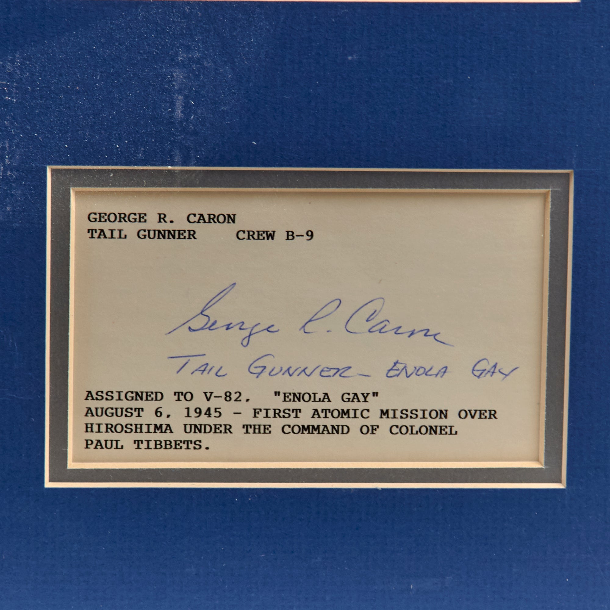 - George R. Caron, Tail Gunner, Crew B-9. Assigned to V-82 “Enola Gay”. Was on the Enola Gay on August 6th, 1945.