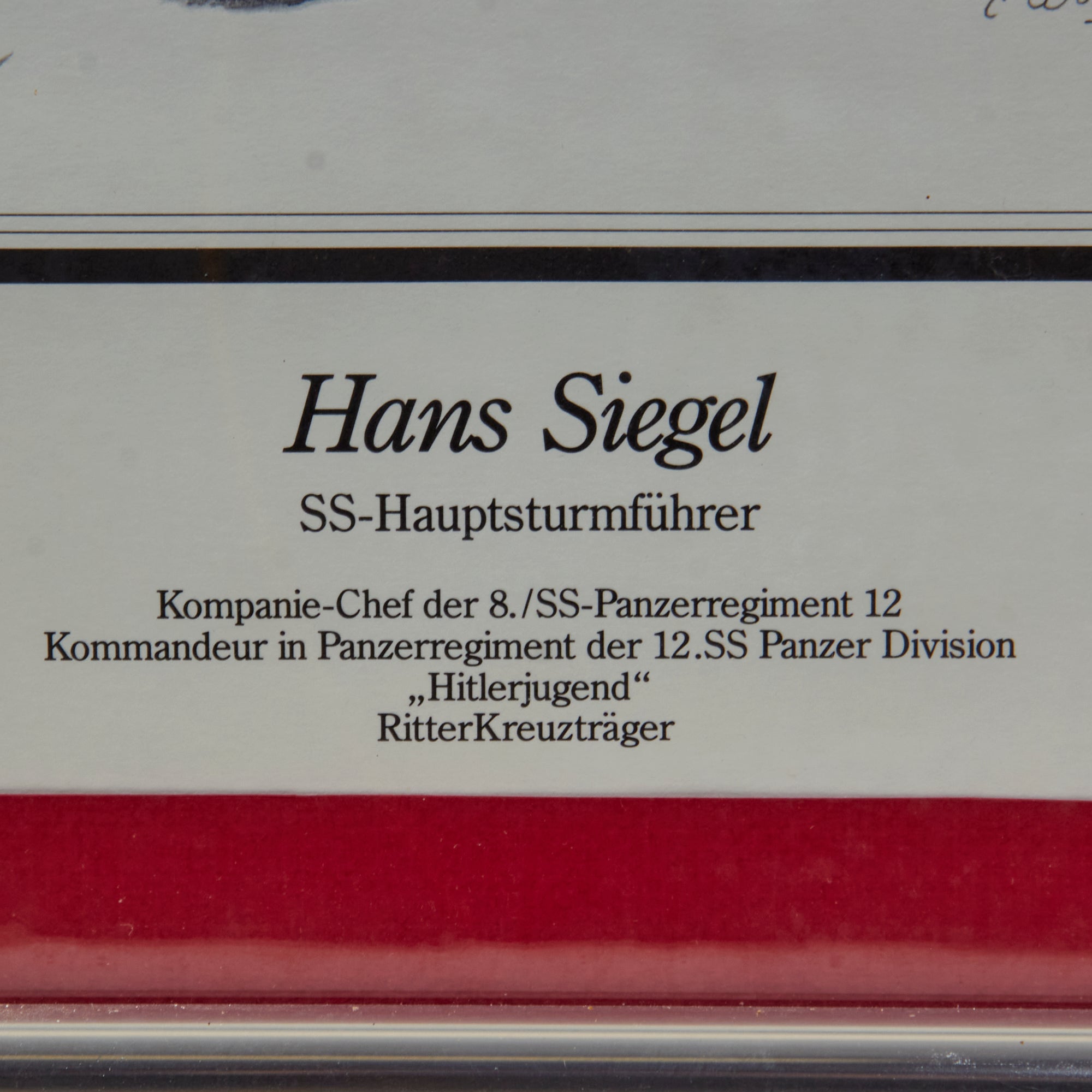Original Item. Only One Available. Siegfried "Hans" Siegel (25 July 1918 — 18 April 2002) was a Sturmbannführer (Major) in the Waffen-SS during World War II. He received the Knight's Cross of the Iron Cross, which was awarded to recognize extreme battlefield bravery or successful military leadership.