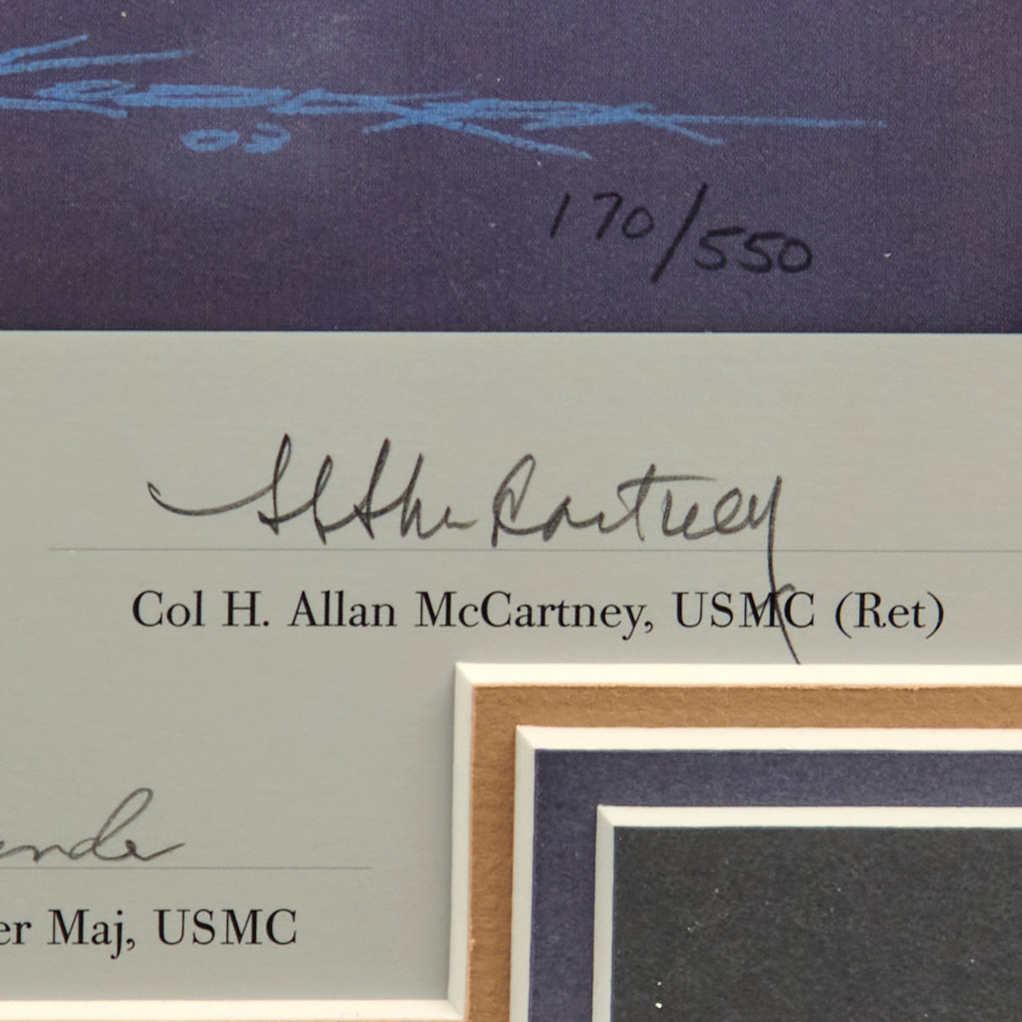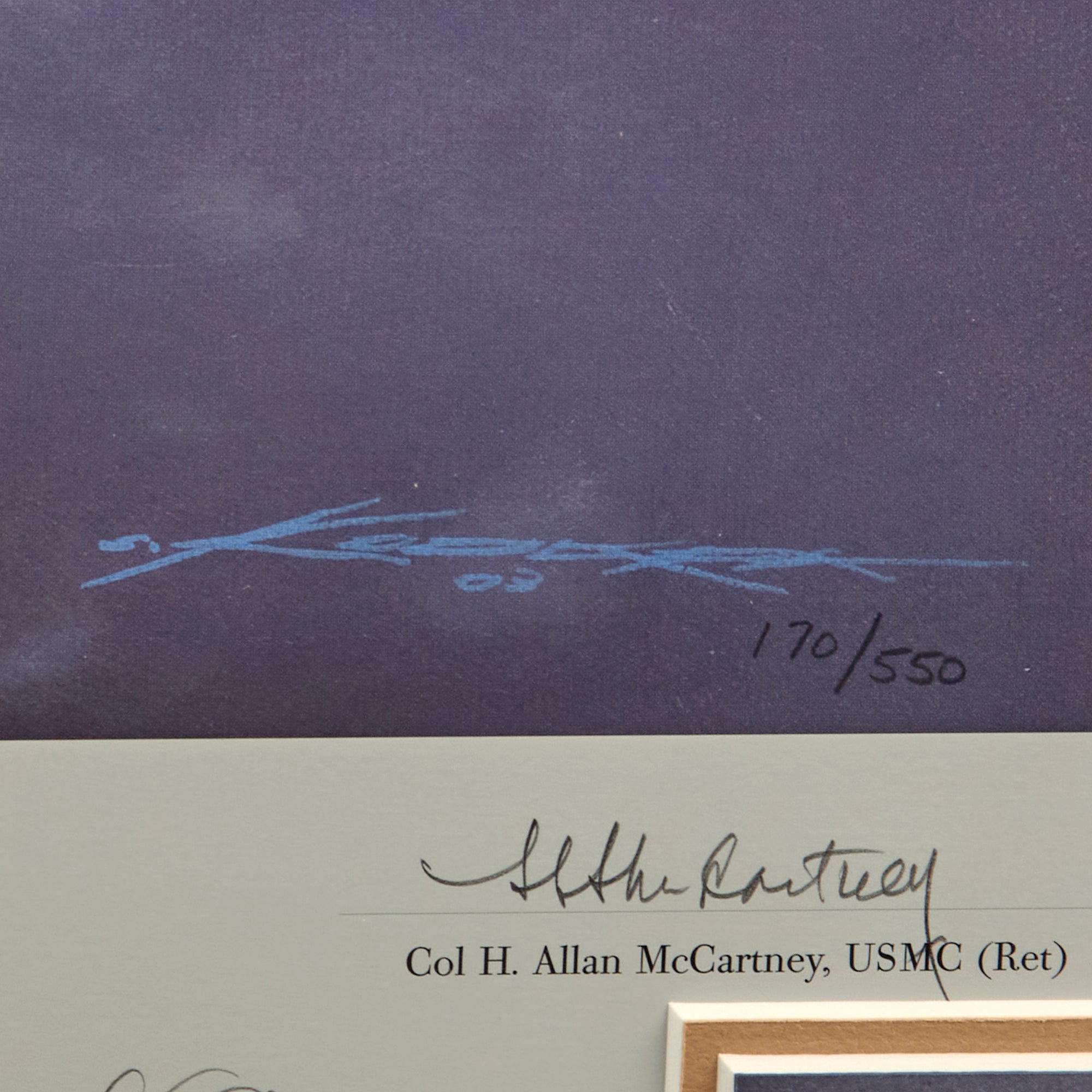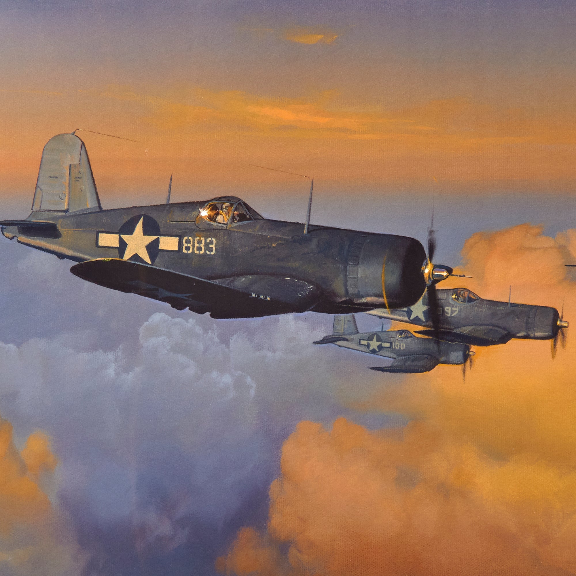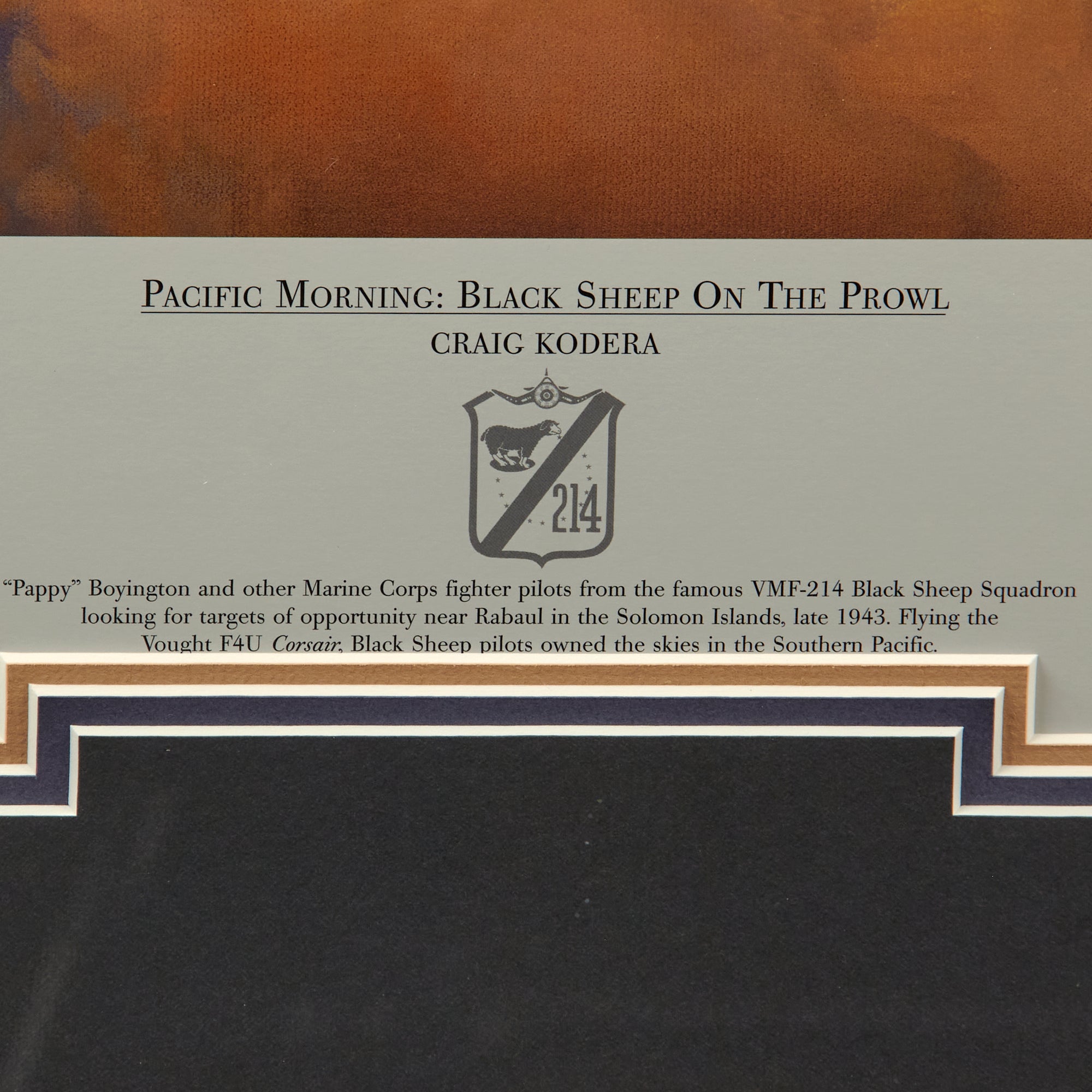 Original Item. Only One Available. This is a signed print of “Pacific Morning: Black Sheep On The Prowl” by Craig Kodera, signed at the bottom by five Marine Fighter Pilots from the famous VMF-214 Black Sheep Squadron. The print is limited edition, numbered 170/550.