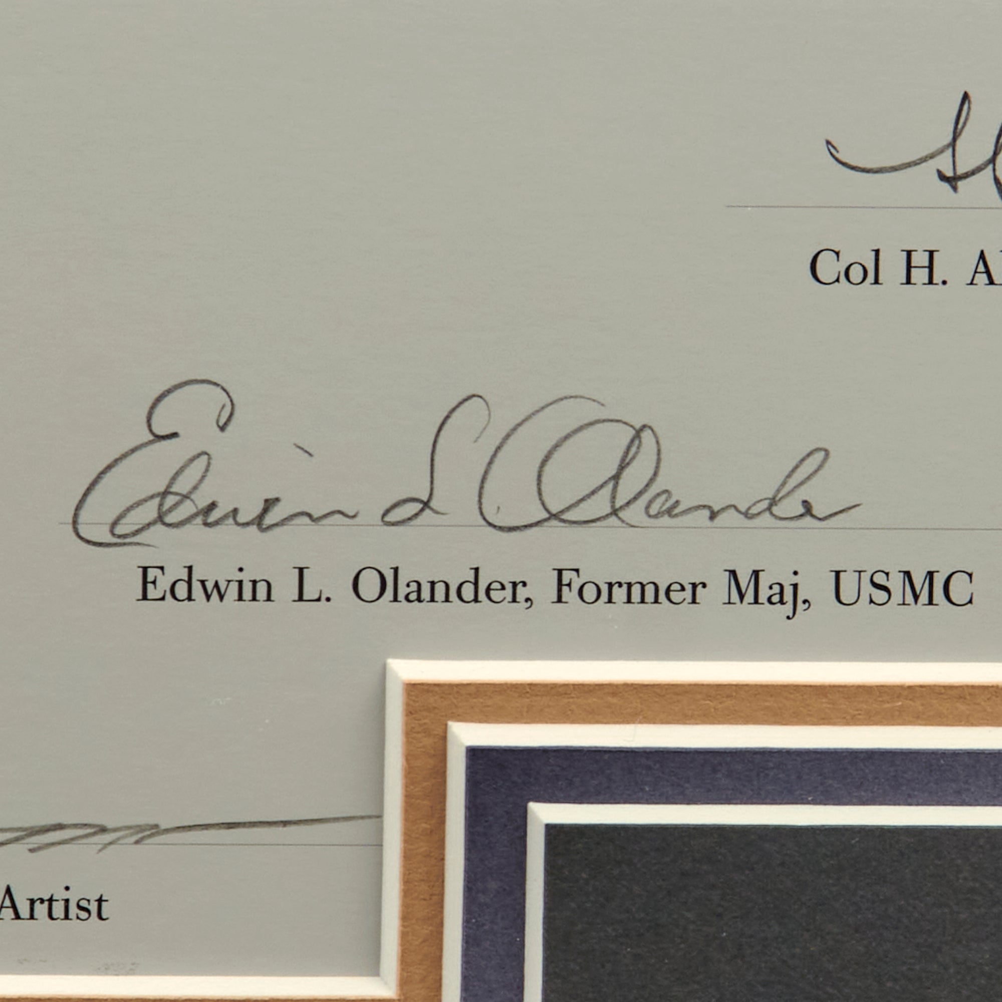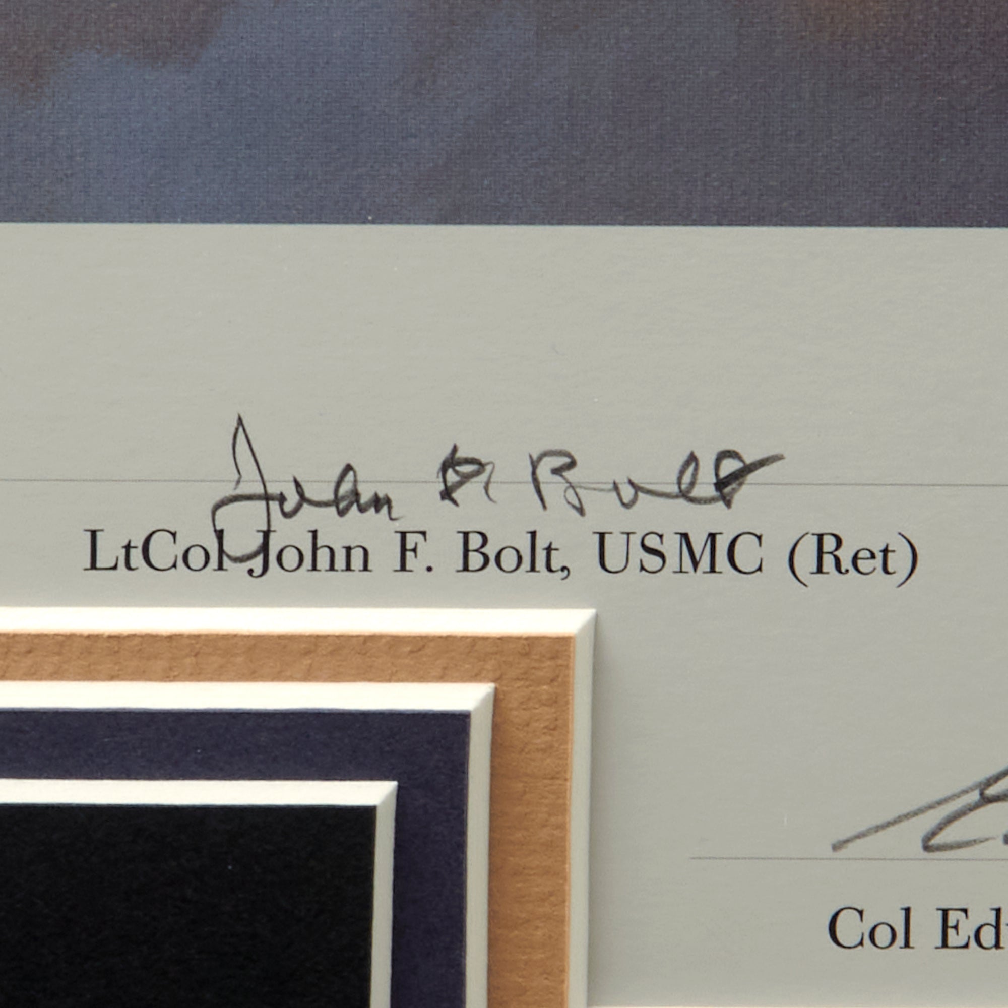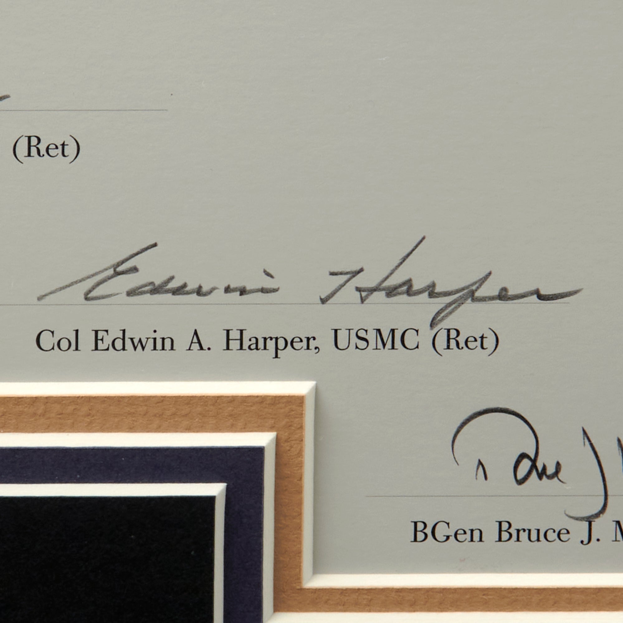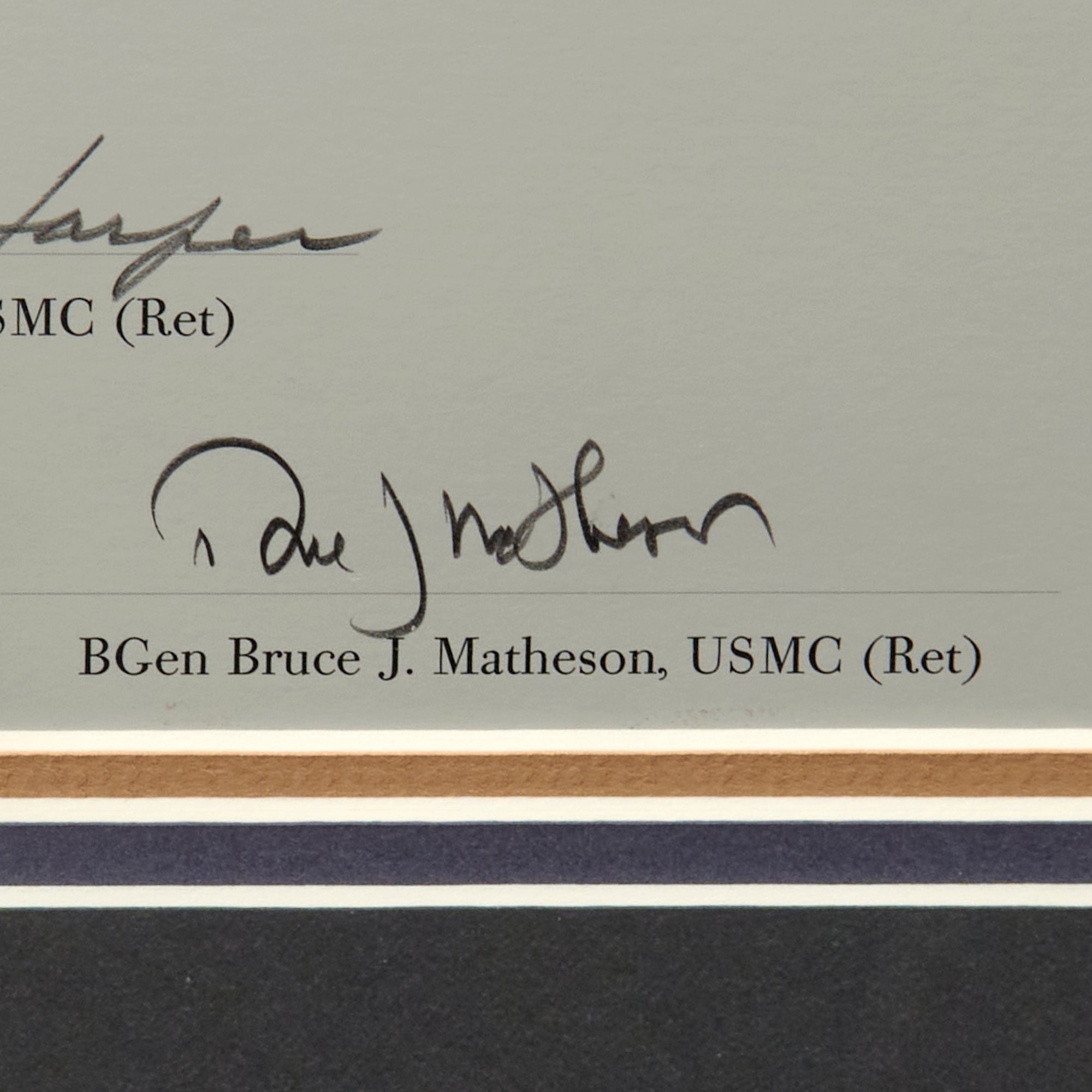 The signers include the VMF-214 Black Sheep Squadron Pilots: Lt Col John F. Bolt, USMC (Ret), Col Edwin A. Harper, USMC (Ret), BGen Bruce J. Matheson, USMC (Ret), Col H. Allan McCartney, and USMC (Ret), Edwin L. Olander.