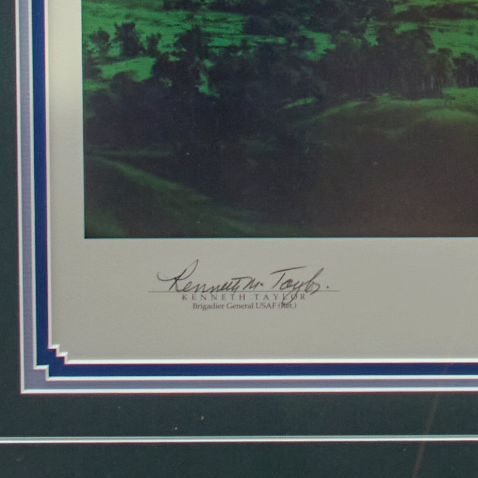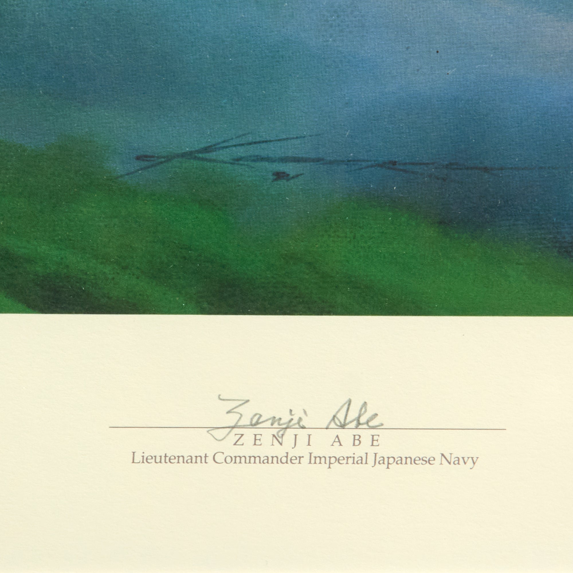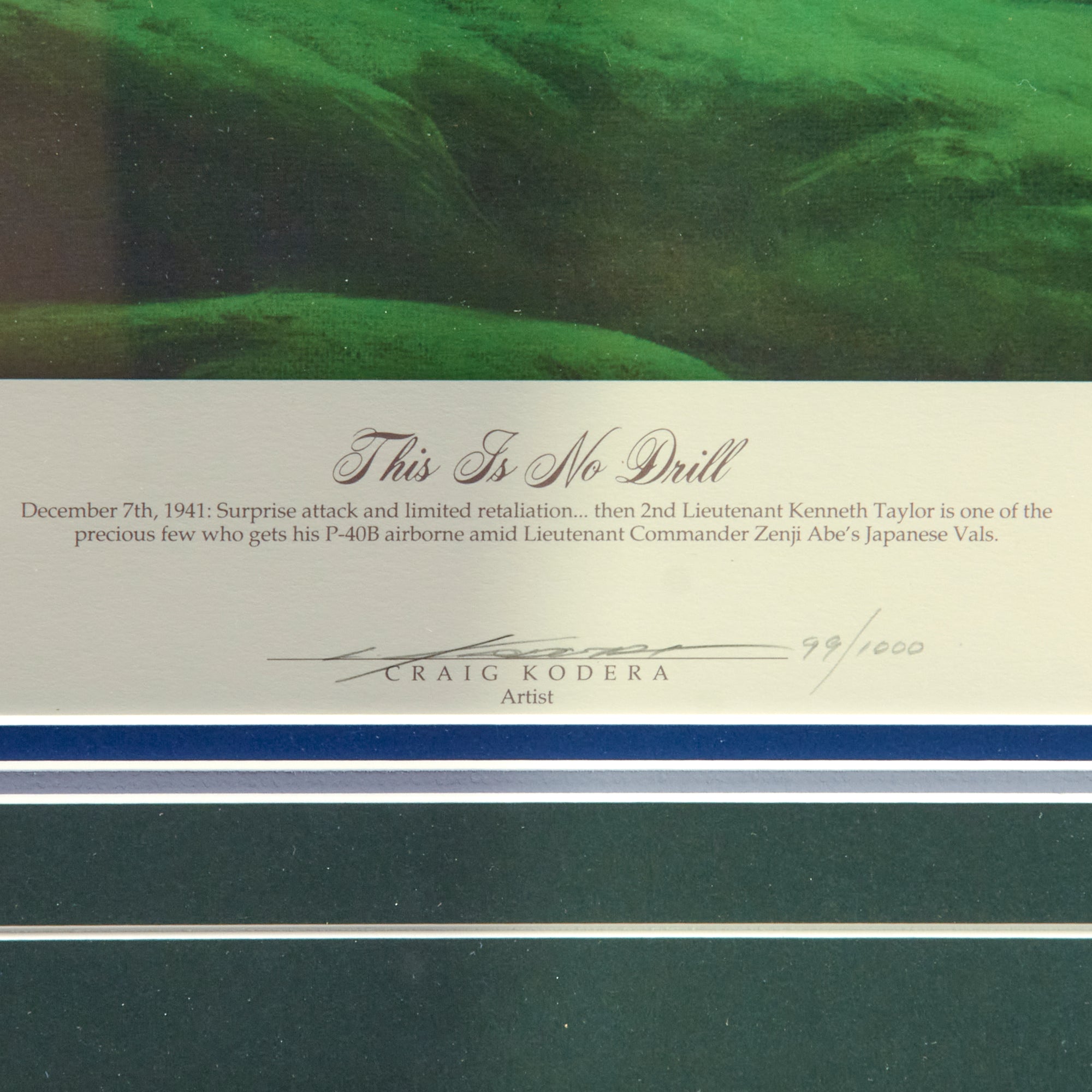 Original Item. Only One Available. This is a signed print of “This is No Drill” by Craig Kodera, signed at the bottom by Brigadier General Kenneth M. Taylor & Lieutenant Commander of the Imperial Japanese Navy, Zenji Abe. The frame is well-put together and the print is very clear. This is a limited run print, numbered 99/1000.