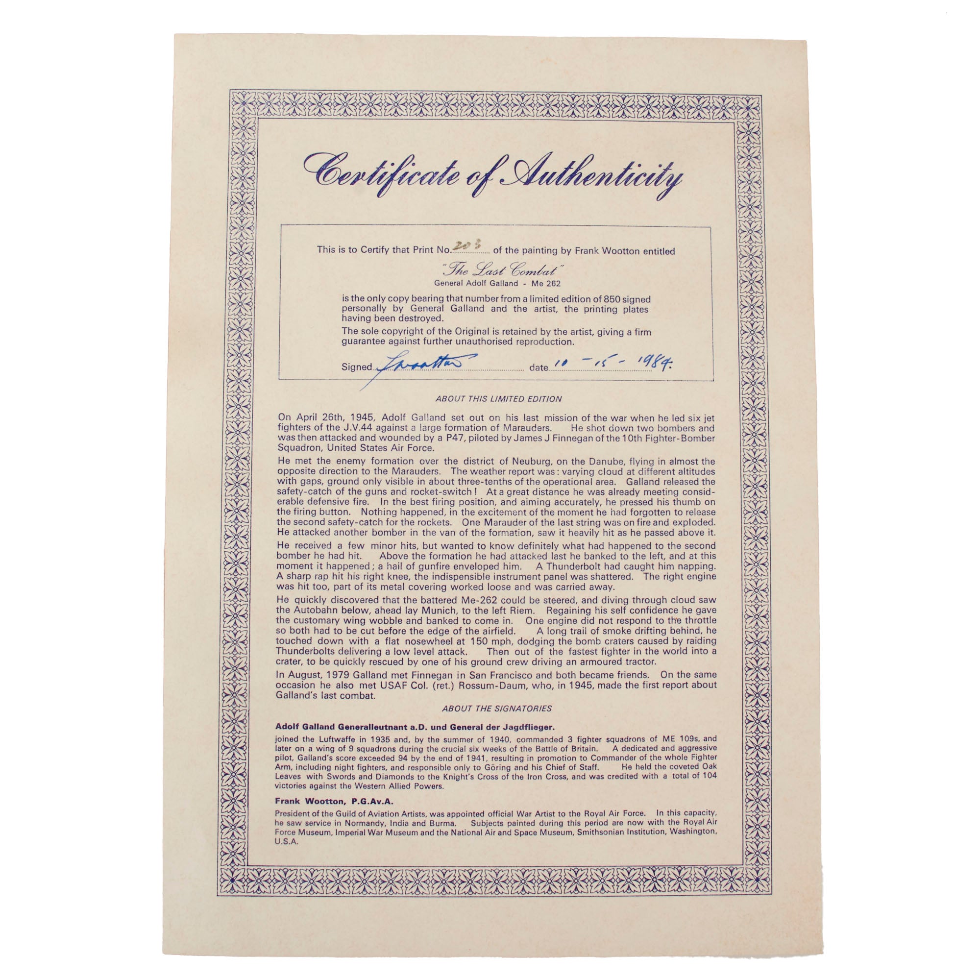 Original Item. Only One Available. This is a signed print of “The Last Combat” by Frank Wootton, signed at the bottom by Adolf Galland. Galland was one of Germany's most highly decorated fighter aces. This is a limited run print, number 203 out of 850.