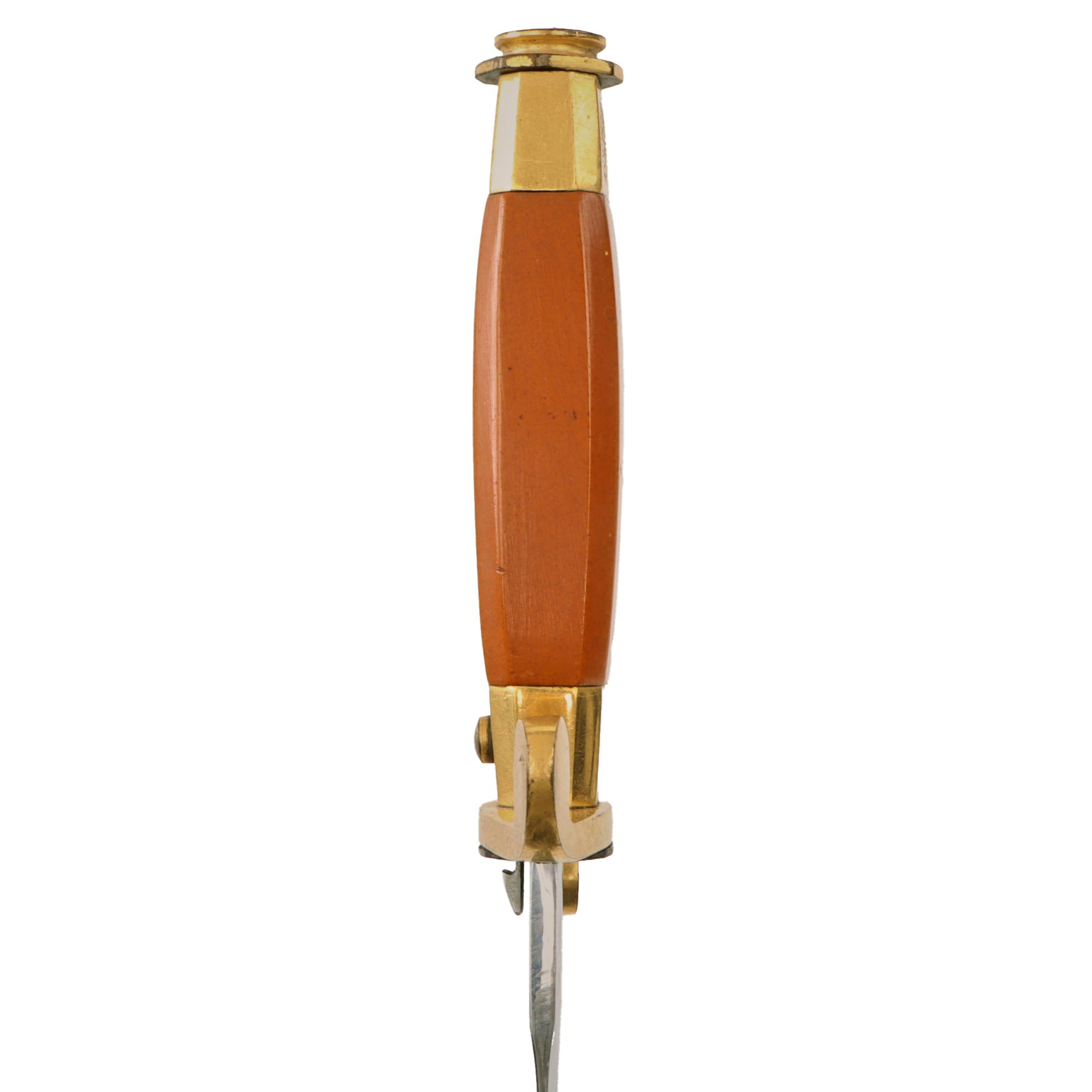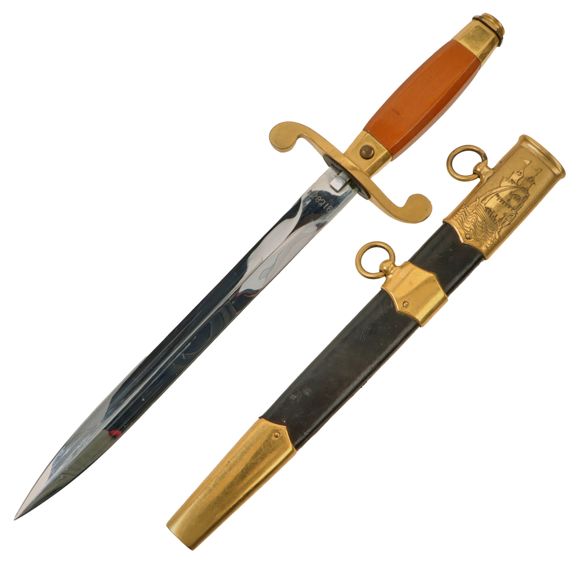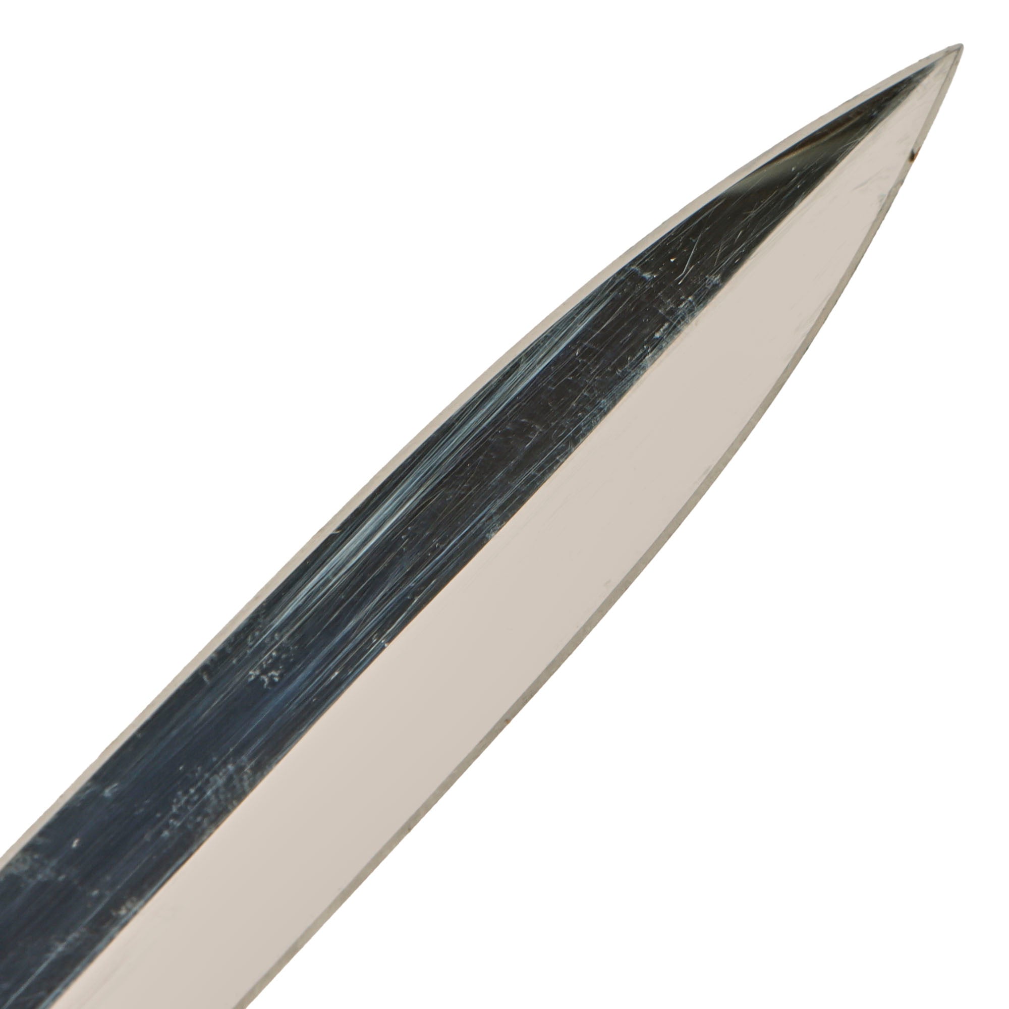The dagger is 12¼ inches long with a 8 3/8 inch double edged spear-point blade, a classic dagger design. The scabbard lock is fully functional, and the hilt fittings are mostly tight on the tang, as the grip looks to have shrunk a bit in the past several decades. The blade has some scratching and sharpening along the edges. There is some tarnishing to the finish on the brass fittings.