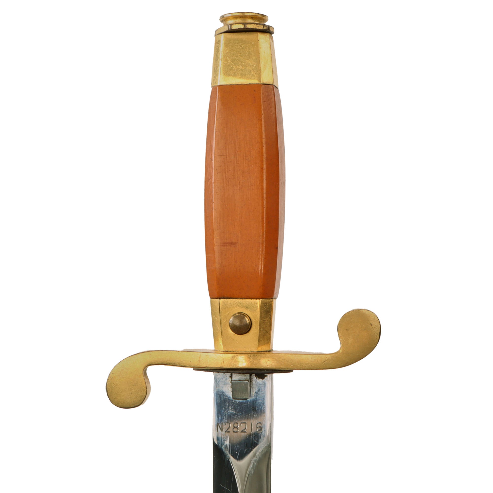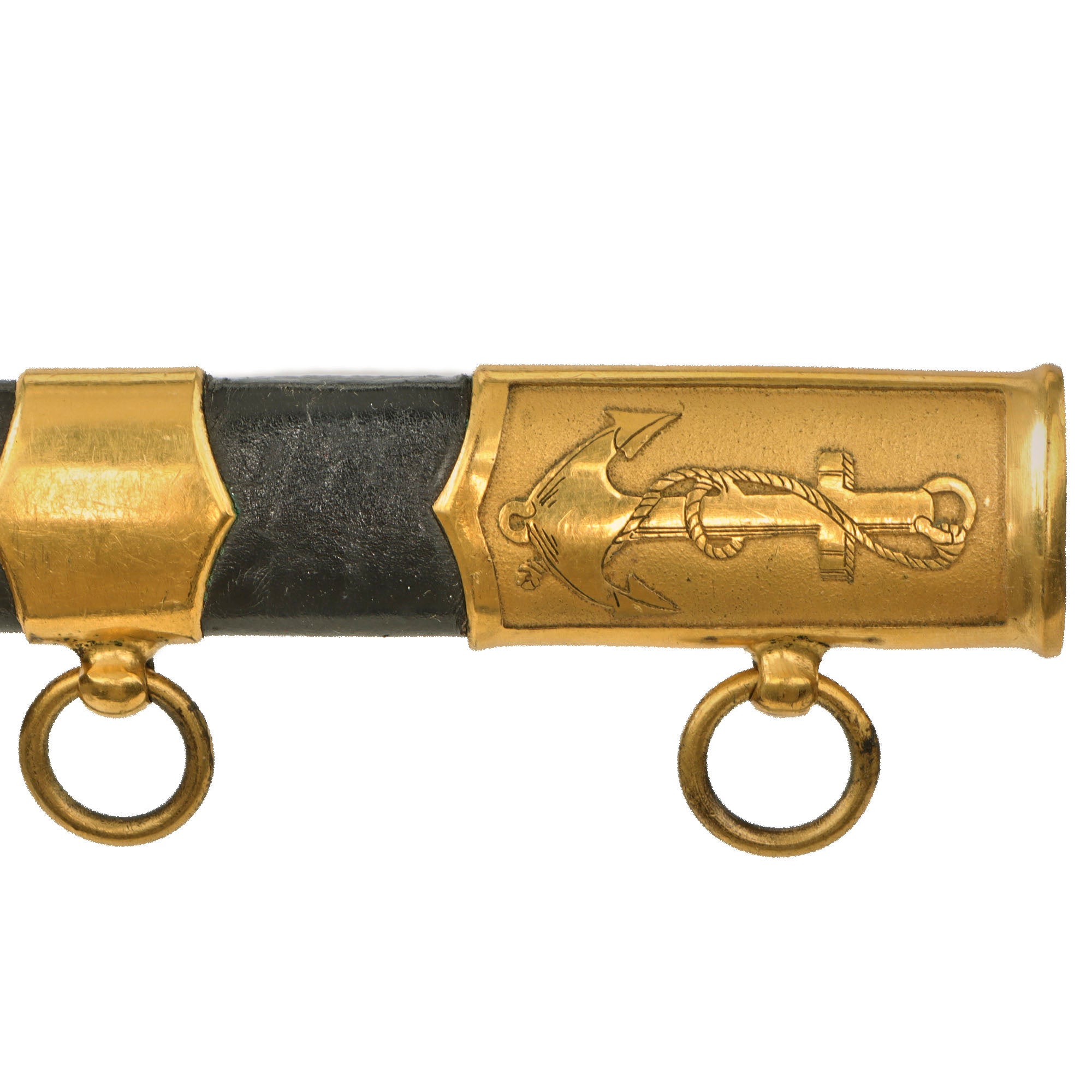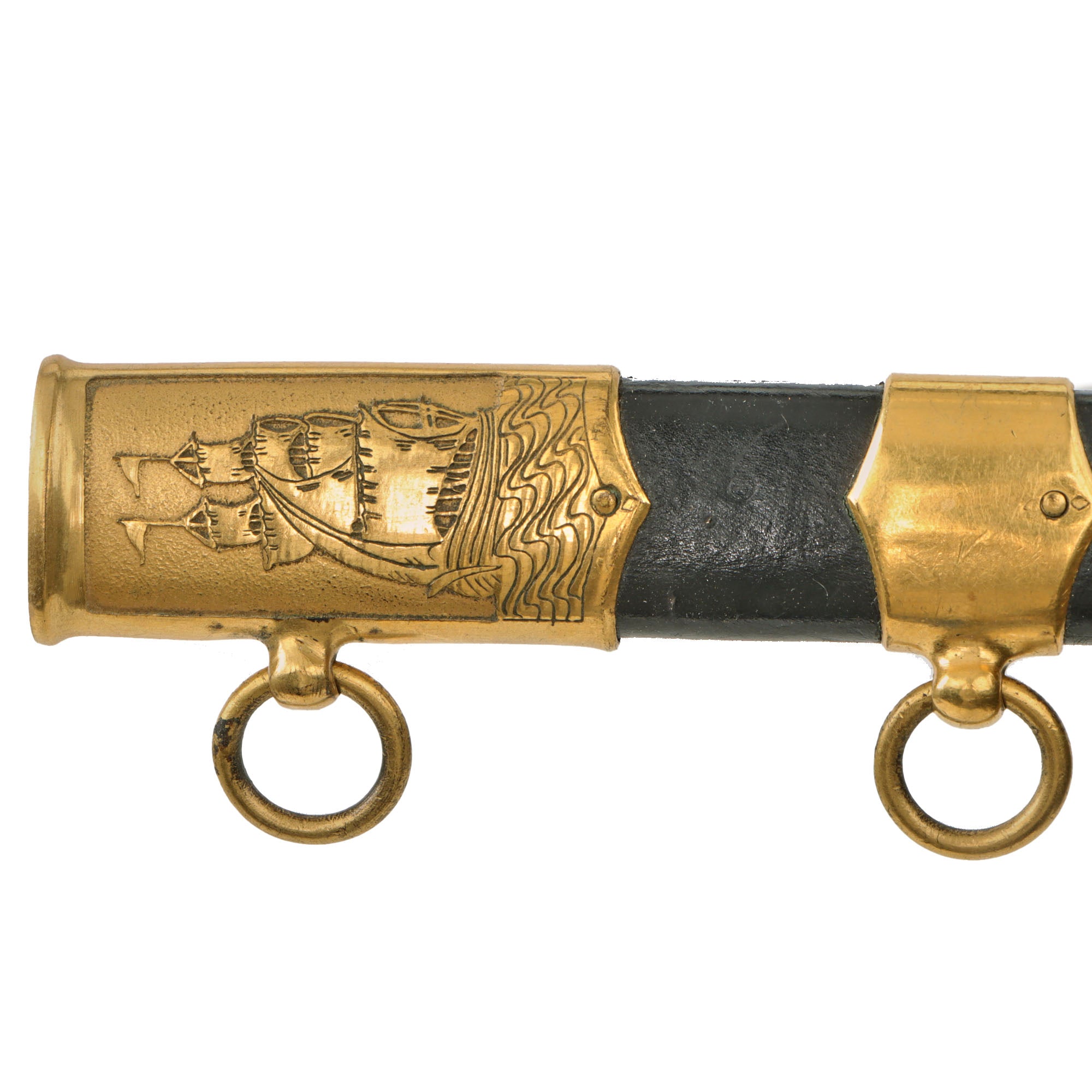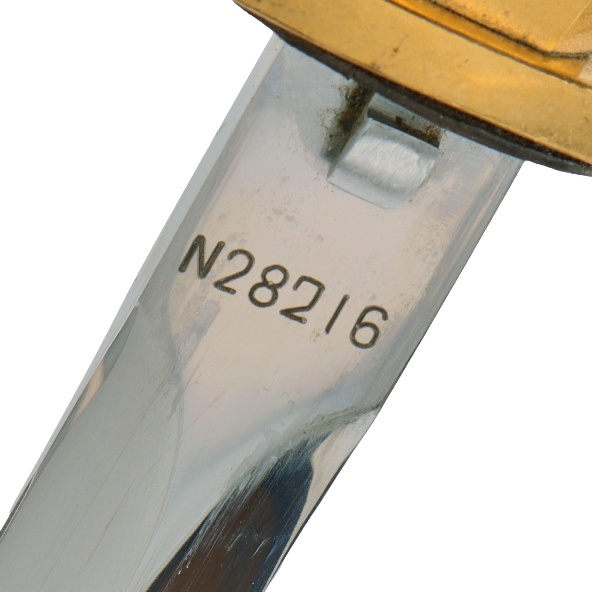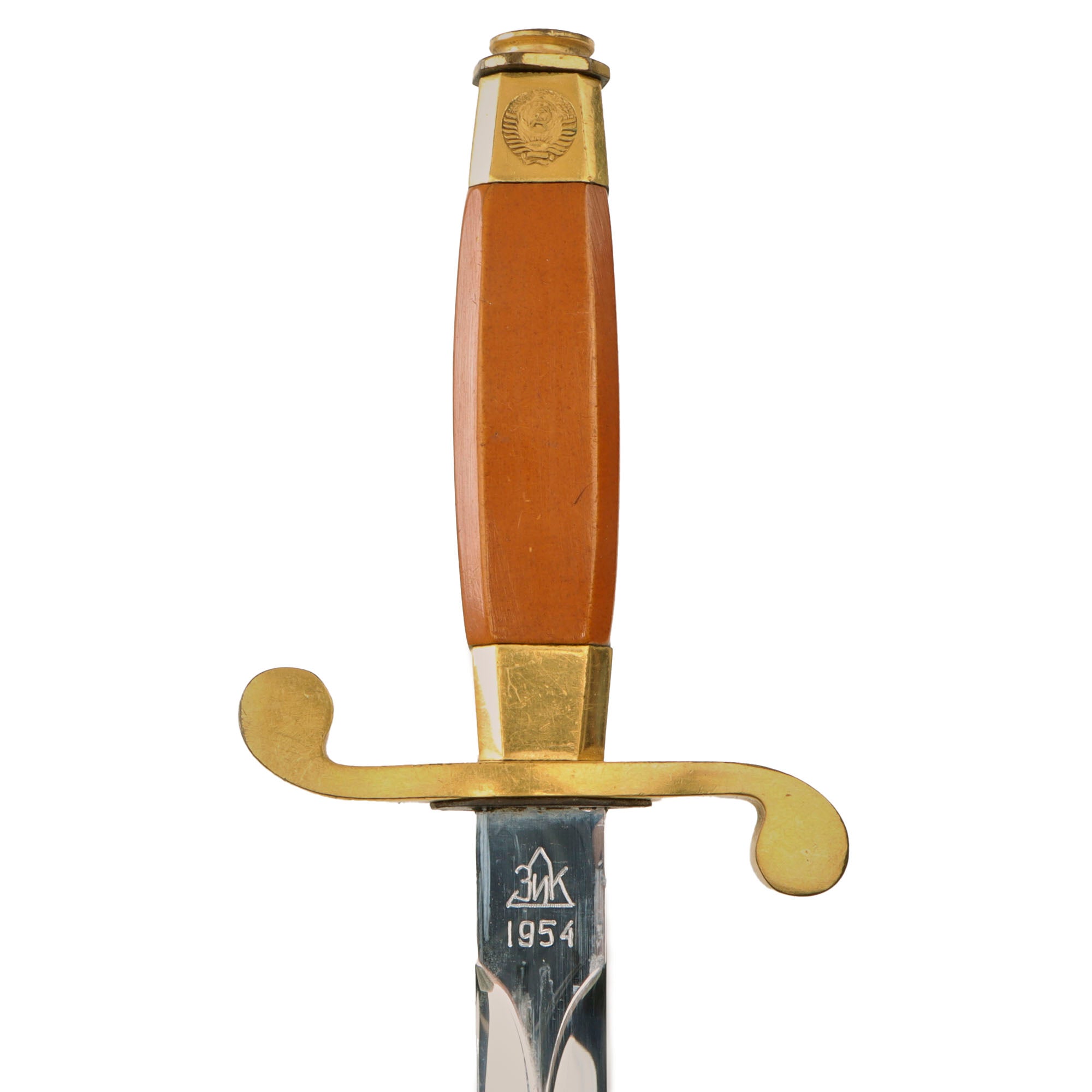 Original Item: Only One Available. This is a nice example of the traditional Soviet Union Naval Officer's Dagger, which has gilt brass alloy mounts and a nickel plated blade, in service-used condition. The blade ricasso is maker marked and dated in Cyrillic with 3NK / 1954 for a date of 1954, and has a serial number on the reverse: N28216. The grip of some sort of yellow orange ochre type synthetic bone. The pommel has a Soviet Star on the tip, and the USSR Emblem on the side. The brass mounted leather scabbard is engraved on the throat with a fouled anchor on one side, and a Man-o-War on the reverse.