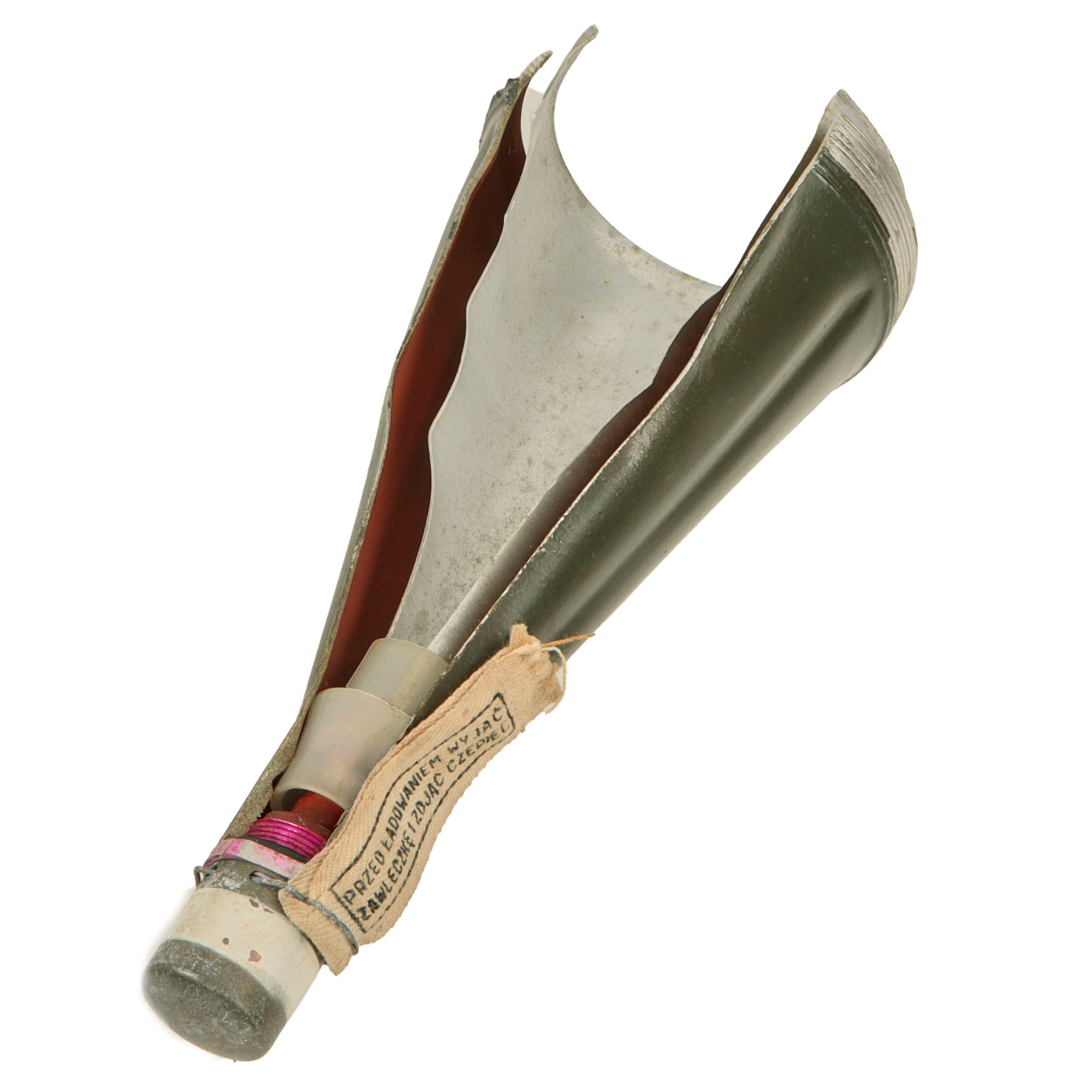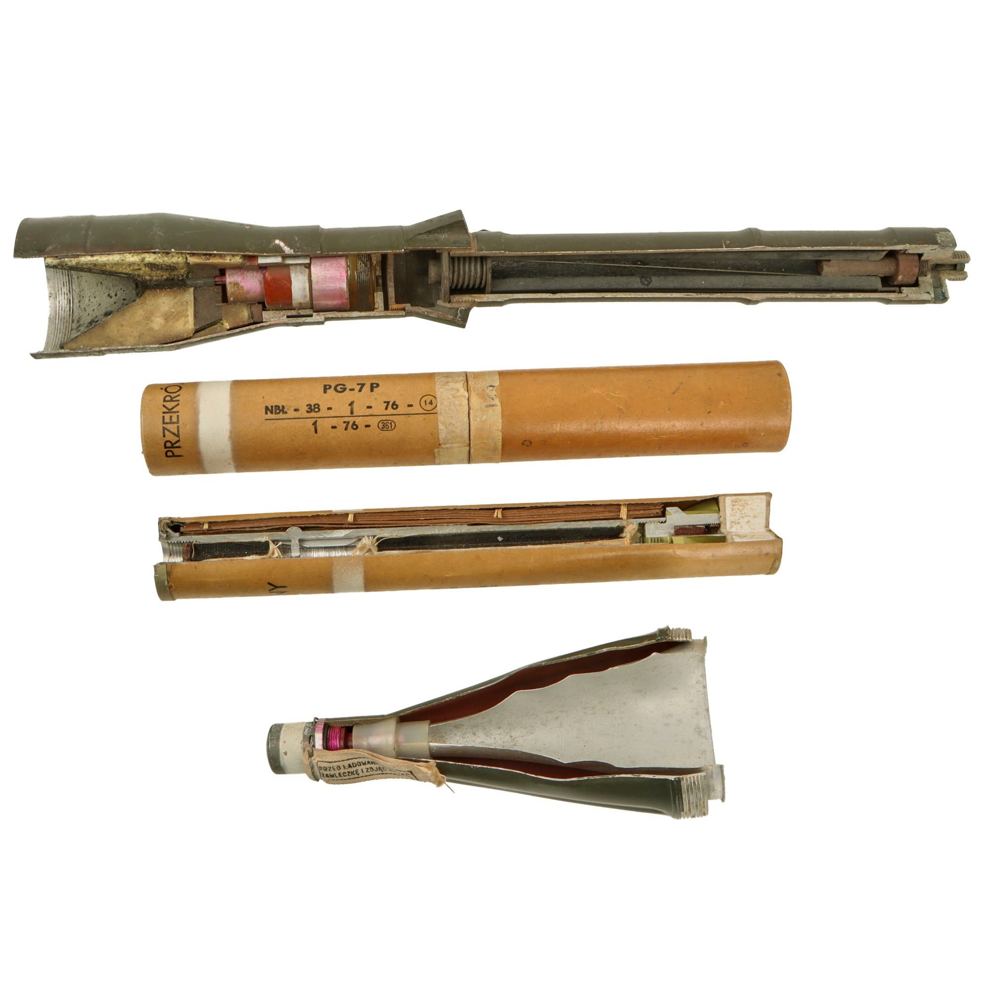 This is a good Soviet GWOT Era RPG-7 round with a fourth of the structure cut out to display the internal mechanisms of the rocket. This example even comes with the original Propelling Charge Container which is also cutaway and contained in its original tube. This was certainly a military-cut set. The shaft and head of the rocket do not connect.
