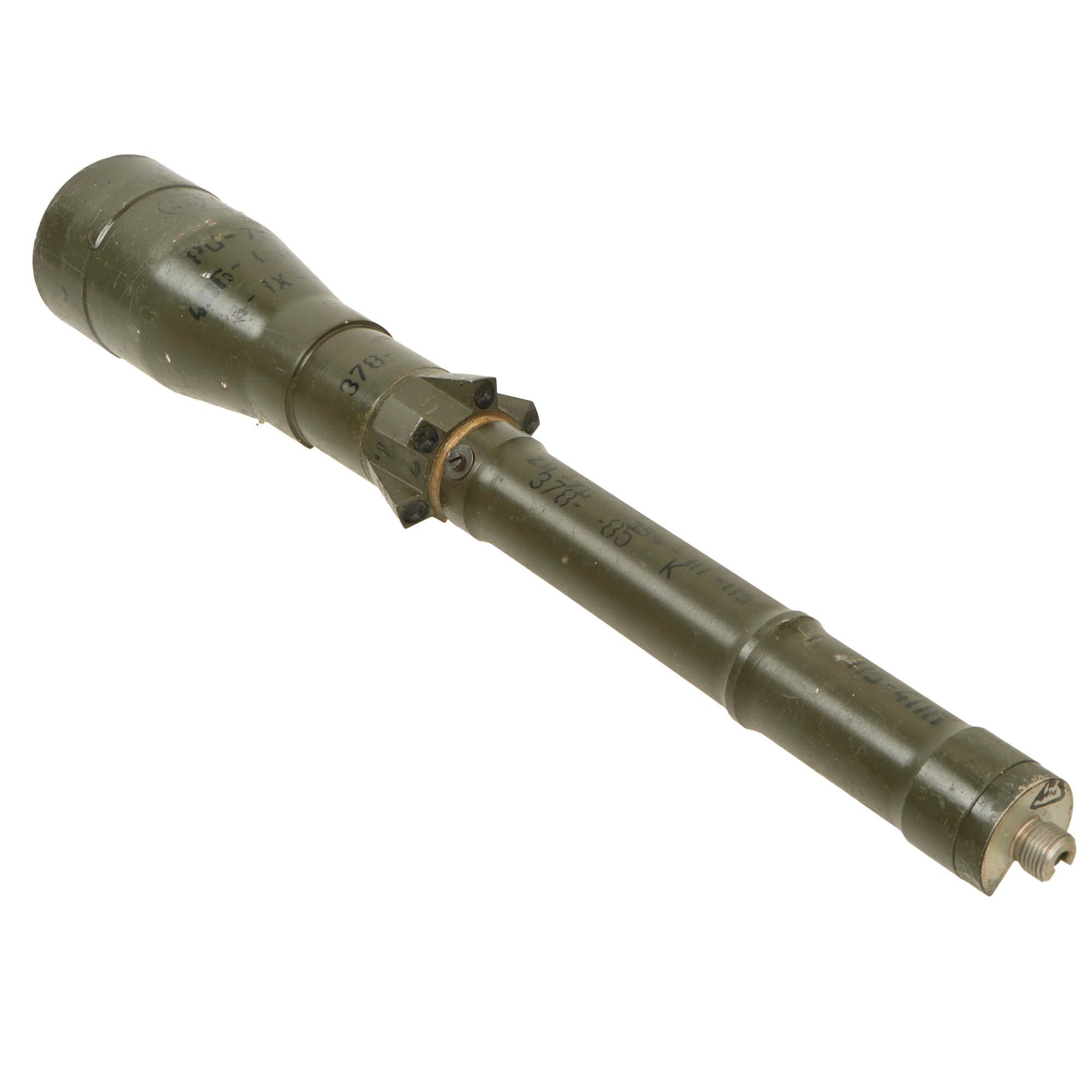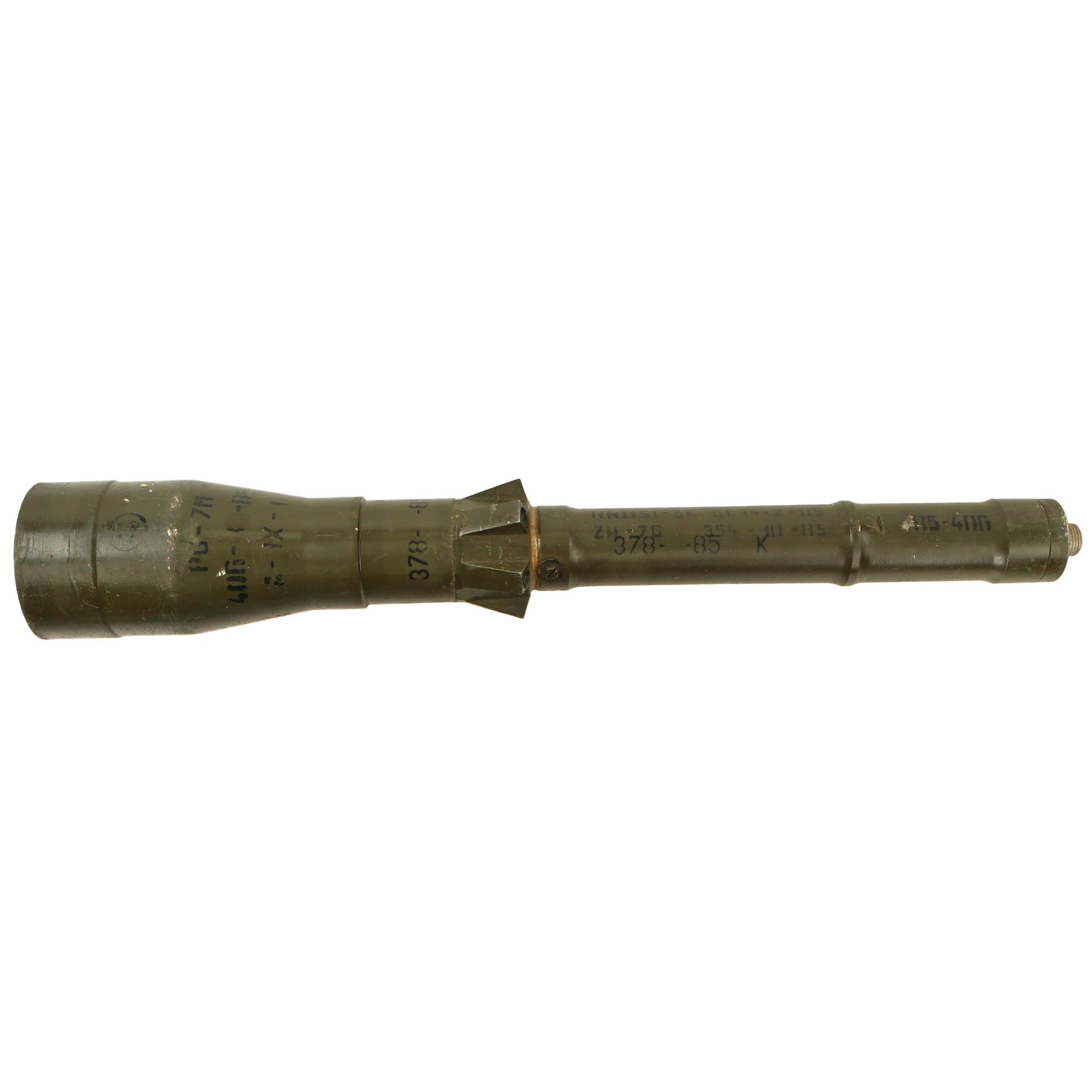 Original Item. One-of-a-Kind. The RPG-7 (Russian: РПГ-7, Ручной Противотанковый Гранатомёт – Ruchnoy Protivotankoviy Granatomyot) is a widely-produced, portable, unguided, shoulder-launched, anti-tank rocket-propelled grenade launcher. It works by launching a 40mm rocket propelled grenade using the gases escaping the muzzle to expel the rocket from the tube. Originally the RPG-7 and its predecessor, the RPG-2, were designed by the Soviet Union and are now manufactured by the Bazalt company. The weapon has the GRAU index 6G3.