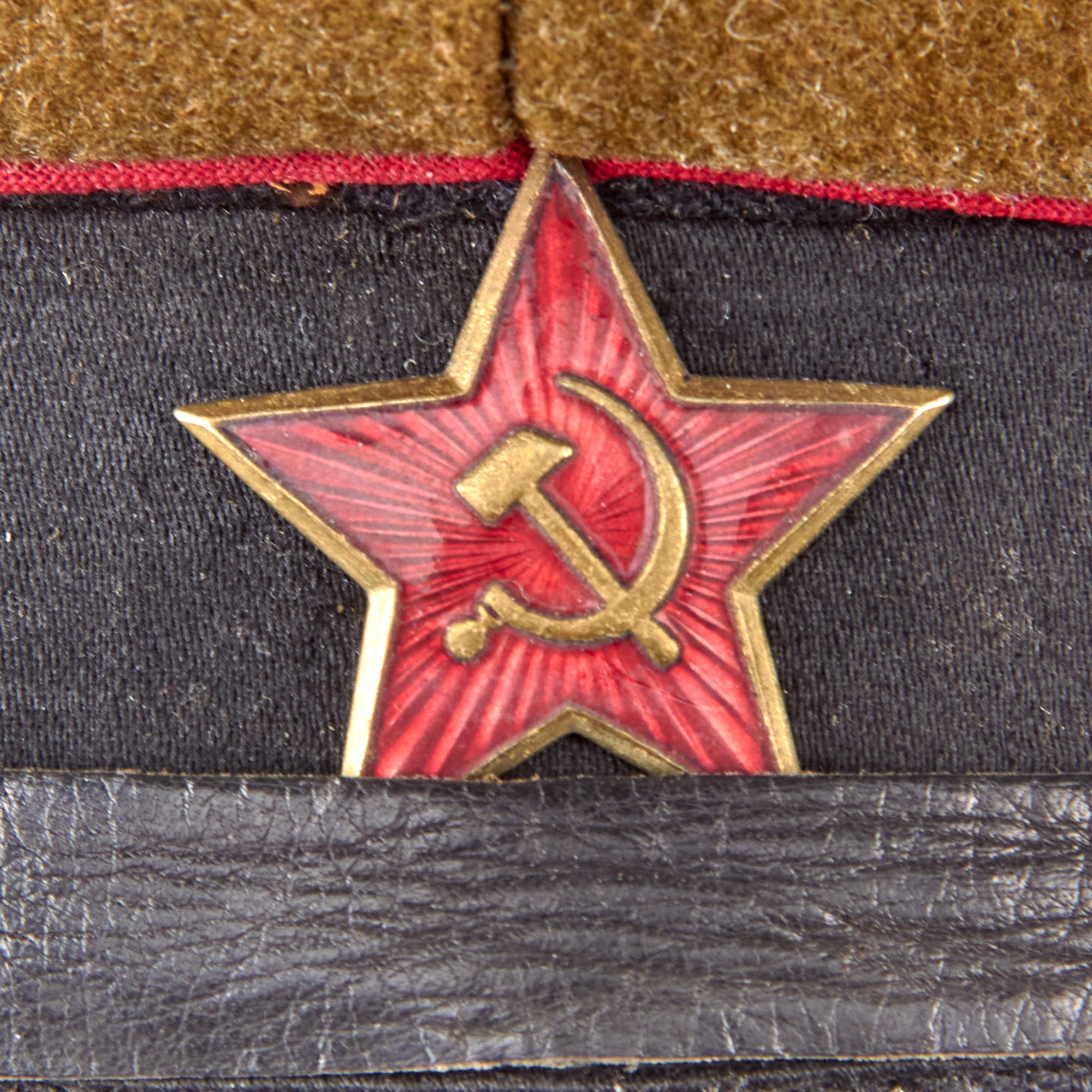 This cap with red wool piping and black felt hat band would have been worn by a RKKA Artillery & Tank Officer for service duty and for dress. The crown is green wool and there is a black chinstrap which is held in place by two brass buttons. The visor is made of spade-shaped fiberboard. A brass and enamel M39 star is pinned through the band.