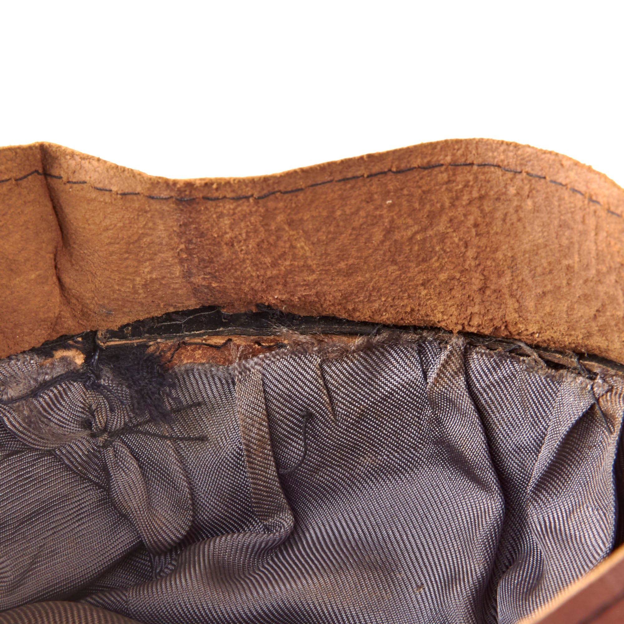 The interior is void of markings but the rayon lining is still soft and in good shape. There is some tearing in the sweatband but this is rather minor. The stitching looks to be original and is well-retained.