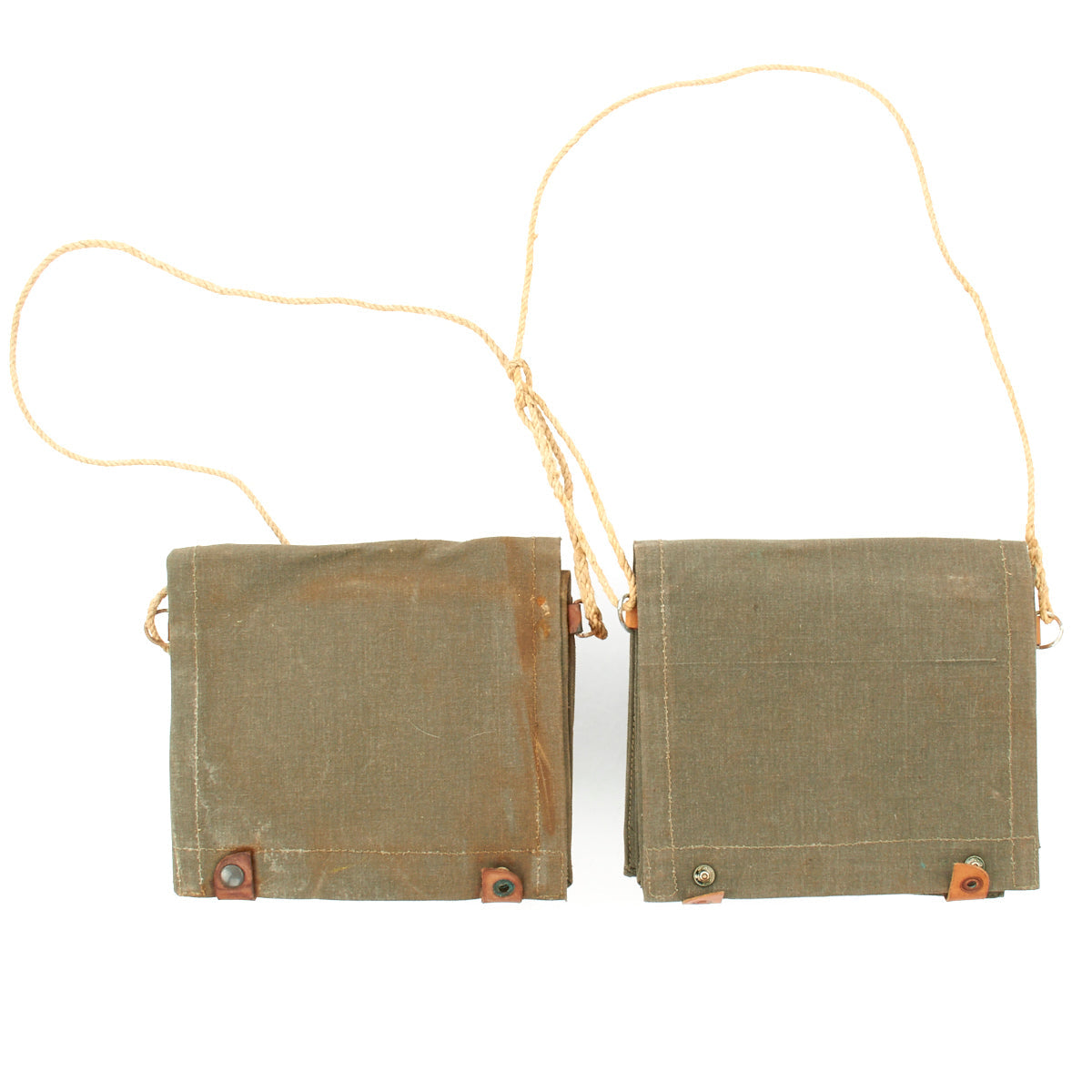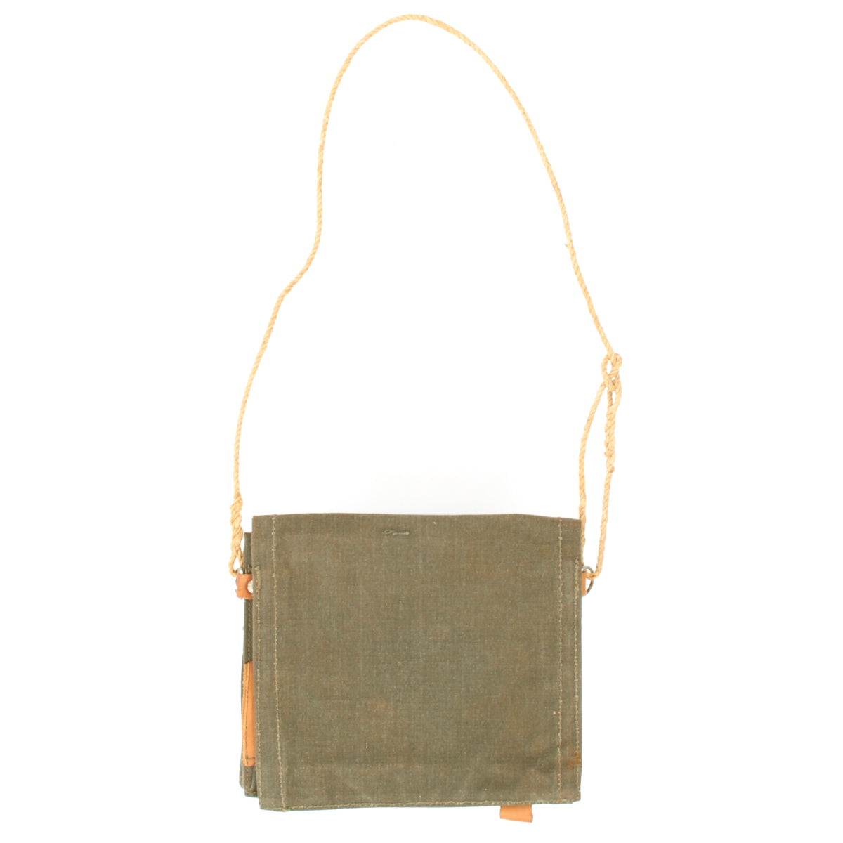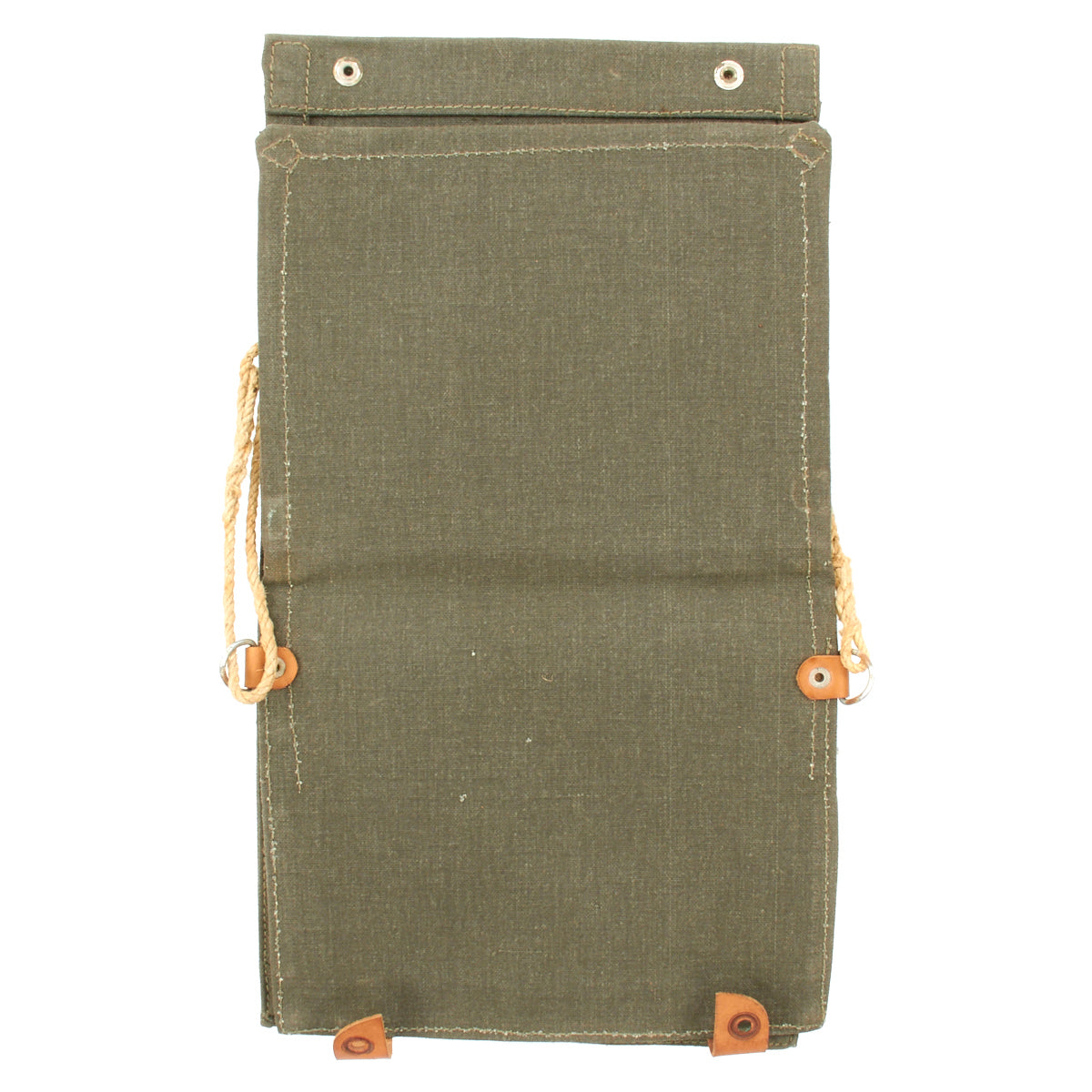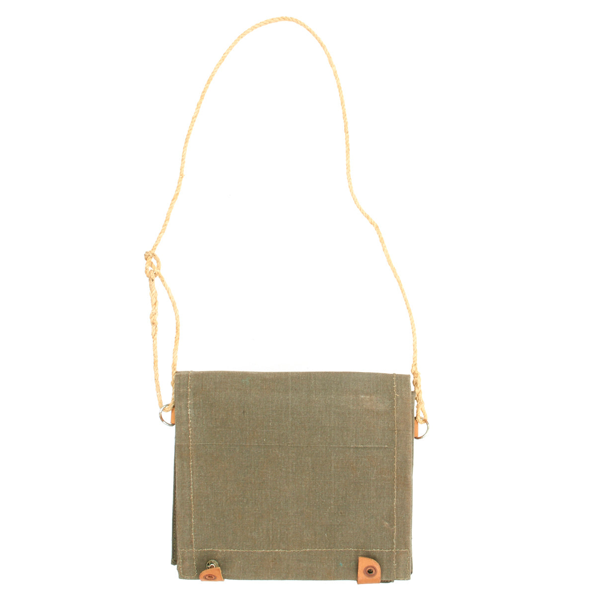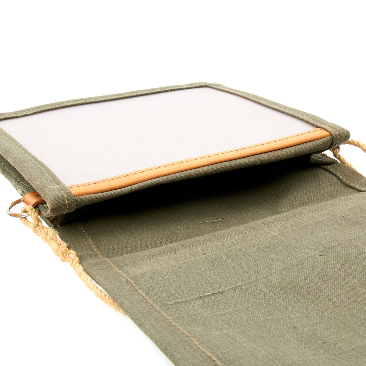 Substantial grey canvas and leather construction, approx. 10" x 11" when closed, opening to leather-lined clear window panel for map display with document compartment and leather pen holder. Leather snap closures with cord shoulder strap. Military marked, used. Ideal document case for trips and for use in the car. Super quality.