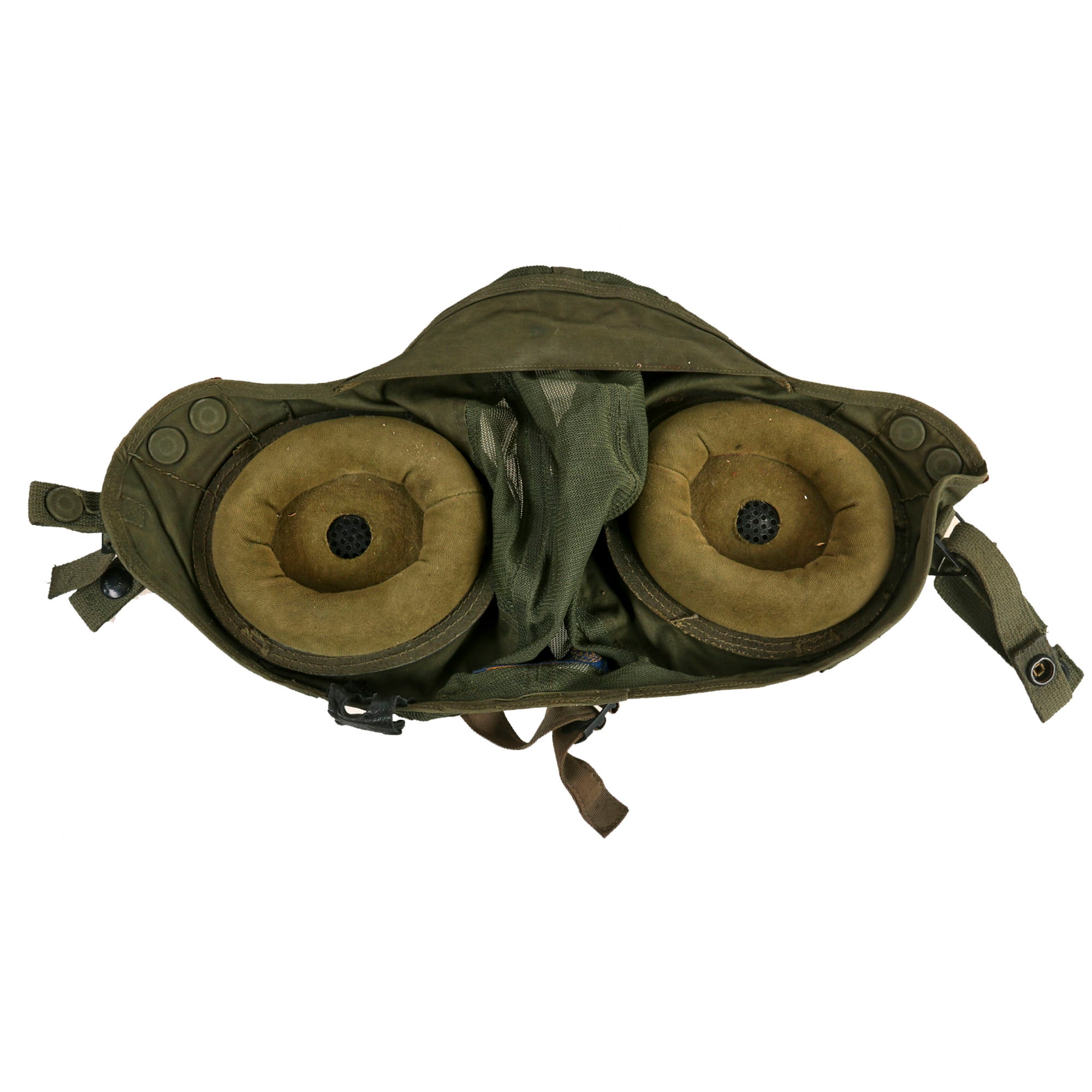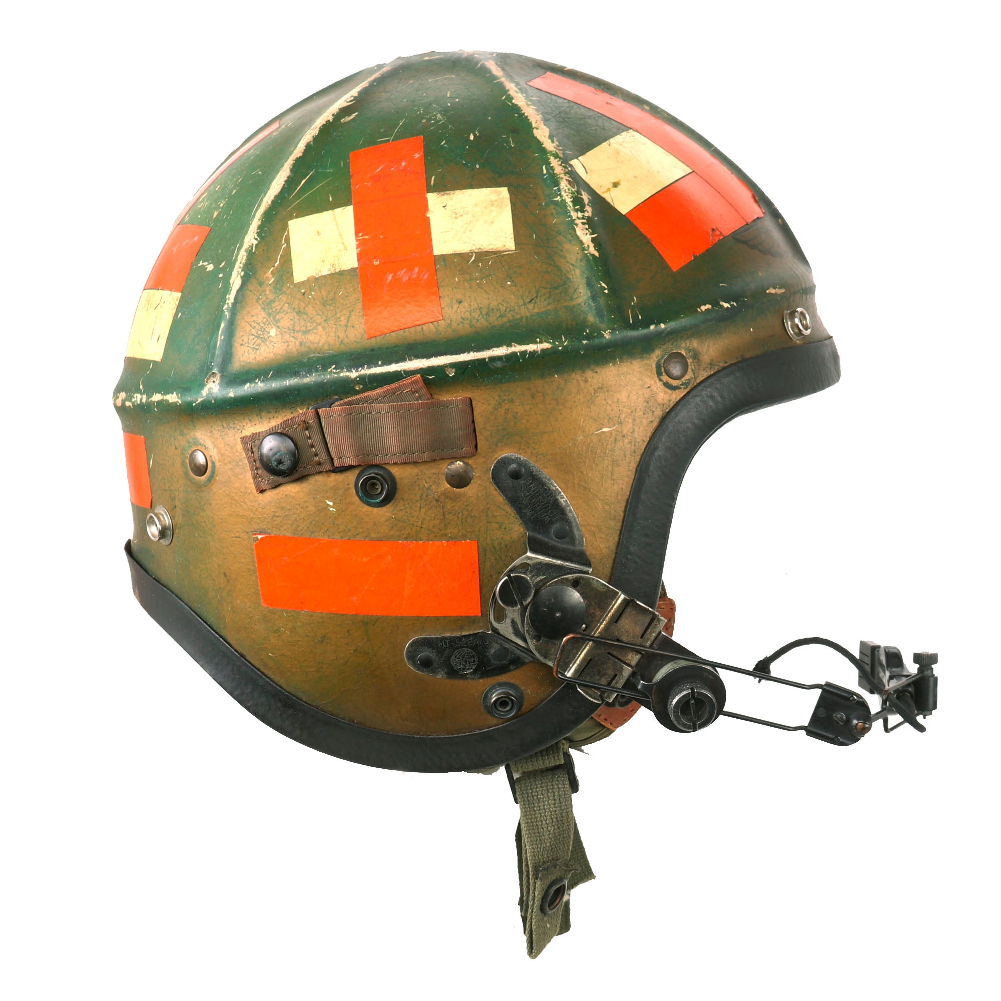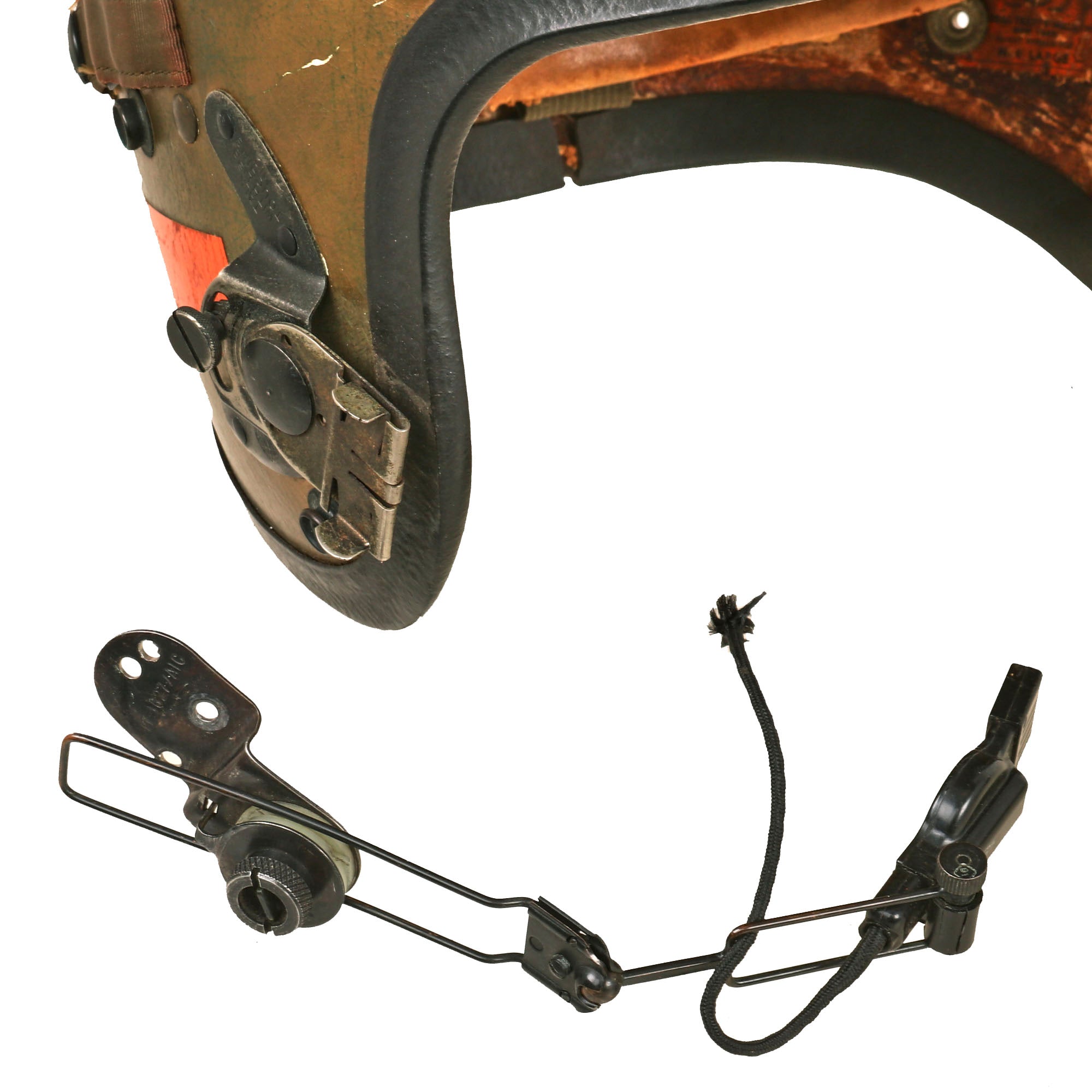 This set comes with the original 62.H-4 interior helmet with headphones by Gentex, in Size 7¾. The headphones are P/0H87A/U PERMOFLUX RHR-10. The microphone of the helmet has come off and we weren’t able to get it put back on.