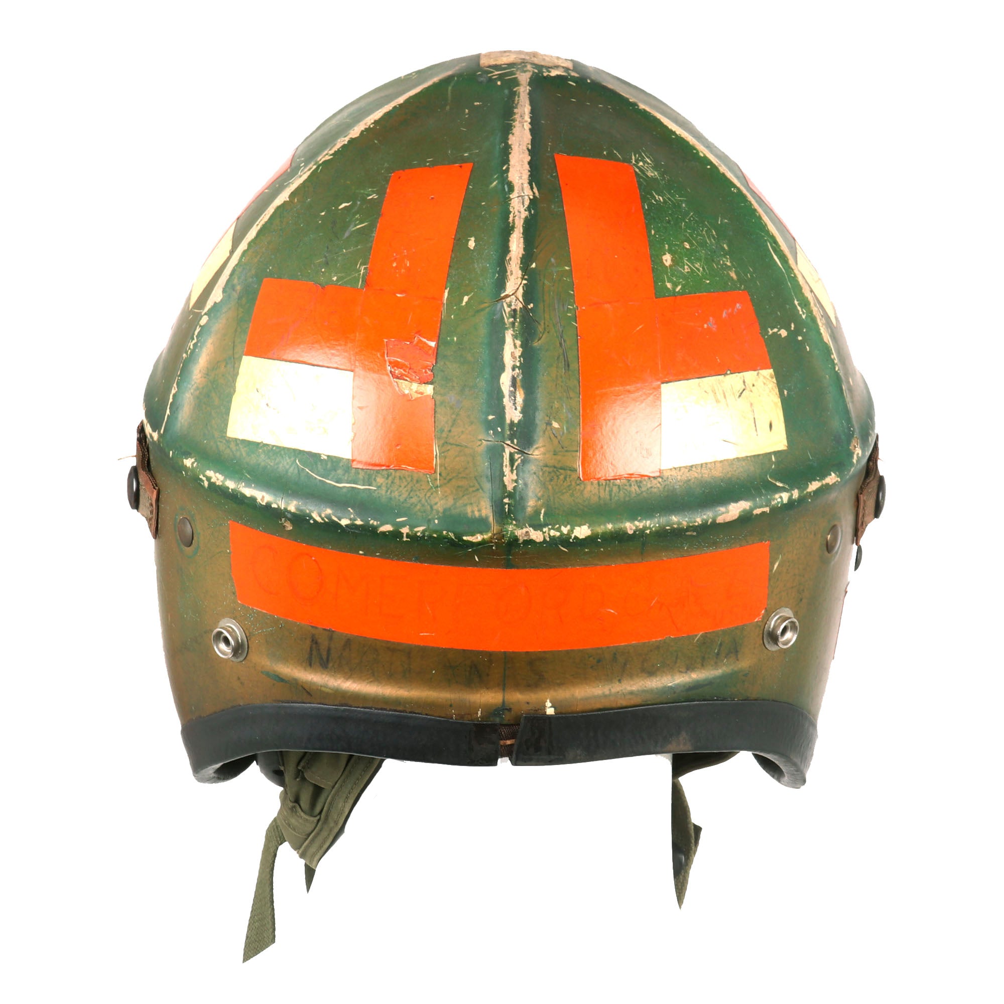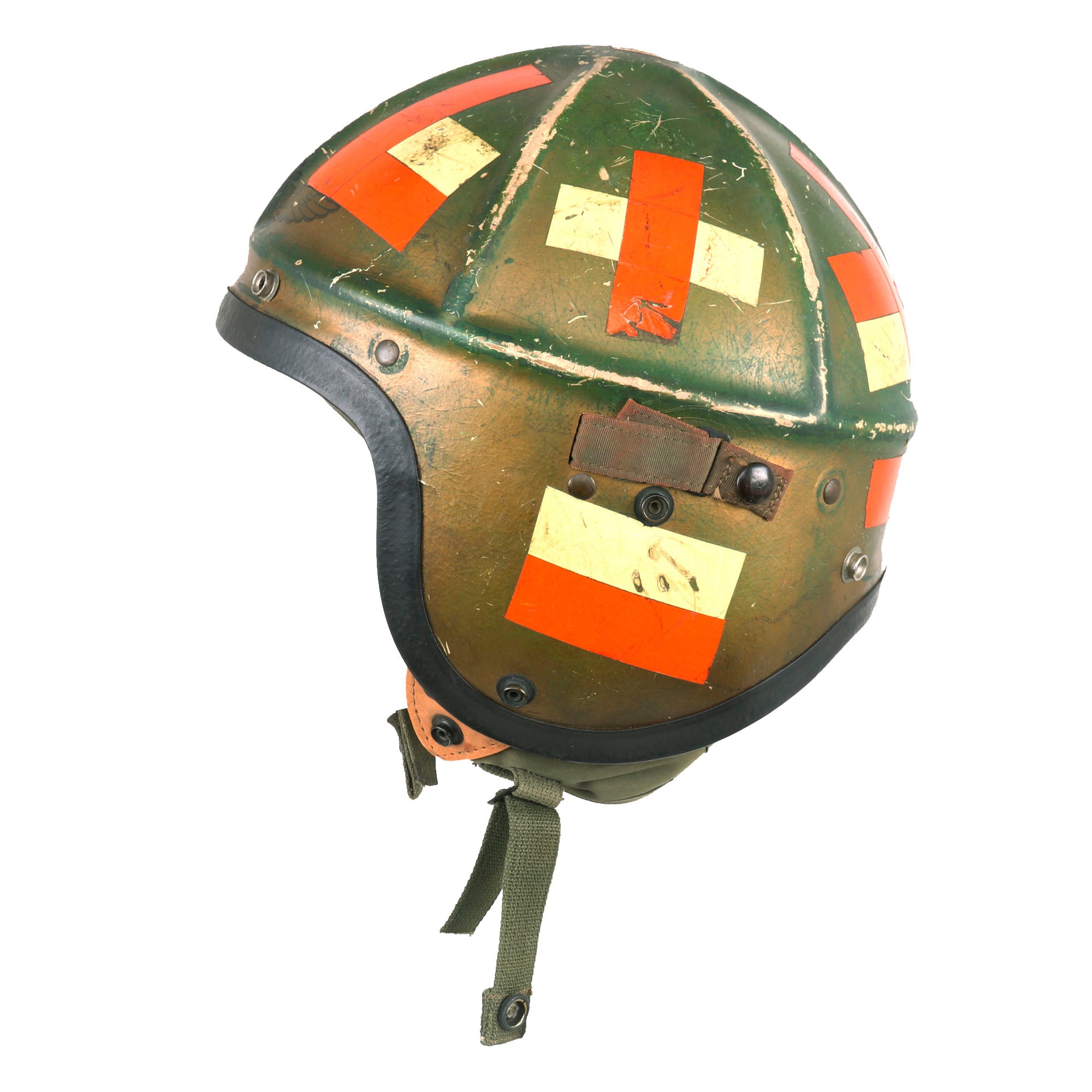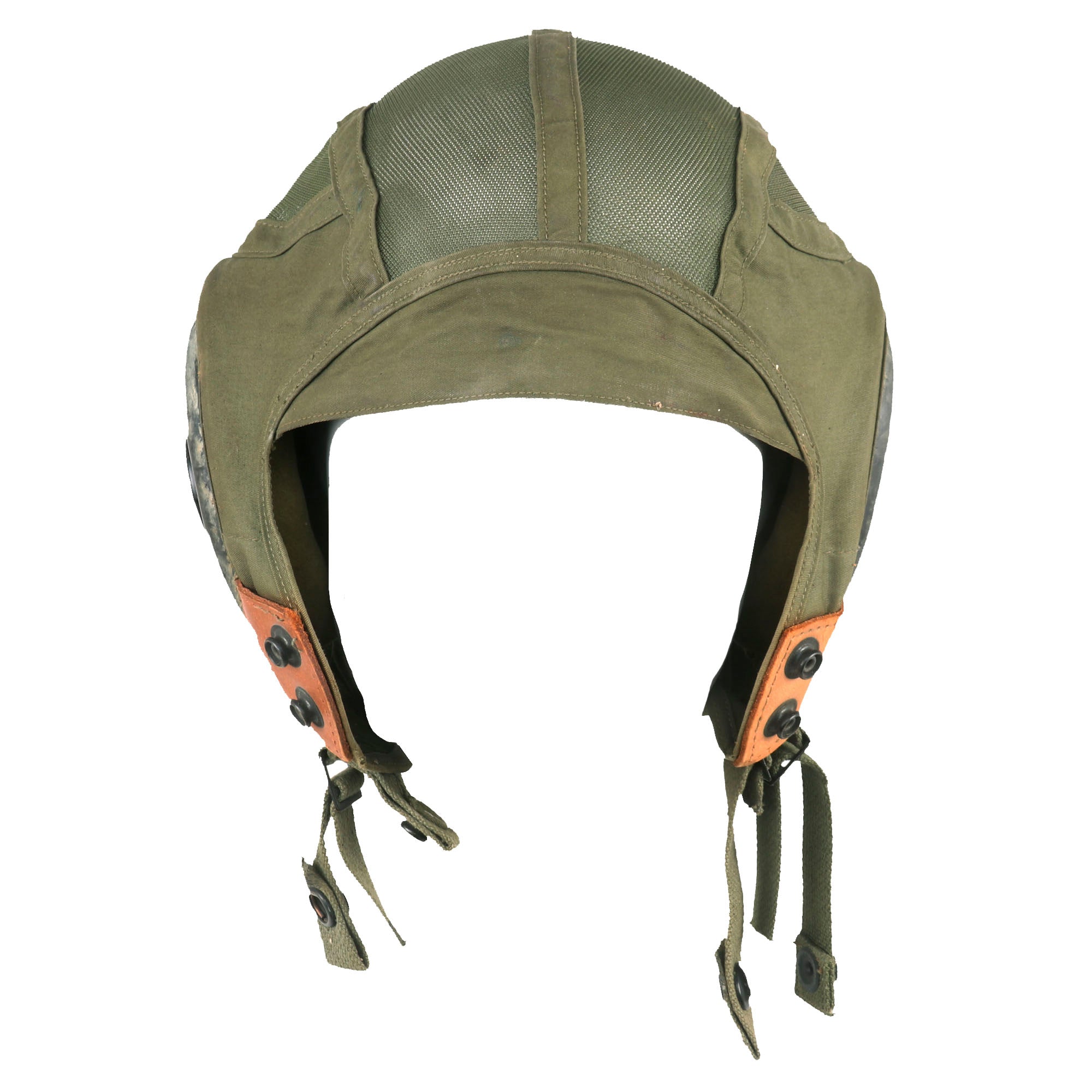 The H-4 features a rigid shell with reinforcing ridges and is constructed of a fiberglass cloth reinforced with epoxy resin. For this model a cloth inner helmet which incorporate the earphones was utilized. This was secured to the rigid shell by "pull the dot" snap fasteners on the cheek flaps and in some cases with additional straps attached to snap fastener in front and in the back of the rigid shell.