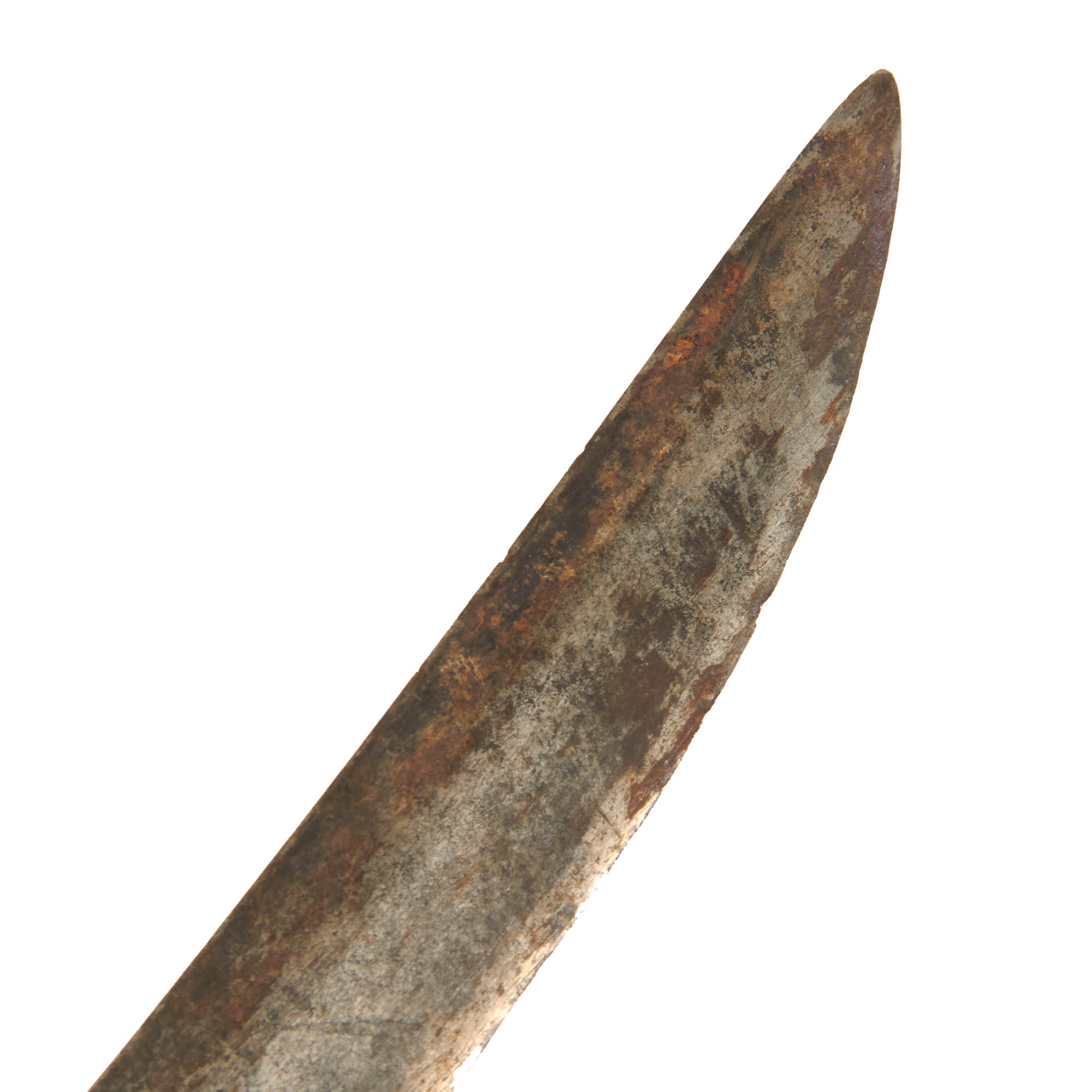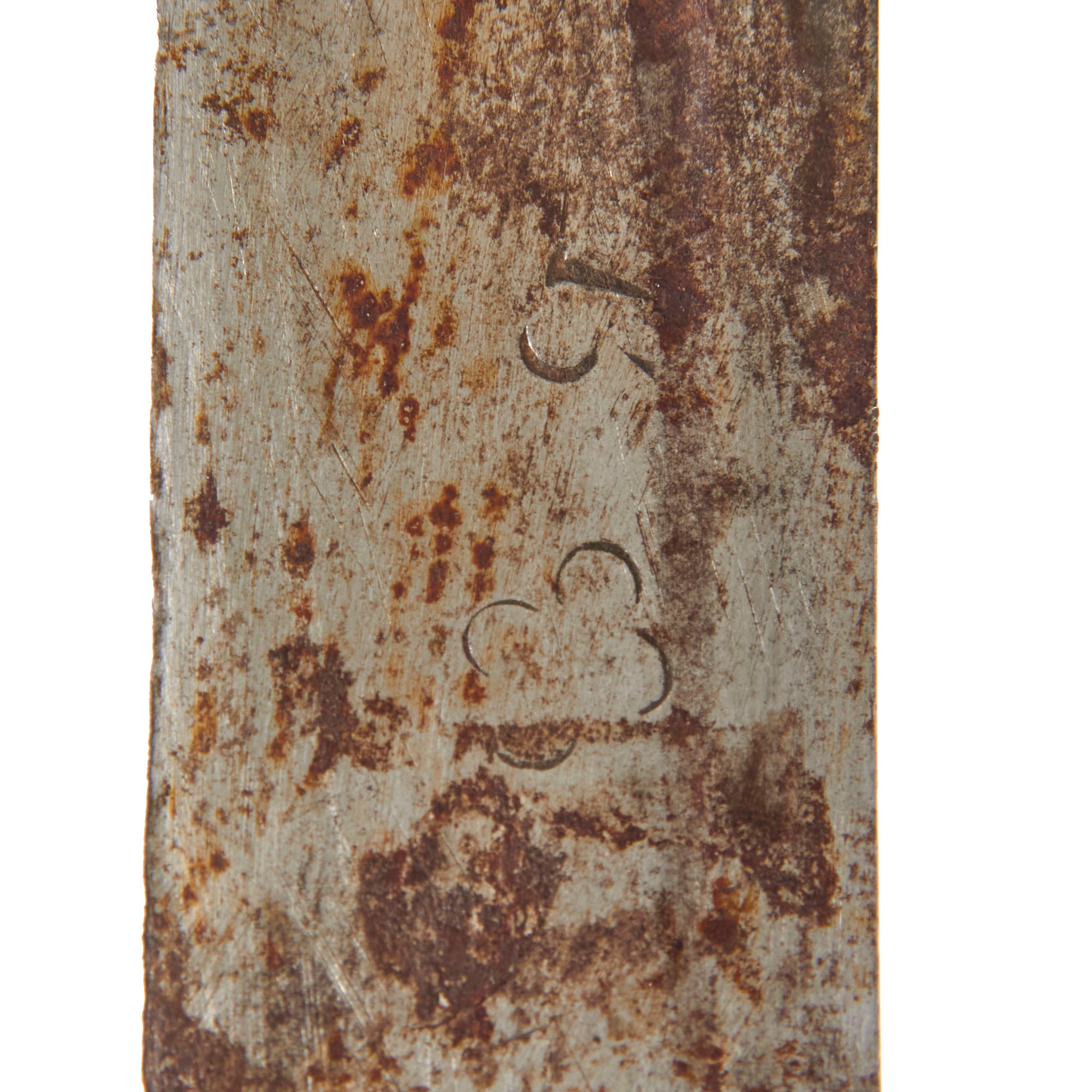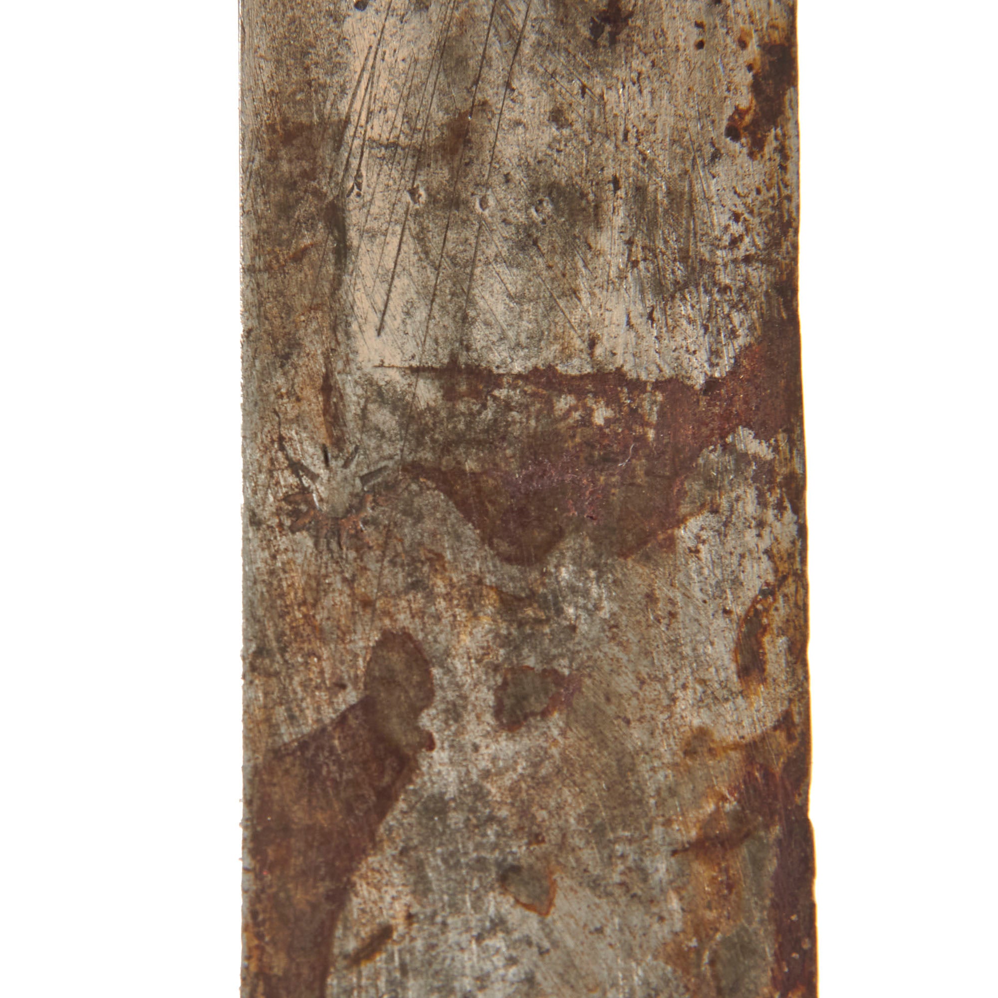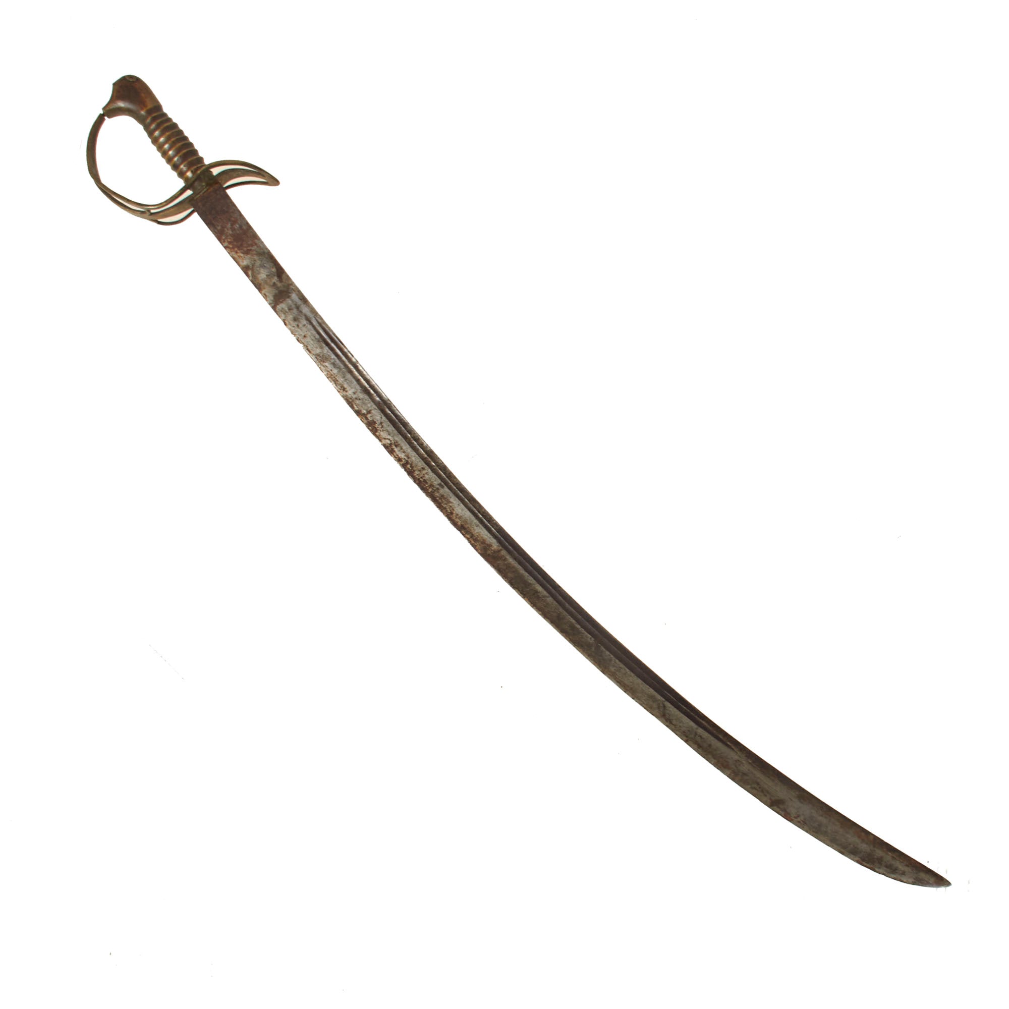 The 33 3/8” blade is in good condition for its age, with heavy staining and wear, and some small chips in the edge of the blade that are not too noticeable. Both sides of the blade sport two fullers in the center portion. The engravings on both sides are completely evident of the period, but they are now very faint. There is oxidation and pitting towards the tip of the blade, with the pitting getting worse at the very tip.