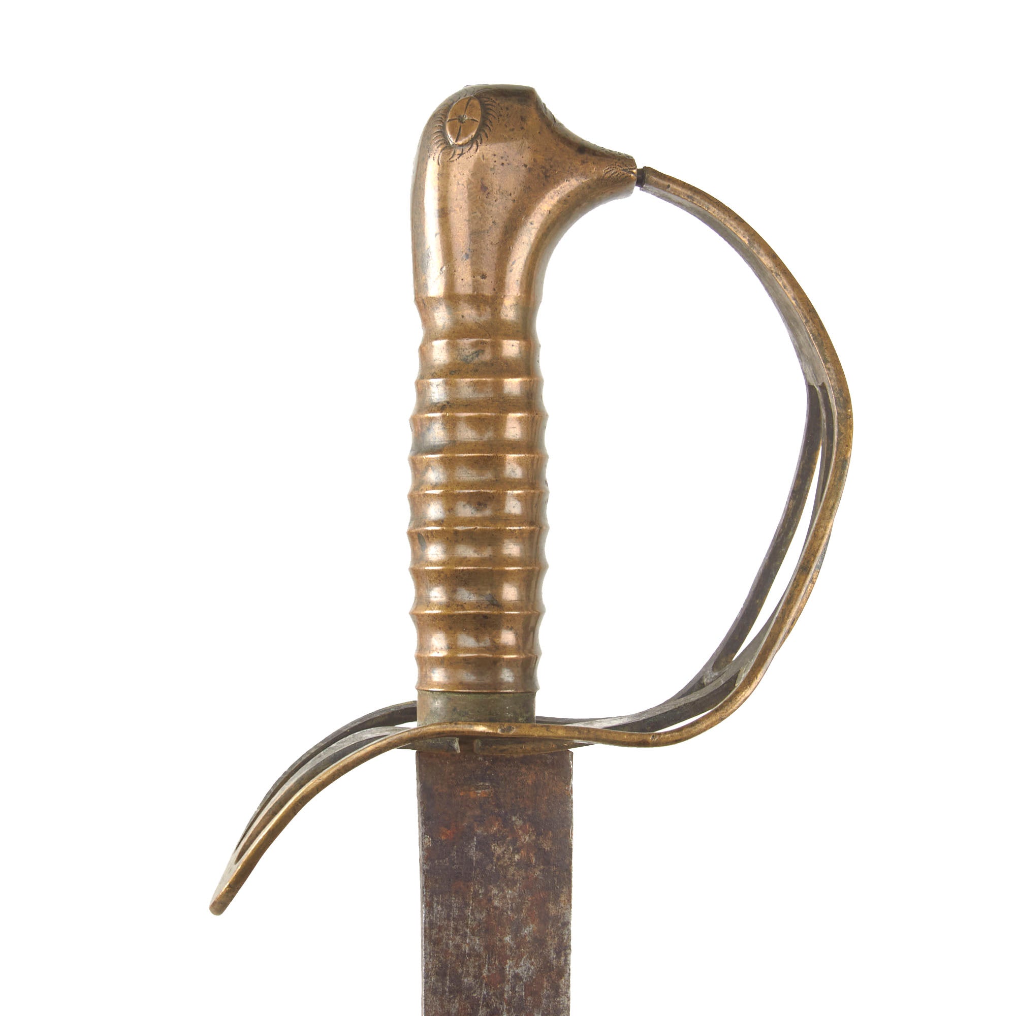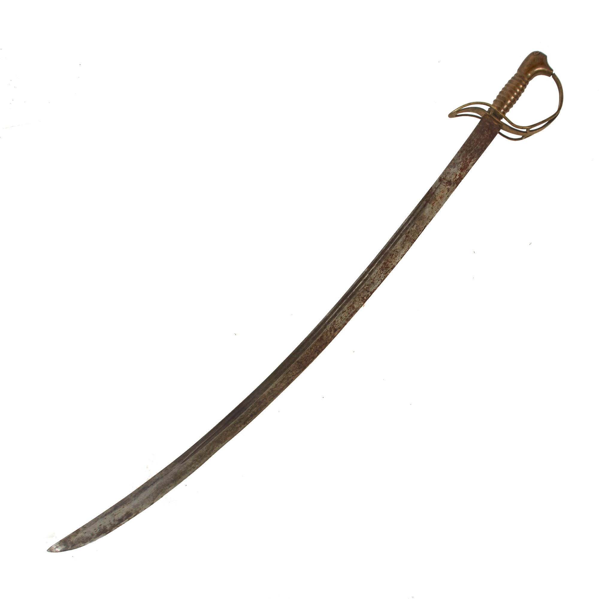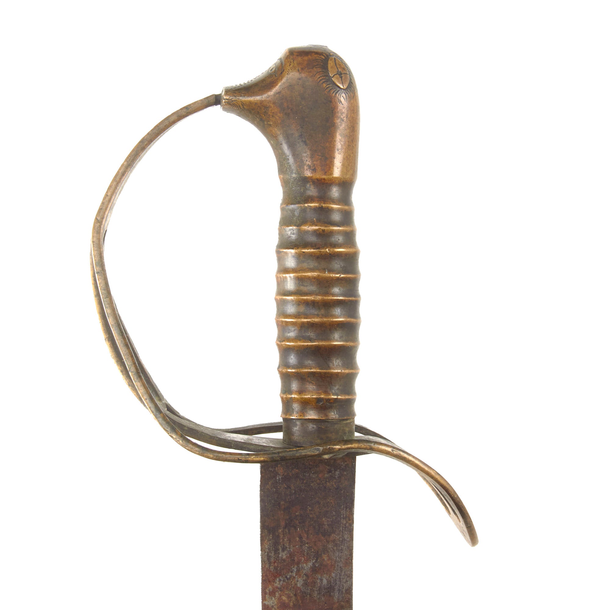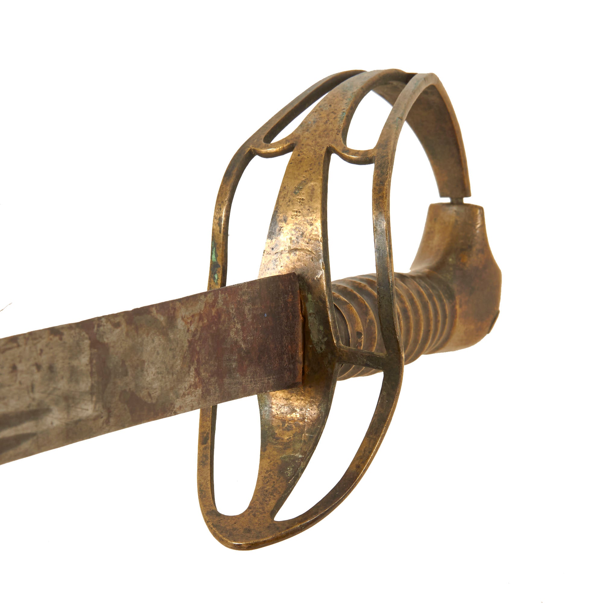 The grip of this example is correctly all-brass with the ribbed-brass grip still in great condition without any denting, leading to the Monster’s head pommel which is actually a charmingly crude shape with engravings to give it the look of a monster head, a design characteristic that is specifically American in nature. There are even sharp teeth in the mouth which swallows the end of the guard. This is supported by the Stirrup-style guard which is also heavily evident of American manufacture. The guard was given a heavy bend at the end, and is in good shape with some denting and heavy staining.