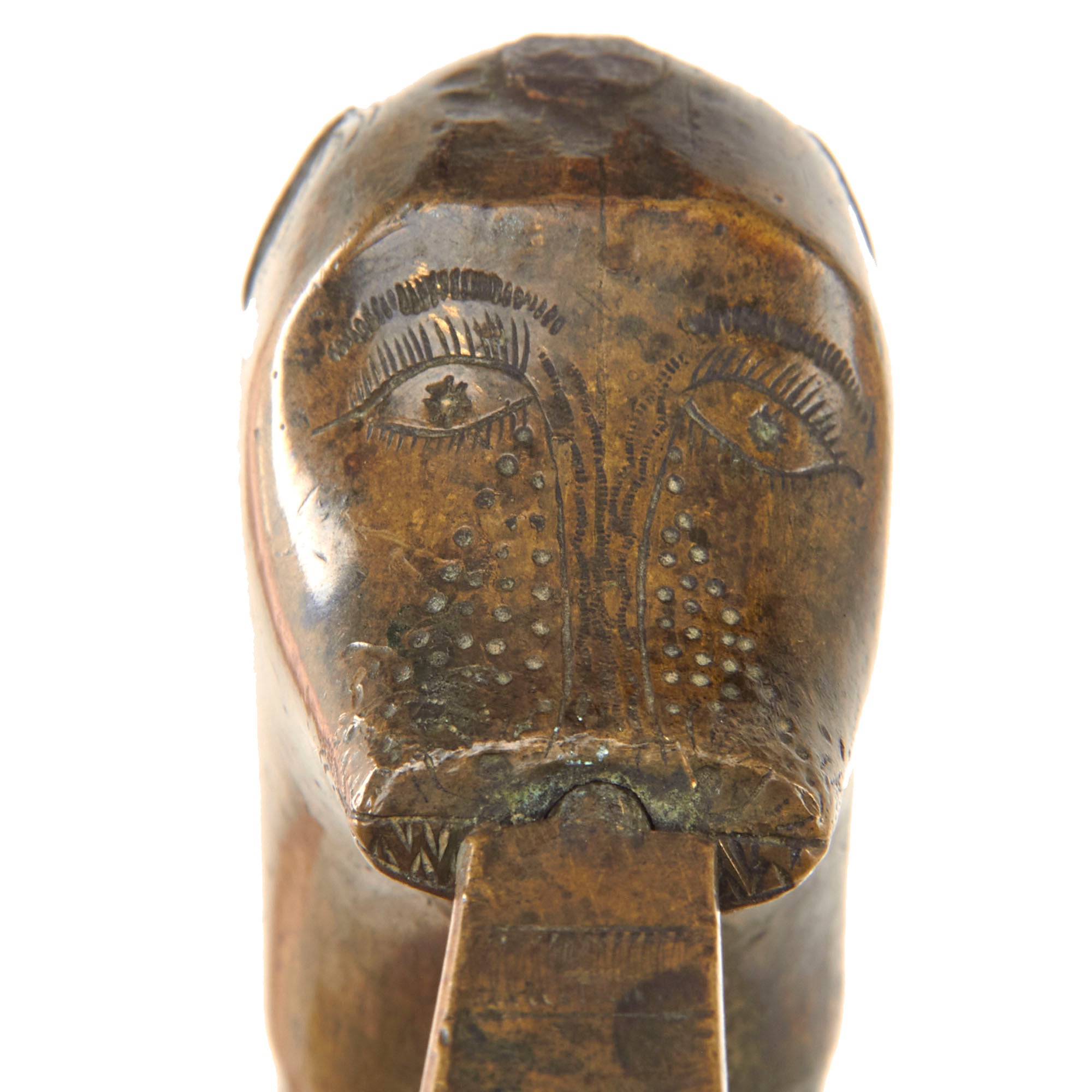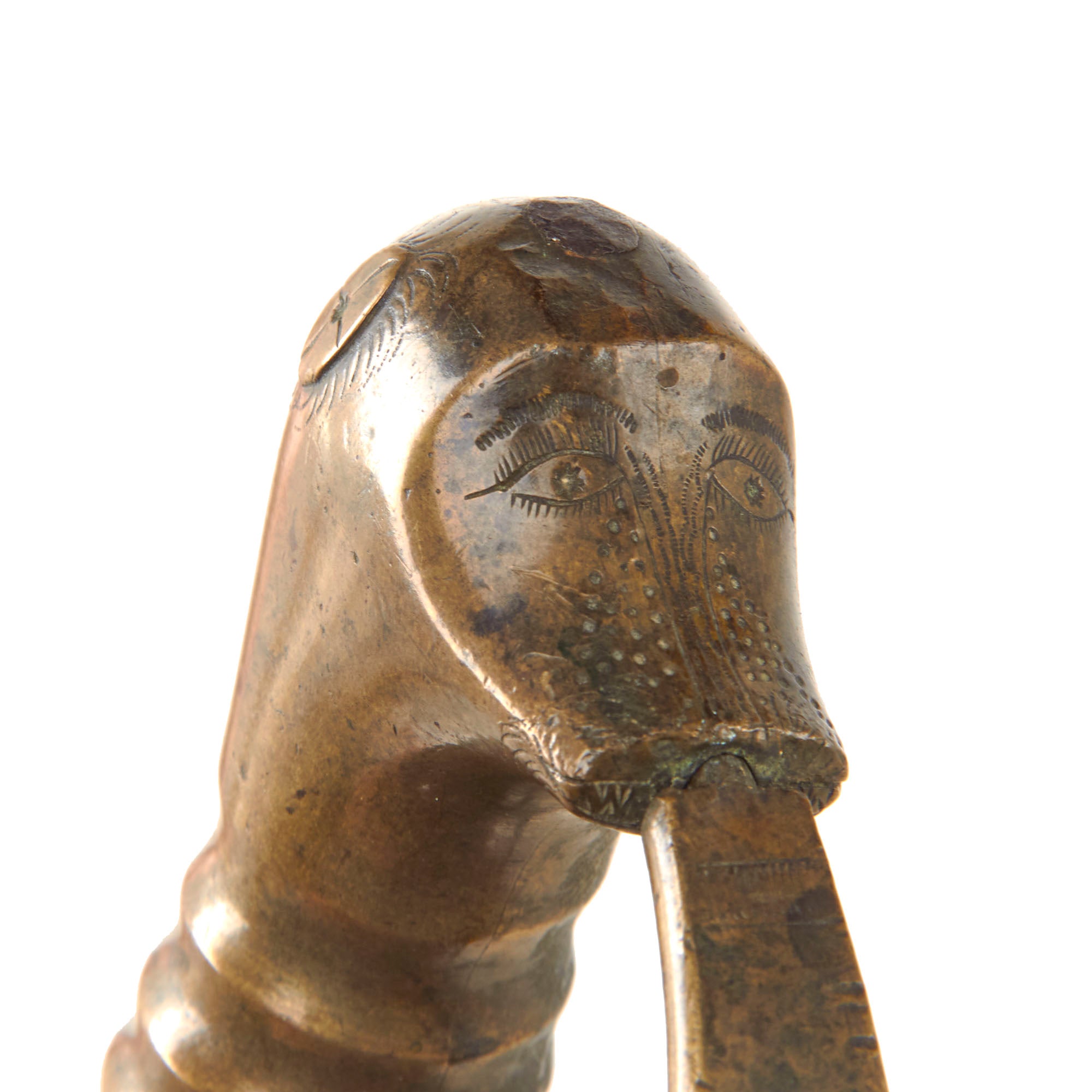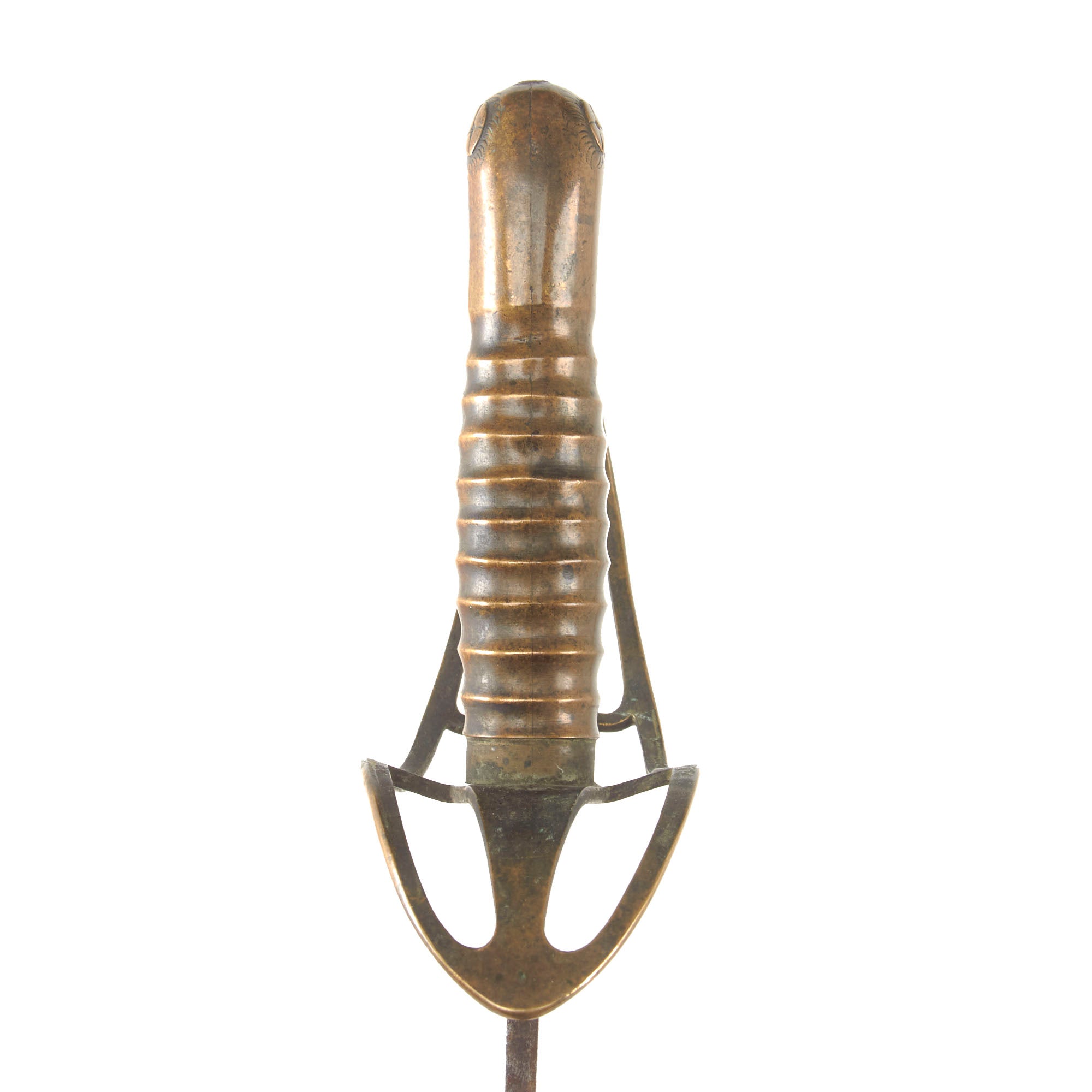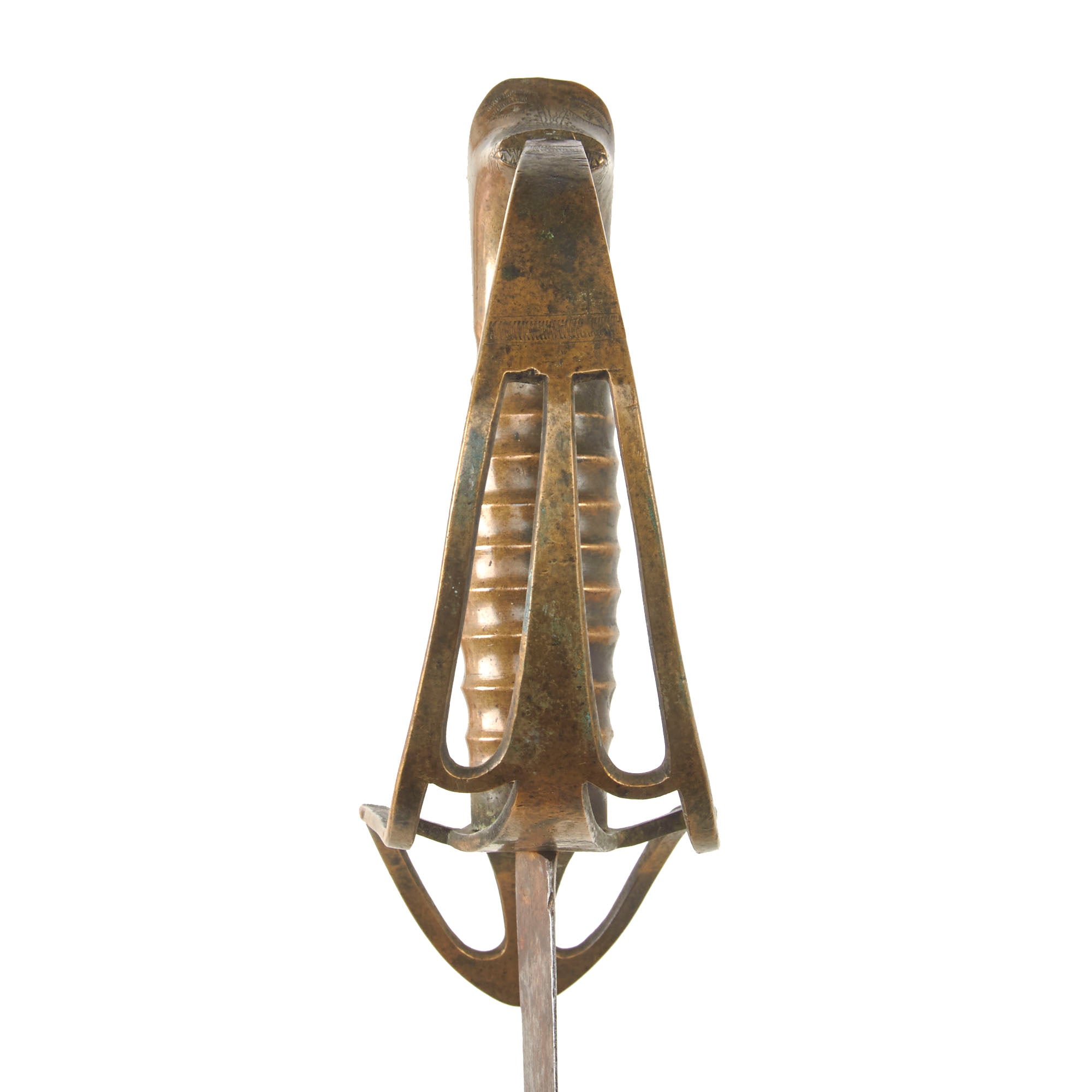 The hilt is of brass and has held up very well, without any significant damage or denting, just heavy staining. The Monsterhead pommel is very charmingly-detailed and is correct to the period. It is extremely difficult to find these without replacement parts.
