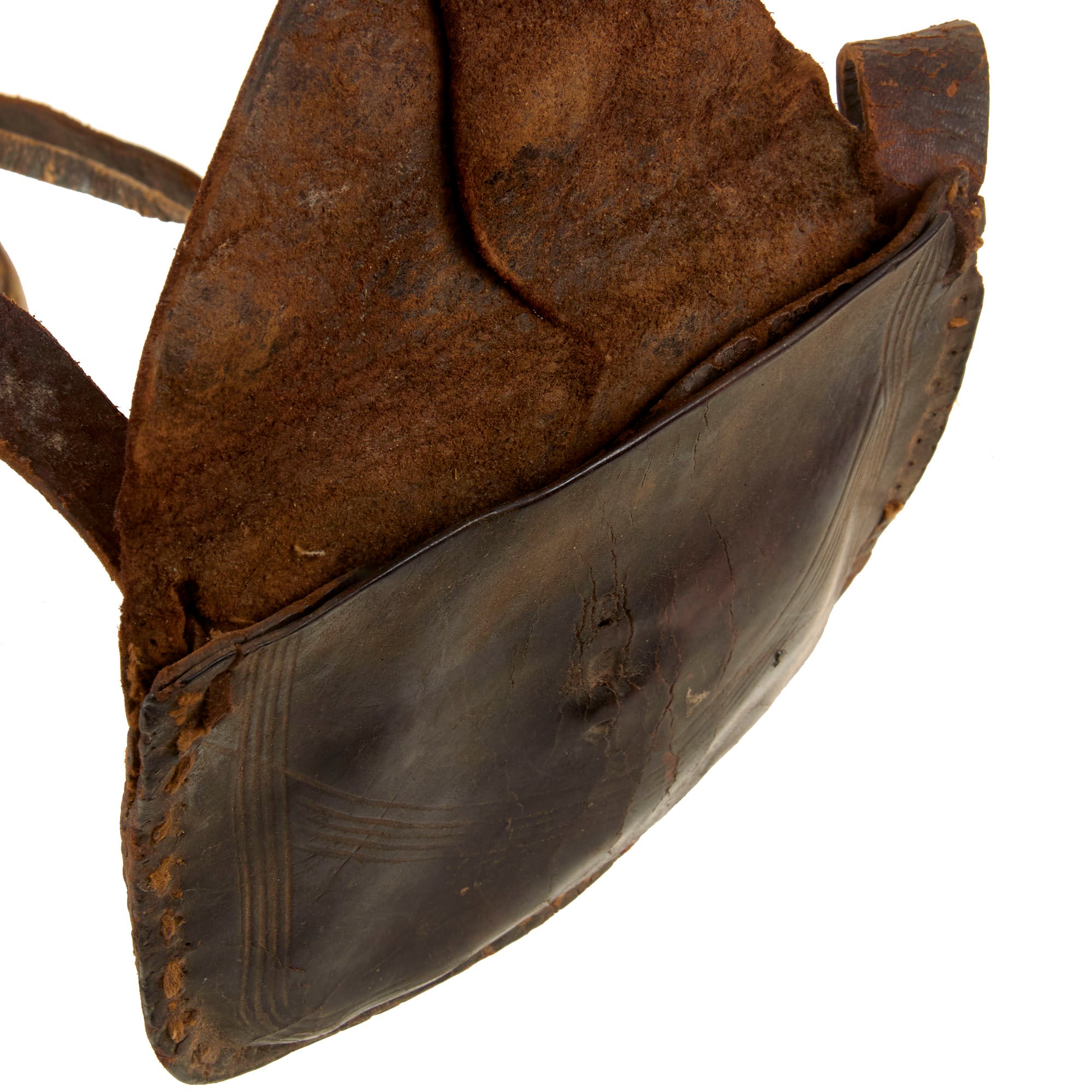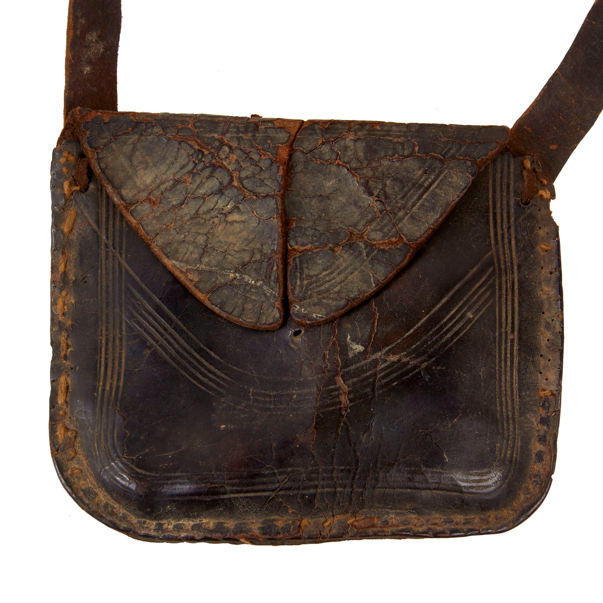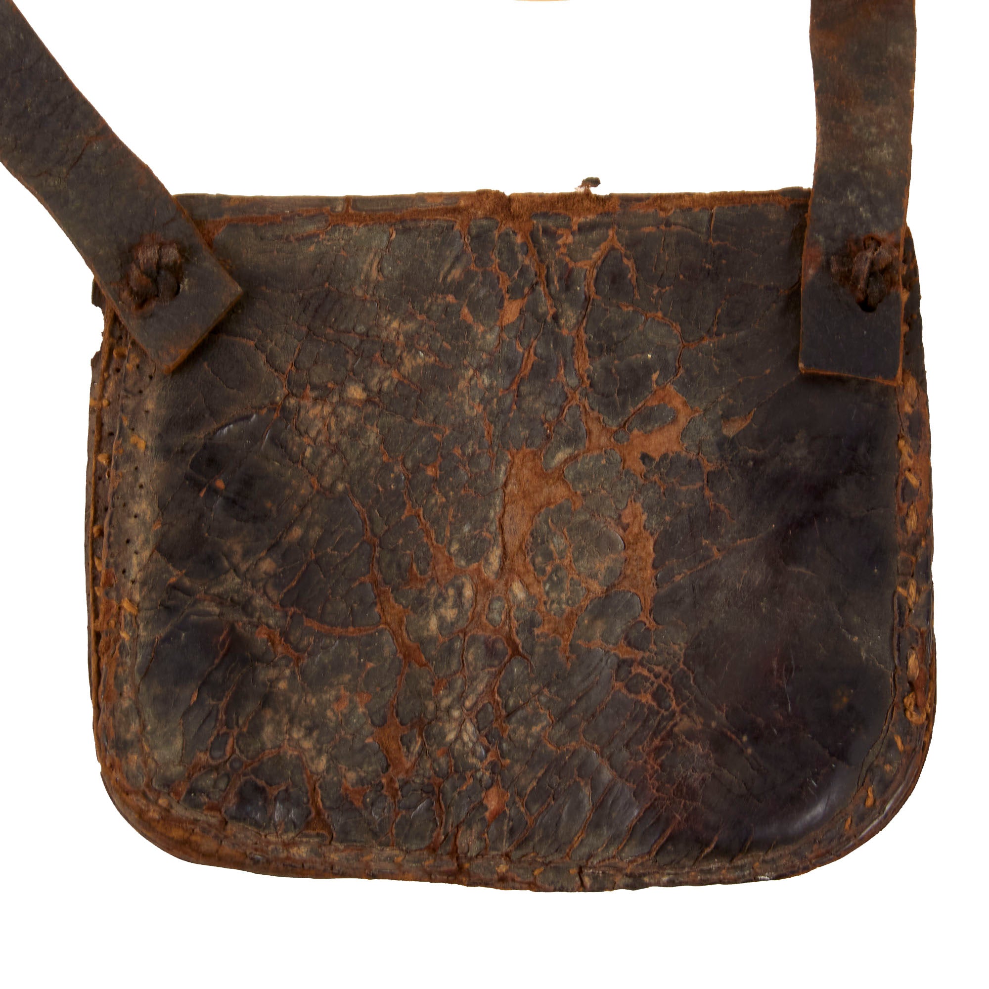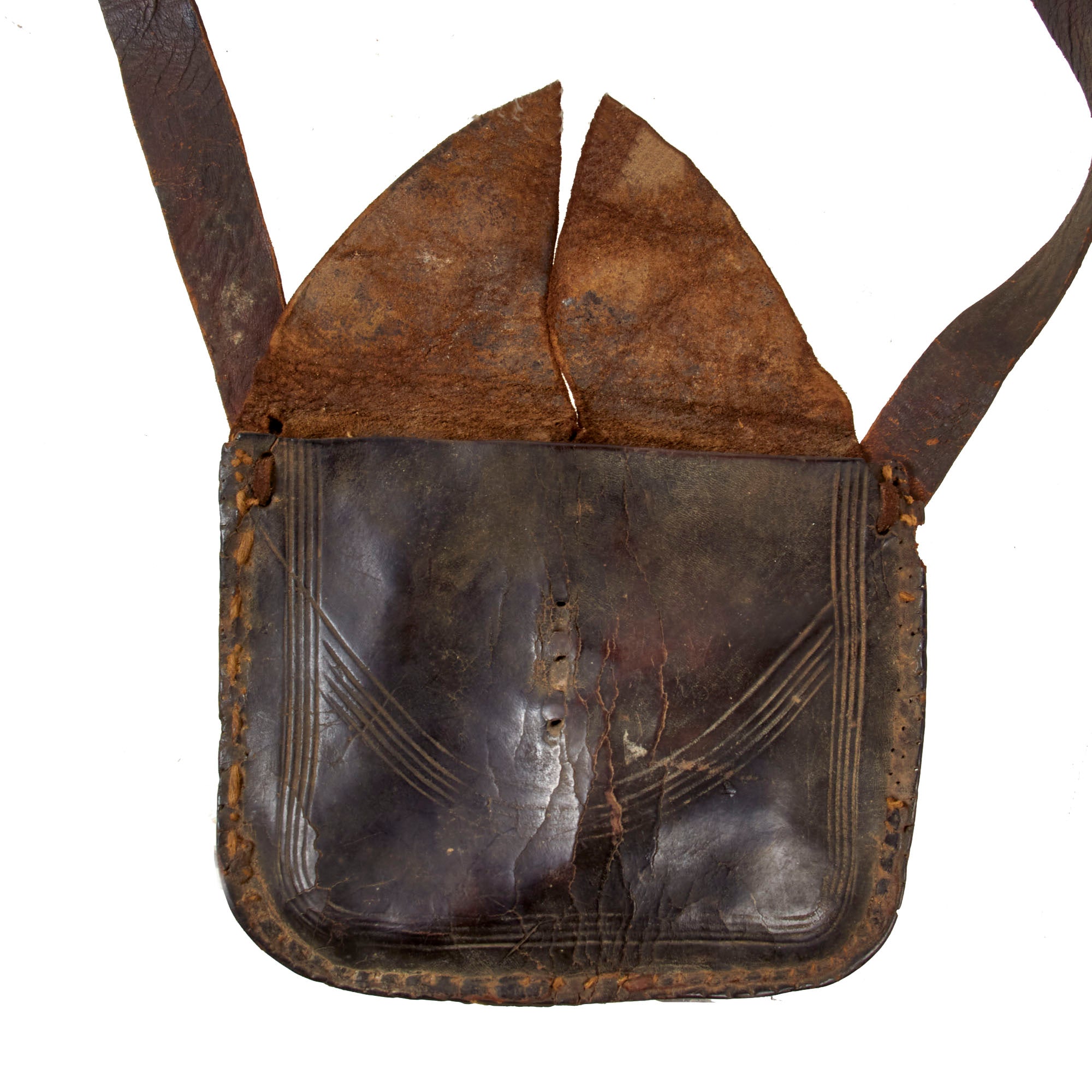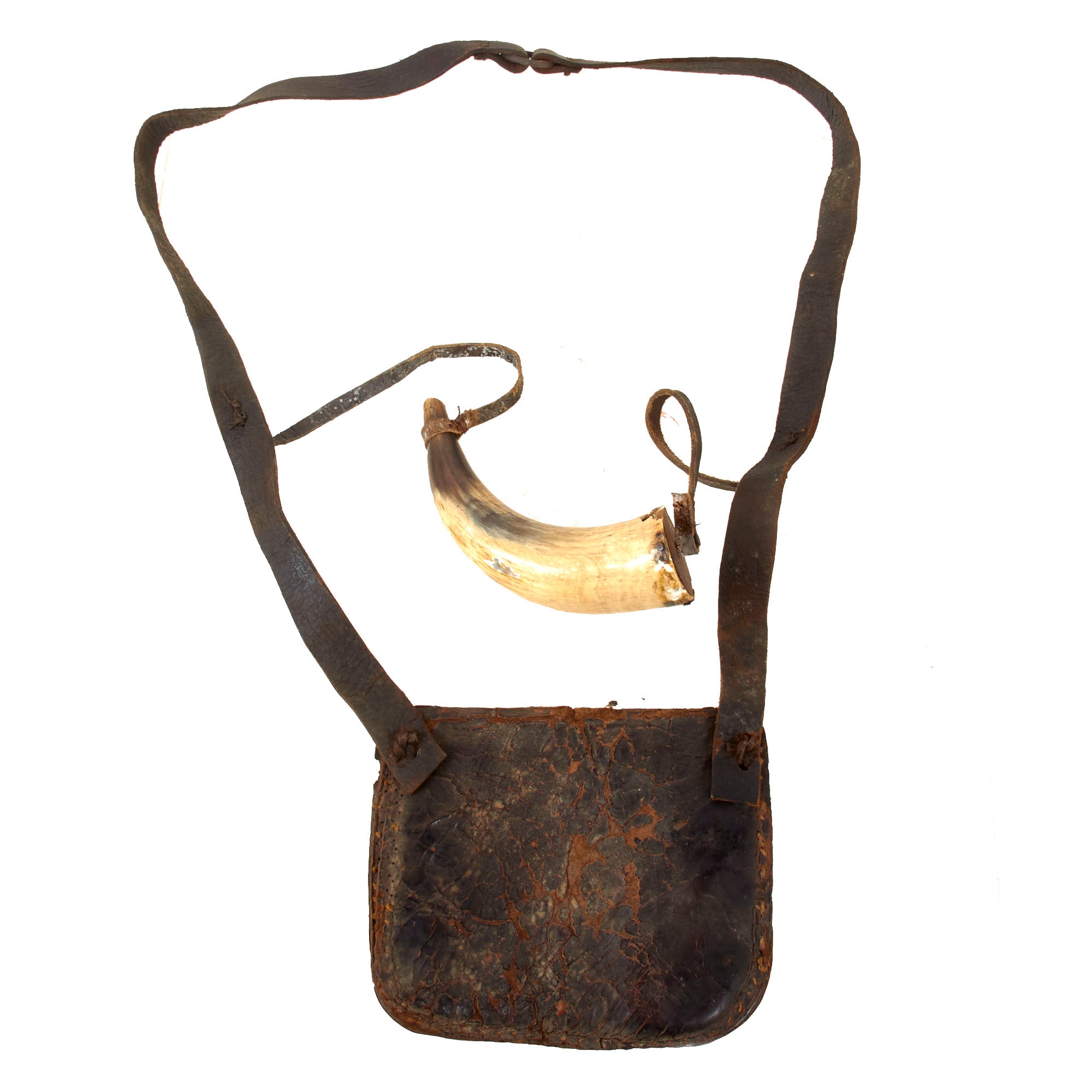 Original Item: Only One Available. This is a very nice service-worn example of an early American-Made Militia rifleman’s bag with a small period-correct integral powder horn with its original leather straps still connected. The leather of the bag shows heavy period repairs but the leather strap still looks to be in good order. The front flap of the bag is mostly torn in half in the middle but is still well-attached.