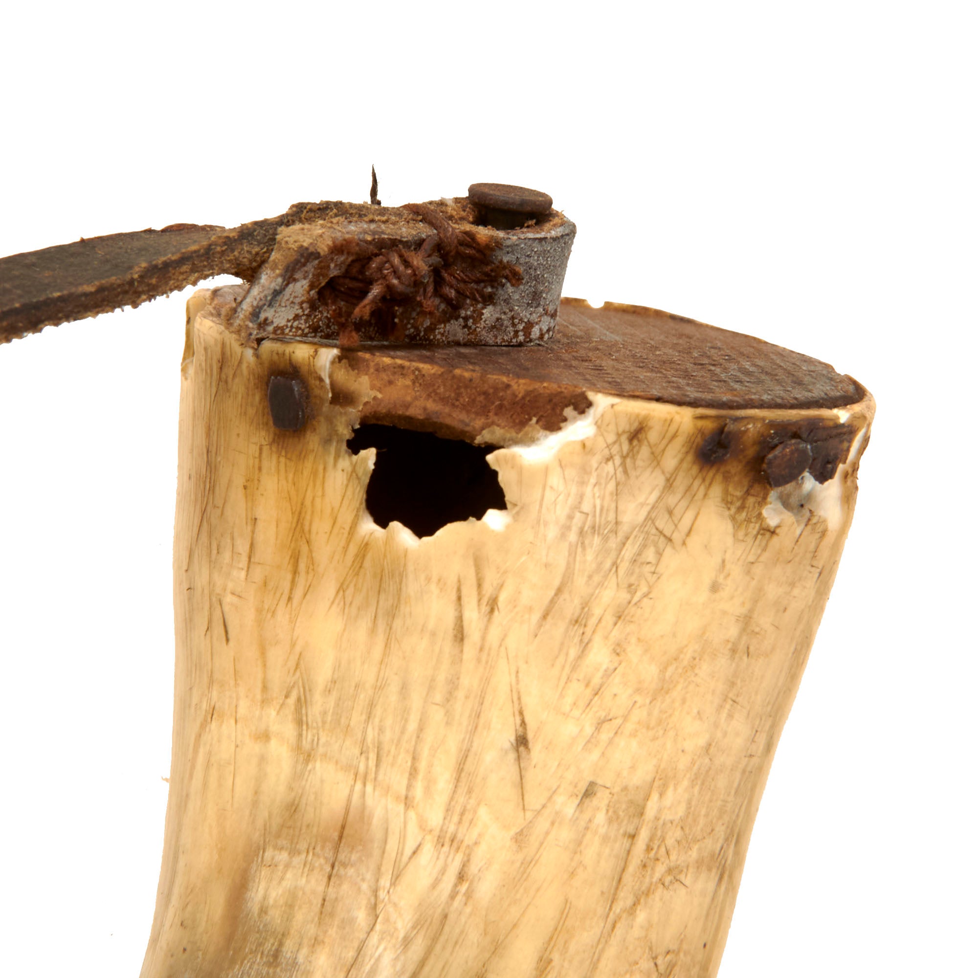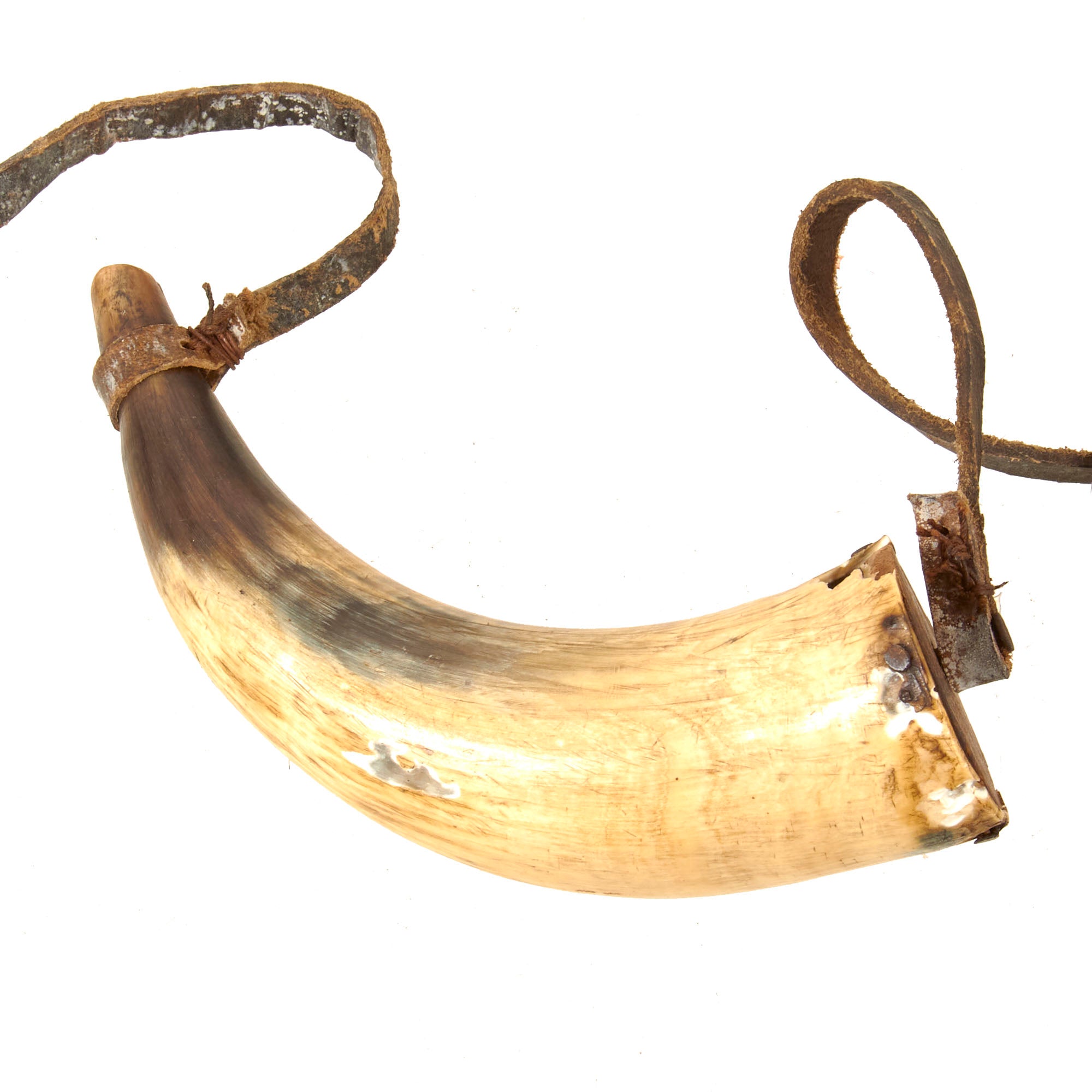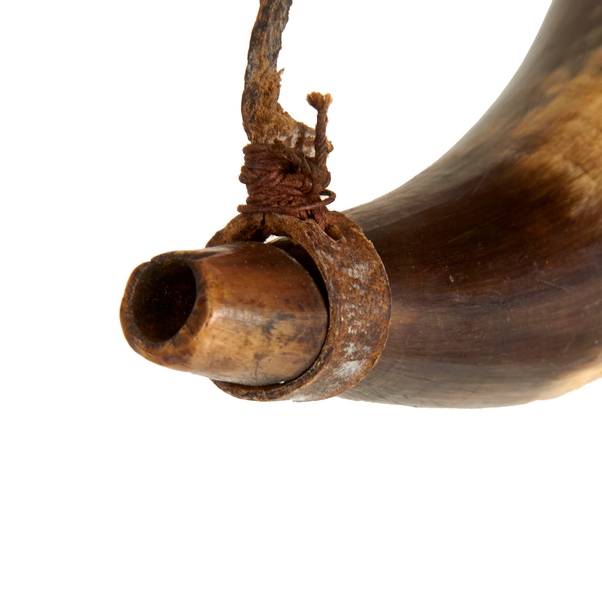 The powder horn is a small example, roughly 6 ½” long with heavy breakage of the horn material as shown. We are not sure if the stitching of the straps connecting to the horn are of the original period or added in the 19th century.