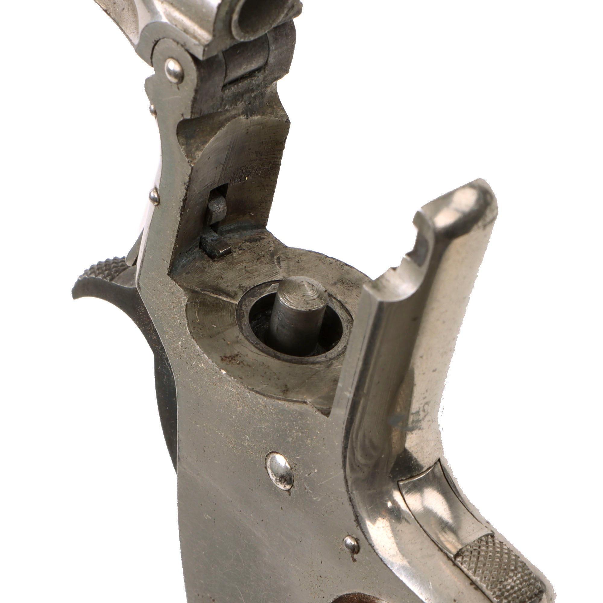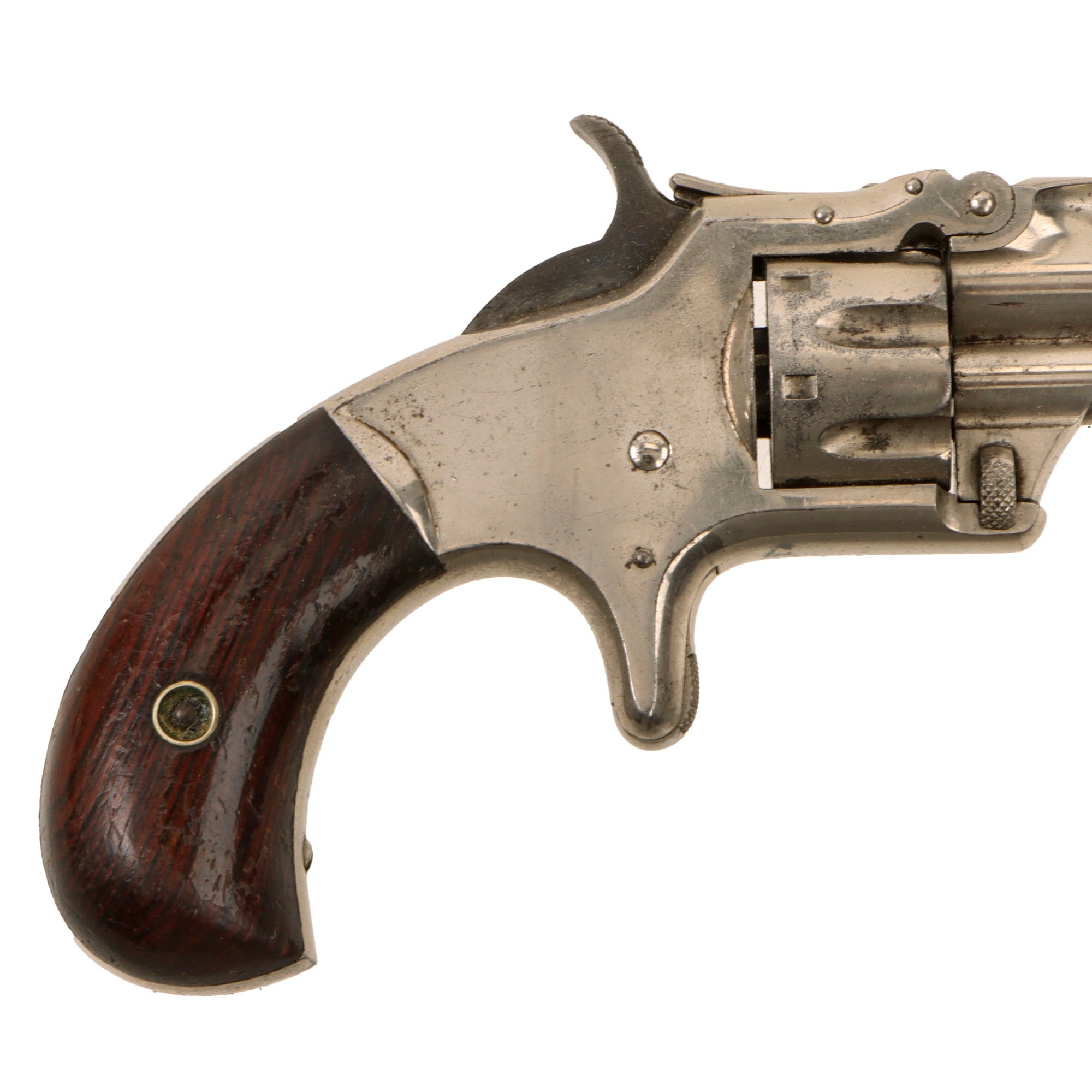 The grips are in excellent condition, and look to be made possibly made from Rosewood, as they have very dark grain streaks not seen on American Black Walnut. They still retain most of the original factory "piano varnish" applied to them, and show no major damage. The revolver functions beautifully, with a crisp action, solid cylinder lockup, and accurate indexing. We did not notice any of the finicky behavior we often see on early cartridge revolvers such as these. The bore is in very good condition, showing a bright finish with crisp lands and grooves. There is just a bit of past wear and fouling, now cleaned away.