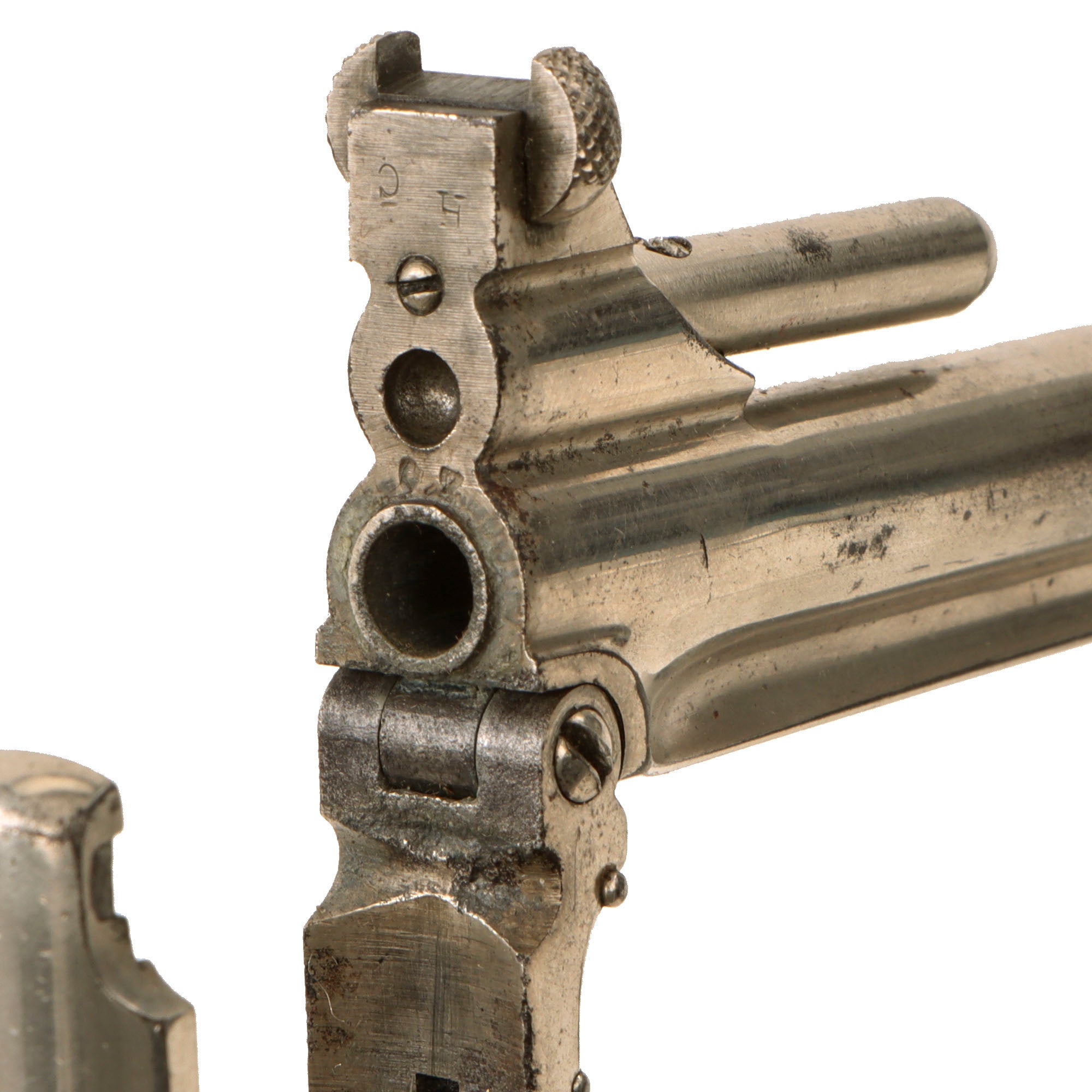 This lovely light barely example is the nickel-plated version, and is the best we have ever seen, retaining the nickel plating almost completely. The markings are all still crisp, so this was not a re-finish: it is all original. These early Smith & Wesson designs are loaded by actually unhooking the bottom of the barrel so it could swivel upwards allowing the entire cylinder to be removed in order to reload. Fitted with spur trigger, these were an extremely convenient little multi shot revolver ideal for a lady or gambler. The markings along the top of the barrel are crisp and clear:-