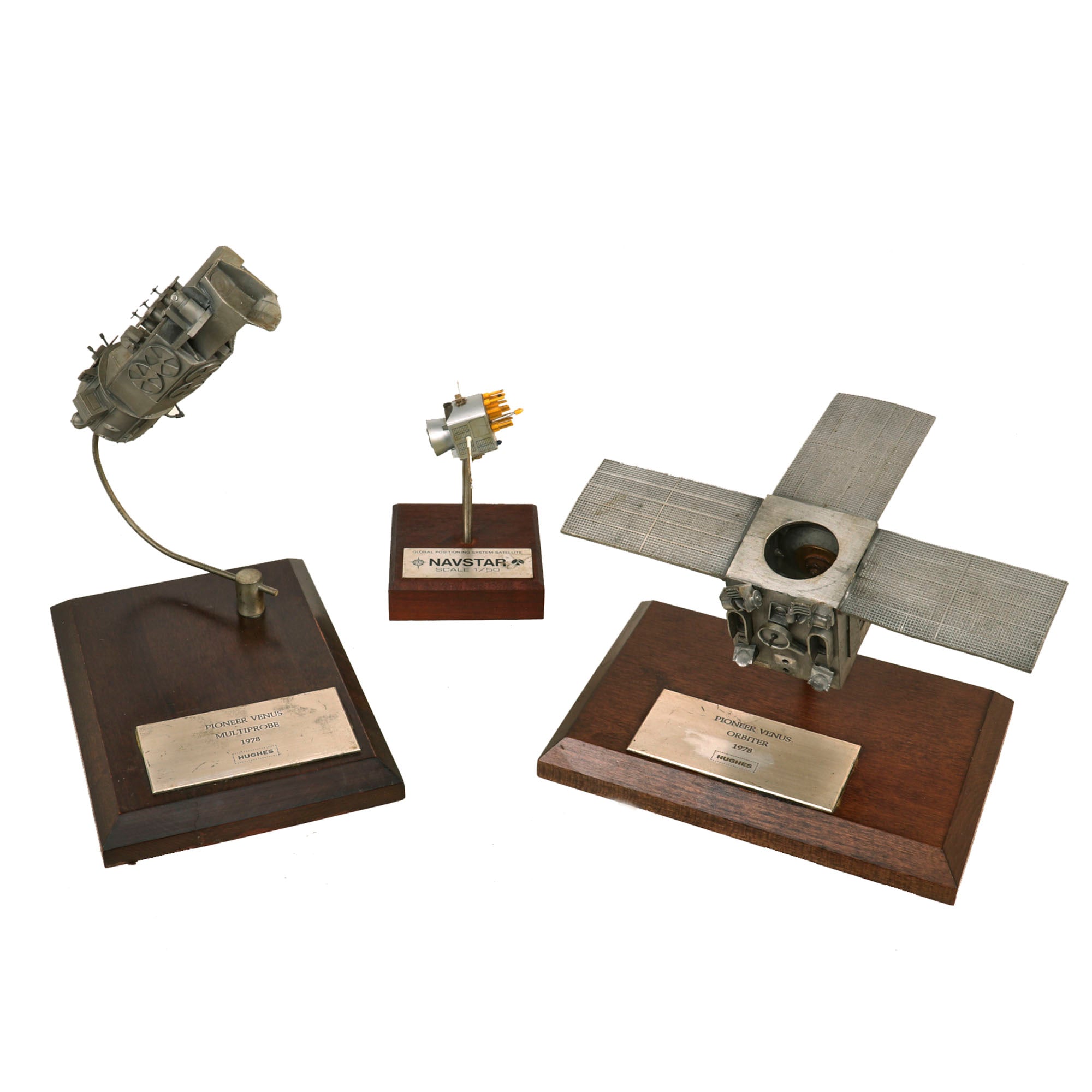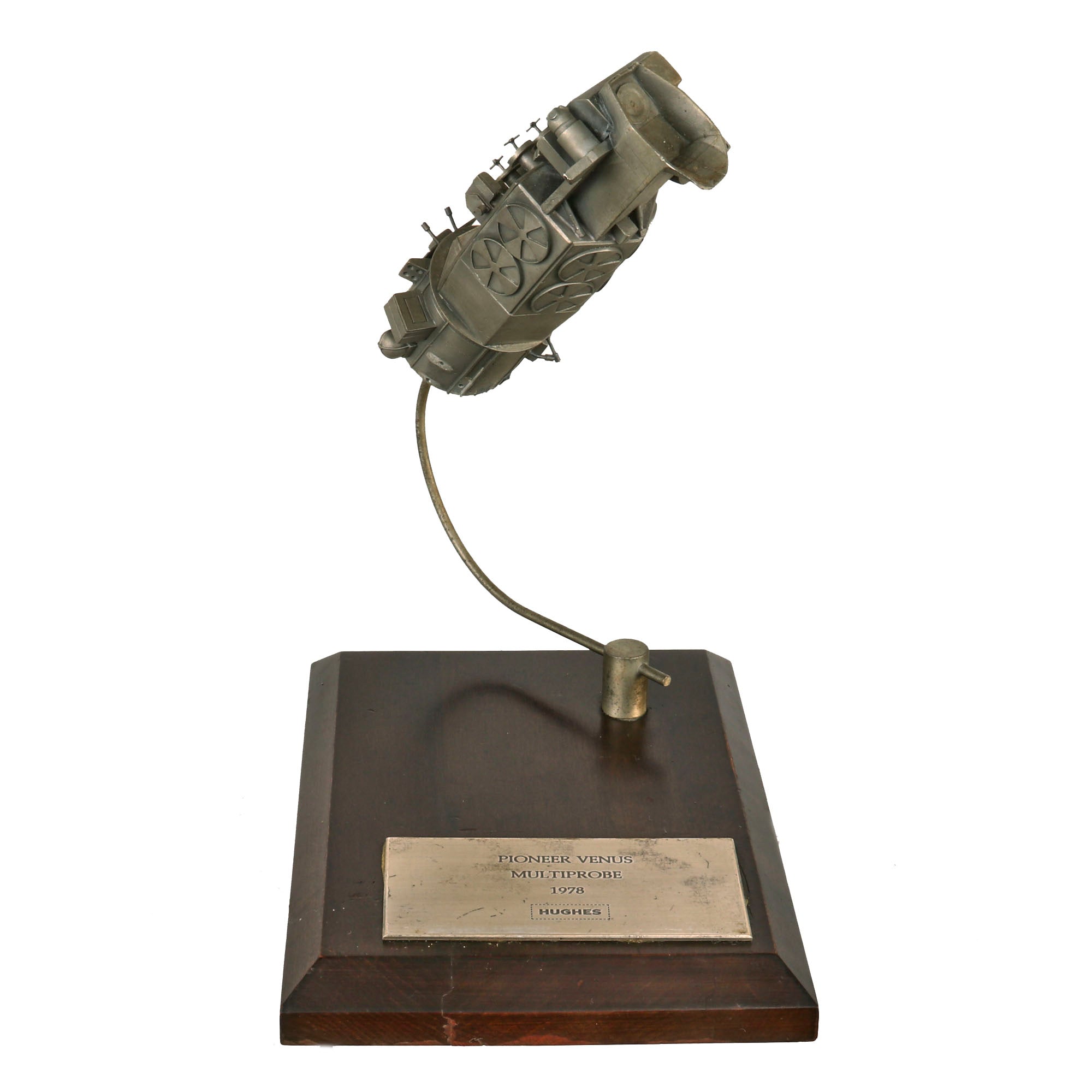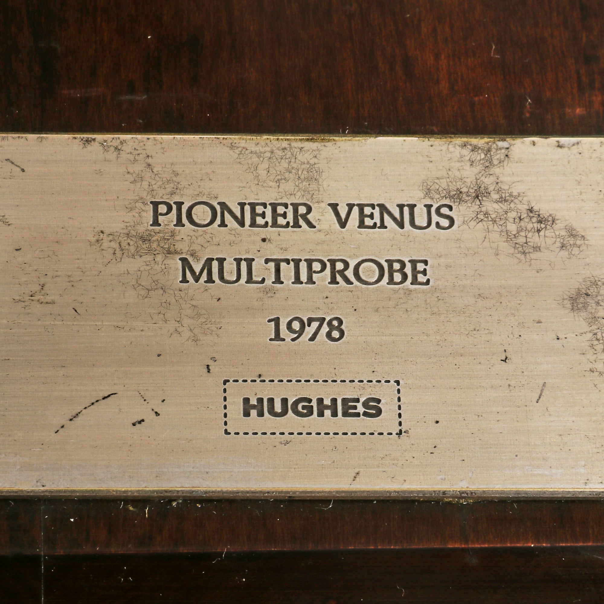 - Pioneer Venus Multiprobe - Launched in 1978 to explore Venus as part of NASA's Pioneer program. This part of the mission included a spacecraft bus which was launched from Earth carrying one large and three smaller probes, which after separating penetrated the Venusian atmosphere at a different location, returning data as they descended into the planet's thick atmosphere. The entry occurred on December 9, 1978. The model measures 5 x 7 x 8½” with the model suspended by a rod that gives the impression of floating. Dated 1978 by HUGHES.