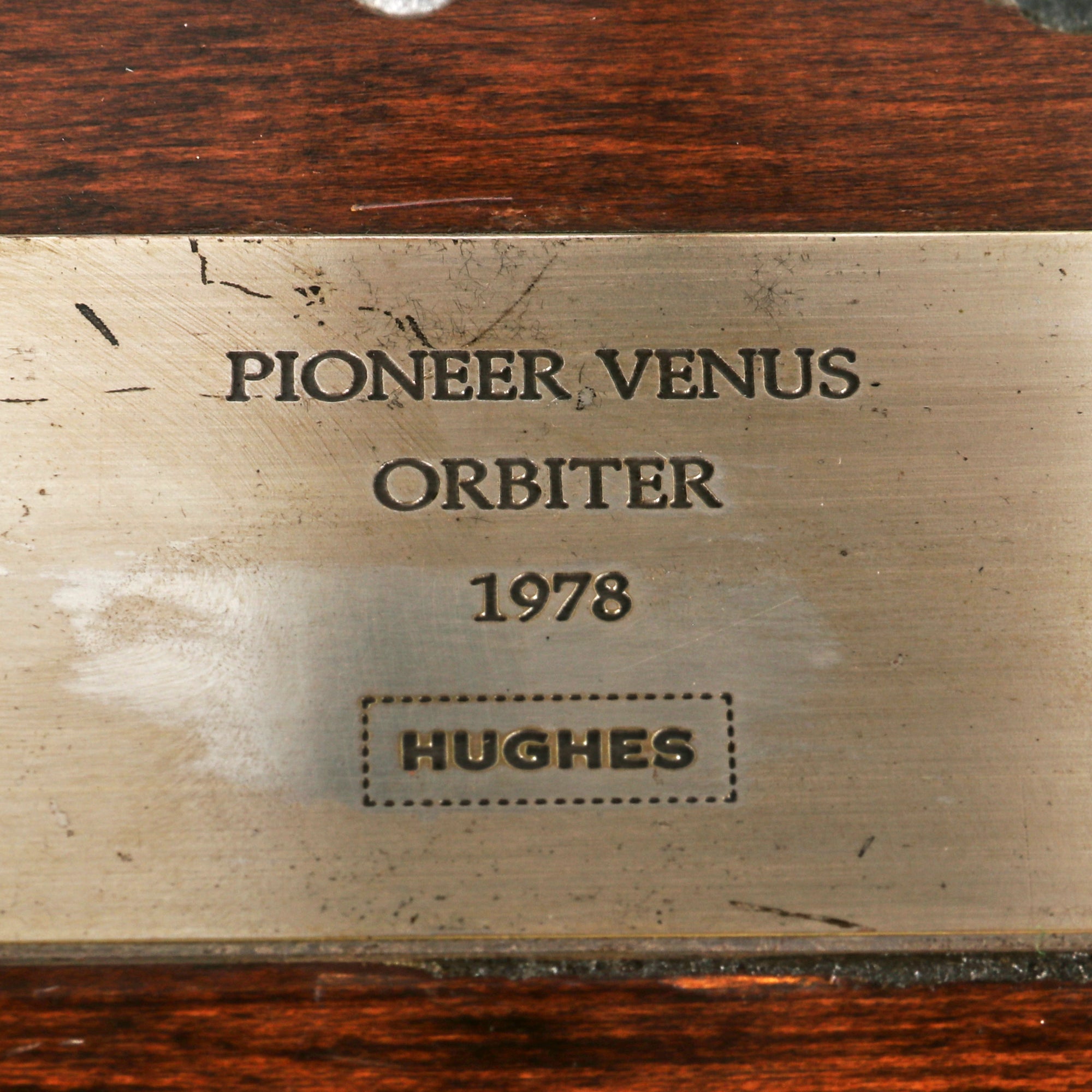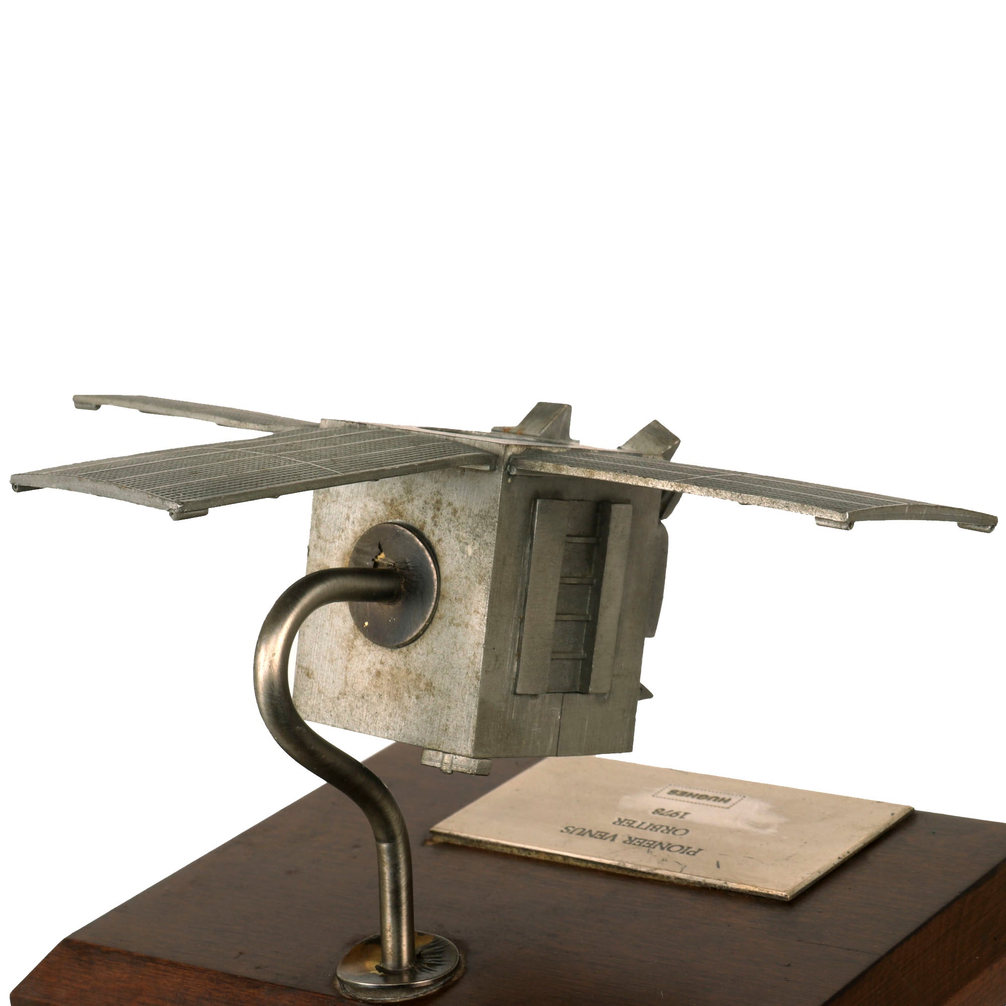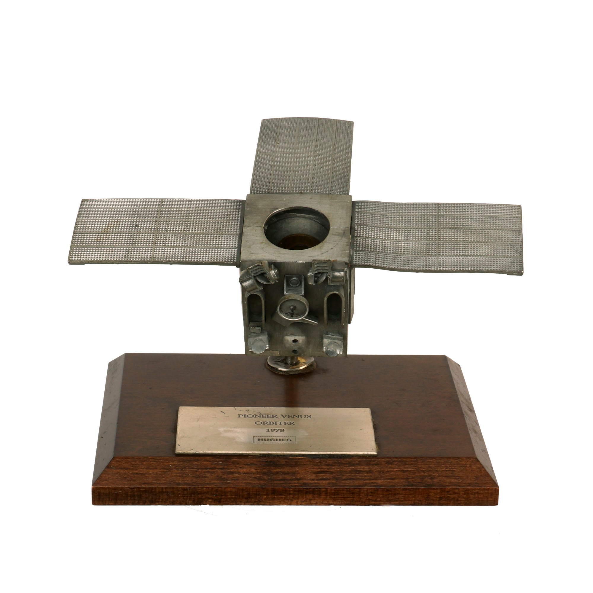 - Pioneer Venus Orbiter - Launched in May 1978 atop an Atlas-Centaur rocket, the spacecraft was inserted into an elliptical orbit around Venus on December 4, 1978. It returned data from Venus until October 1992. The model measures 8 x 6½ x 5” and is a great example, but it may be missing some parts. Some paint is chipping from the base. Dated 1978 by HUGHES.