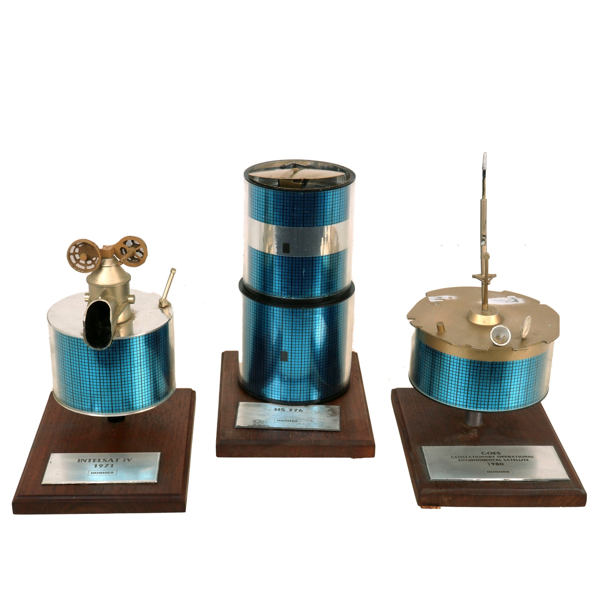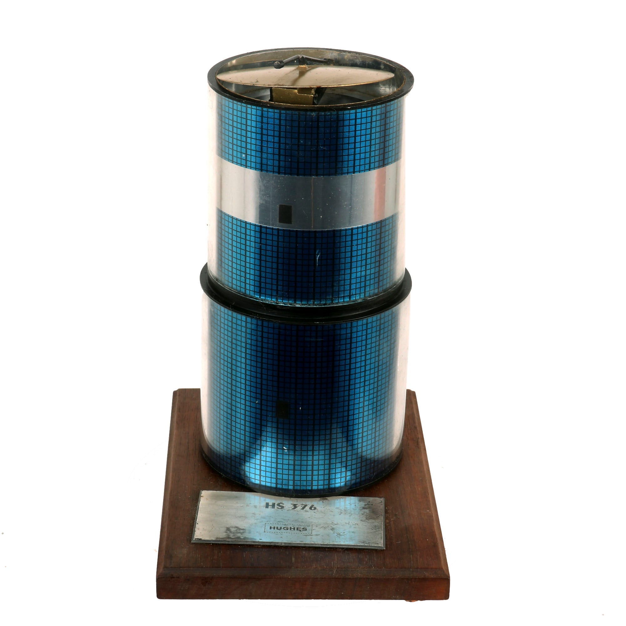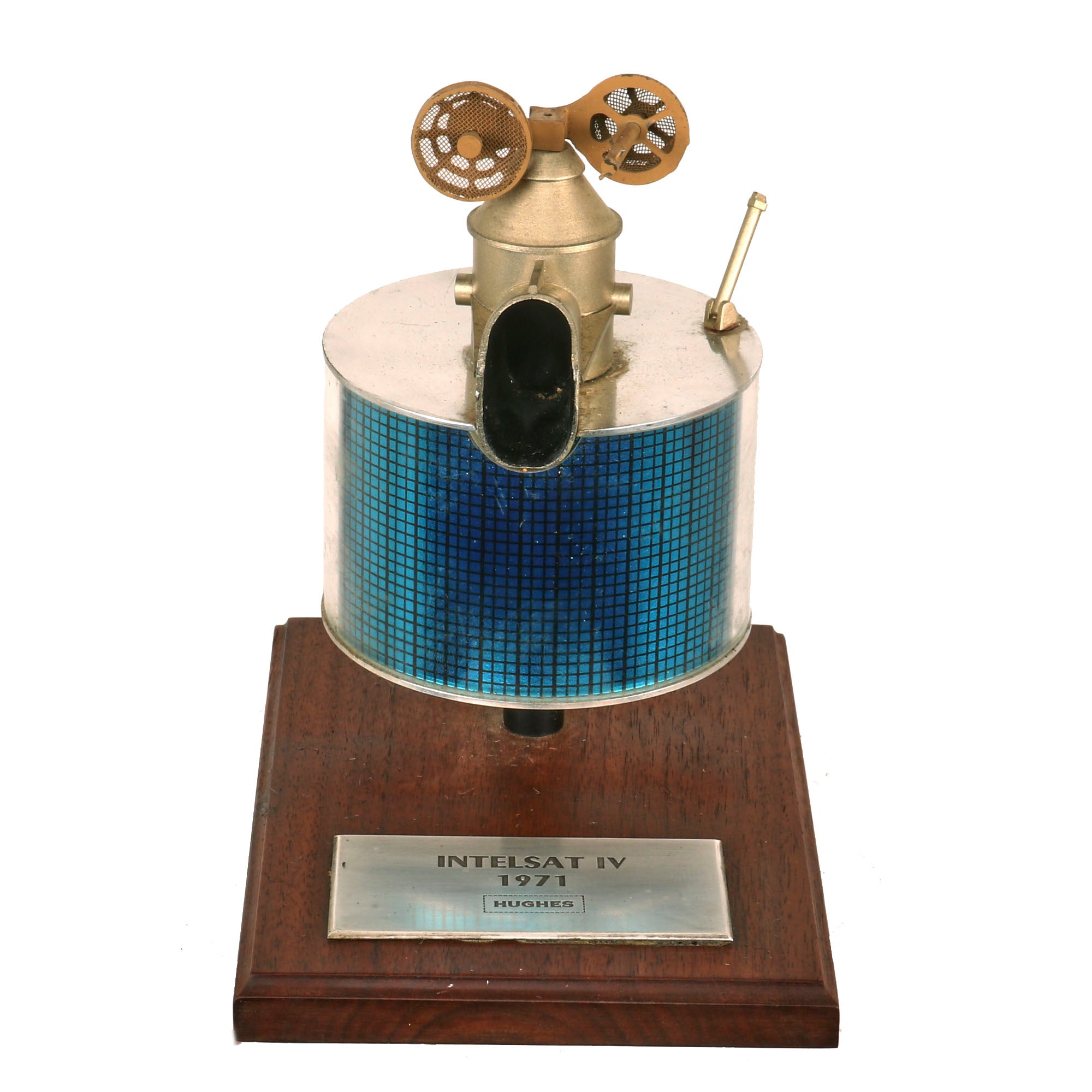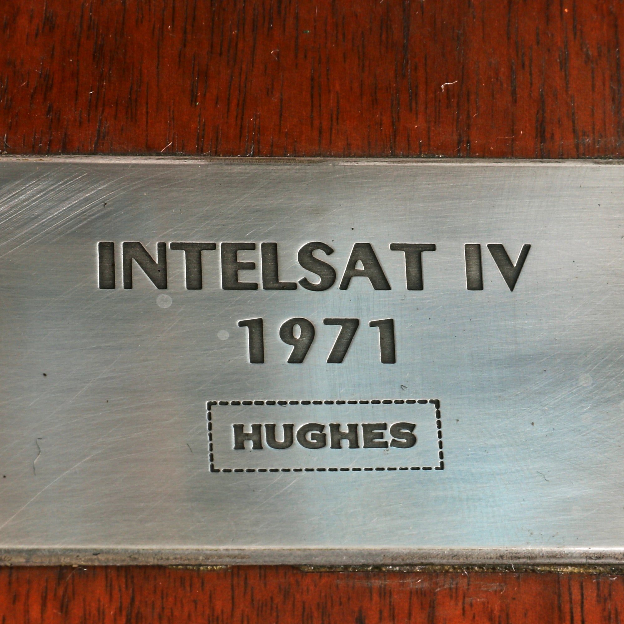- Intelsat IV - Intelsat IV F-4 was a geostationary communication satellite built by Hughes, it was owned by Intelsat. The satellite was based on the HS-312 platform and its estimated useful life was 7 years. The Intelsat IV F-4 was part of the Intelsat IV series which consisted of eight communications satellites, launched from Cape Canaveral during the early 1970s, marked the fifth generation of geostationary communications satellites developed by the Hughes Aircraft Company since 1963 with the launch of Syncom II, the world's first synchronous satellite. The Syncom II was 15 cm high and 28 inches in diameter, weighing 78 Lbs in orbit. In contrast, the Intelsat IVs weighed more than 1,300Lbs (595 kg) into orbit and were more than 17 feet (5.2 meters) in diameter. All seven satellites exceeded their projected life expectancies and were withdrawn from active duty, the last of which, the Intelsat IV F-1 was retired in October 1987. The model measures 4½ x 6 x 6¼” and is dated 1971 by HUGHES.