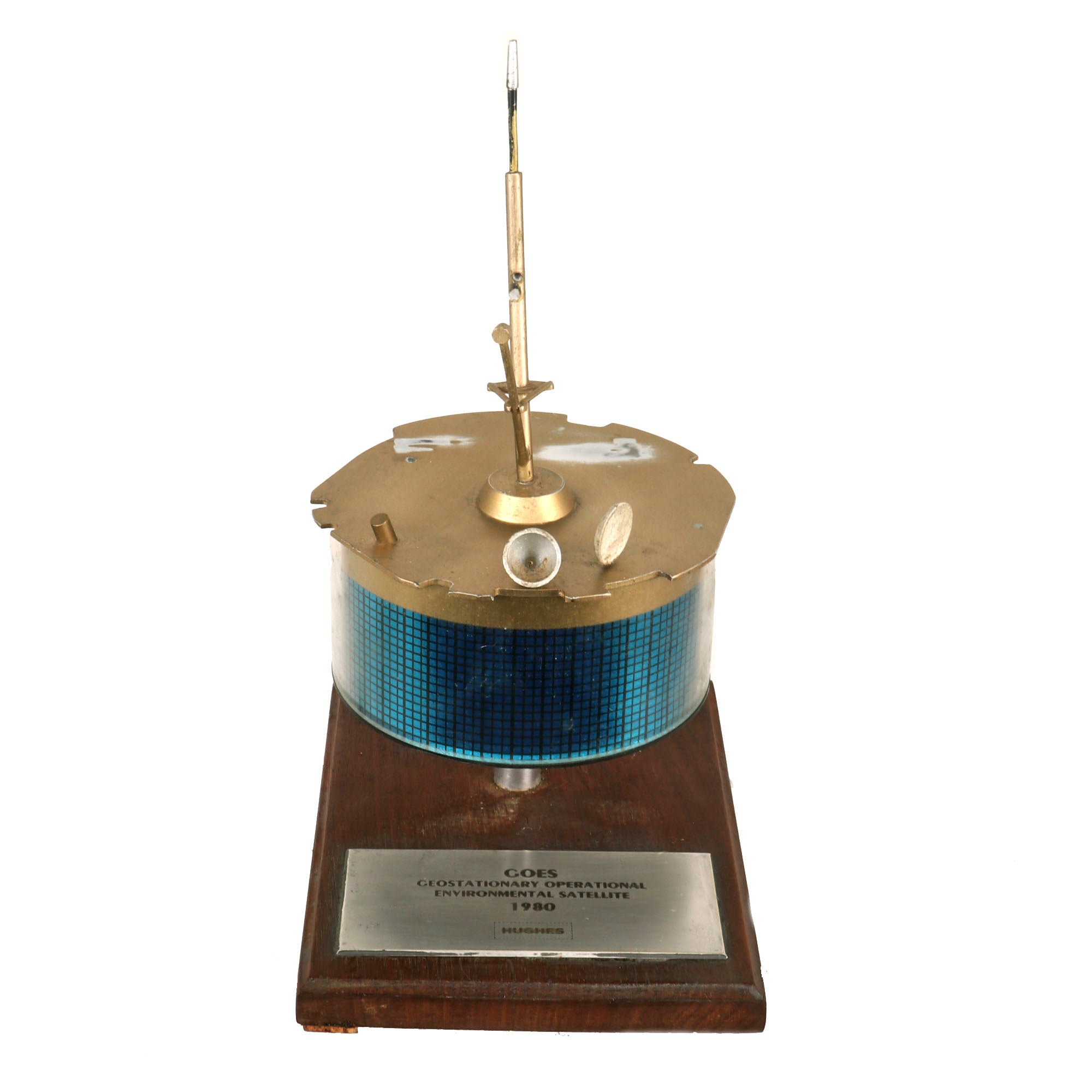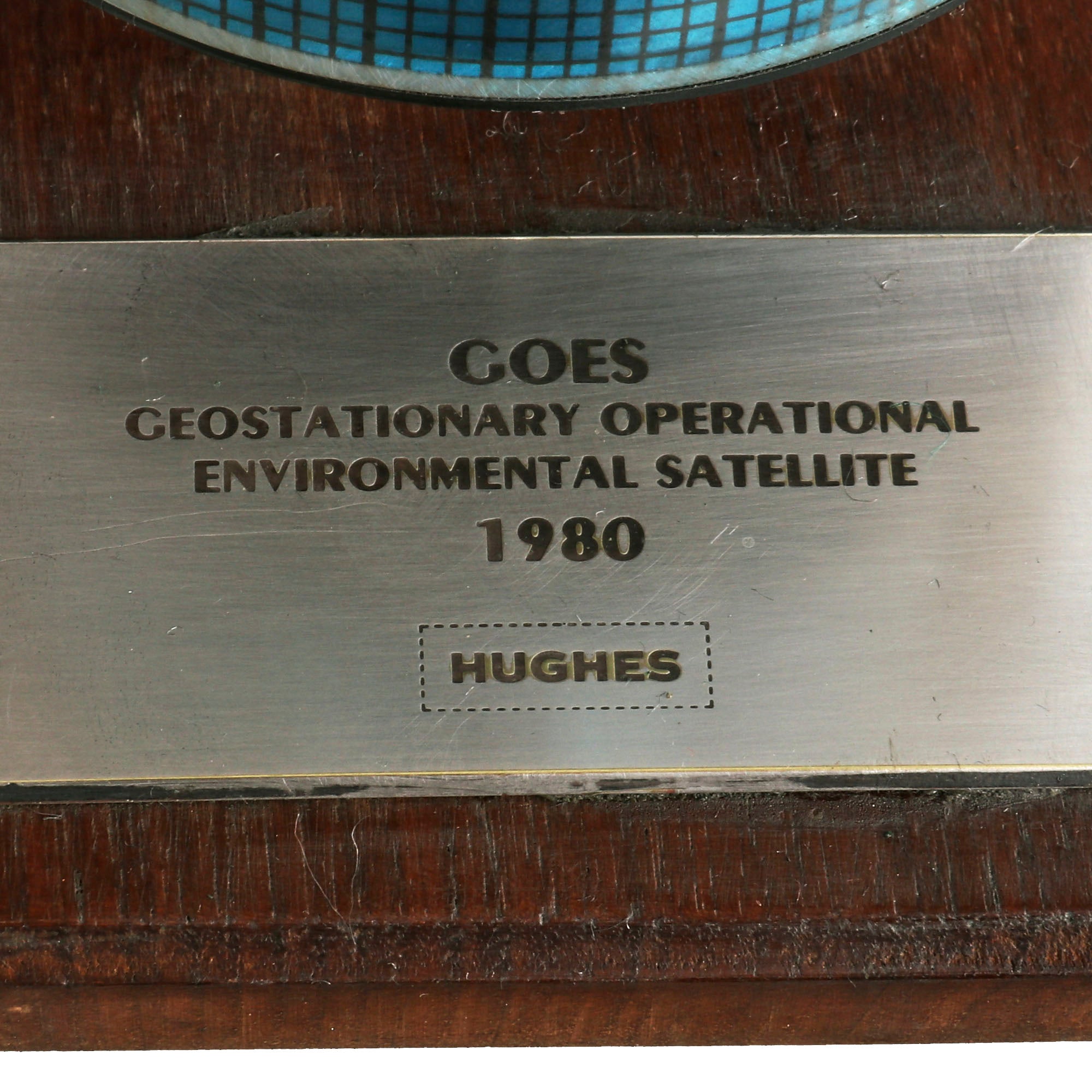 - GOES (Geostationary Operational Environmental Satellite) - The Geostationary Operational Environmental Satellite (GOES), operated by the United States' National Oceanic and Atmospheric Administration (NOAA)'s National Environmental Satellite, Data, and Information Service division, supports weather forecasting, severe storm tracking, and meteorology research. Spacecraft and ground-based elements of the system work together to provide a continuous stream of environmental data. The National Weather Service (NWS) and the Meteorological Service of Canada use the GOES system for their North American weather monitoring and forecasting operations, and scientific researchers use the data to better understand land, atmosphere, ocean, and climate dynamics. The model measures 4½ x 6 x 9” and is in fair shape. It’s dated 1980 by HUGHES.