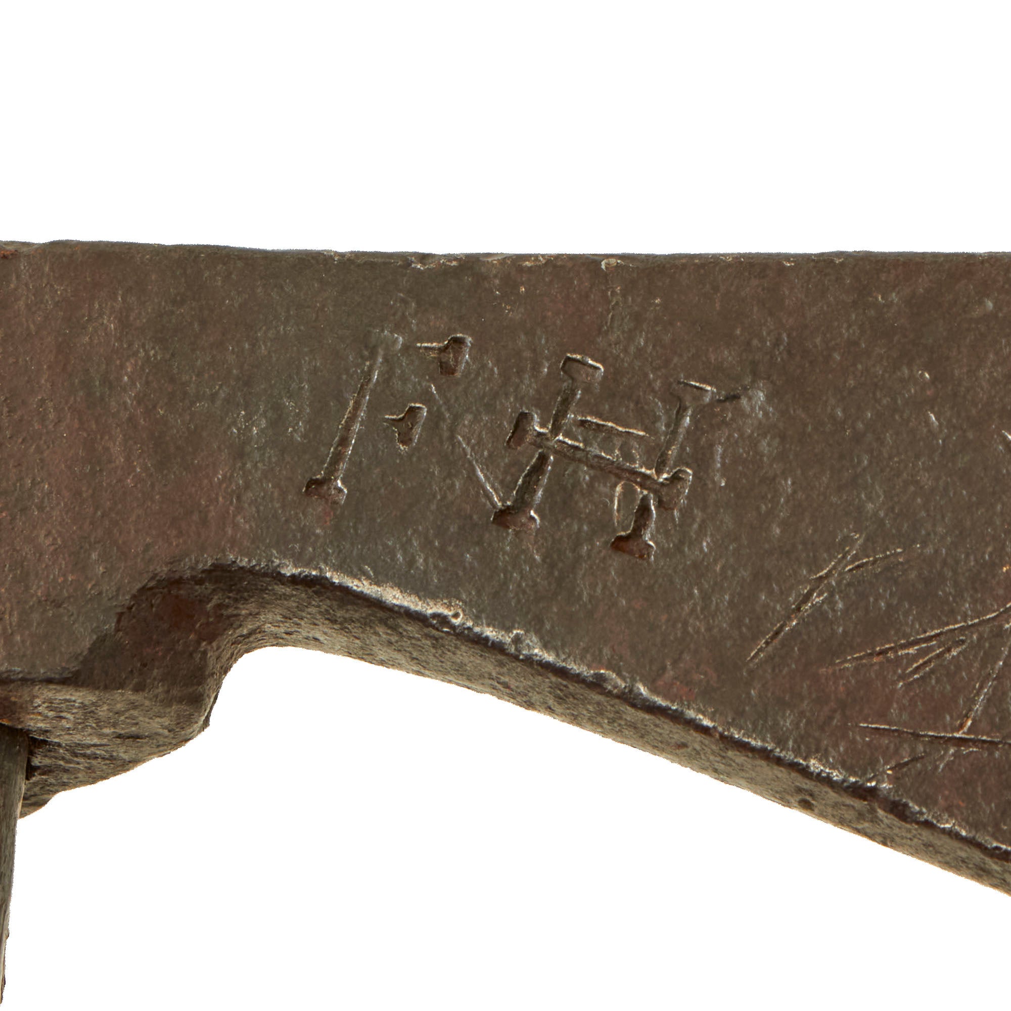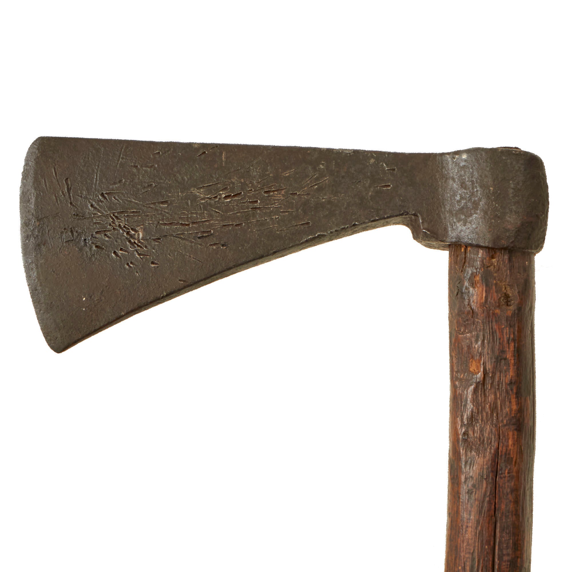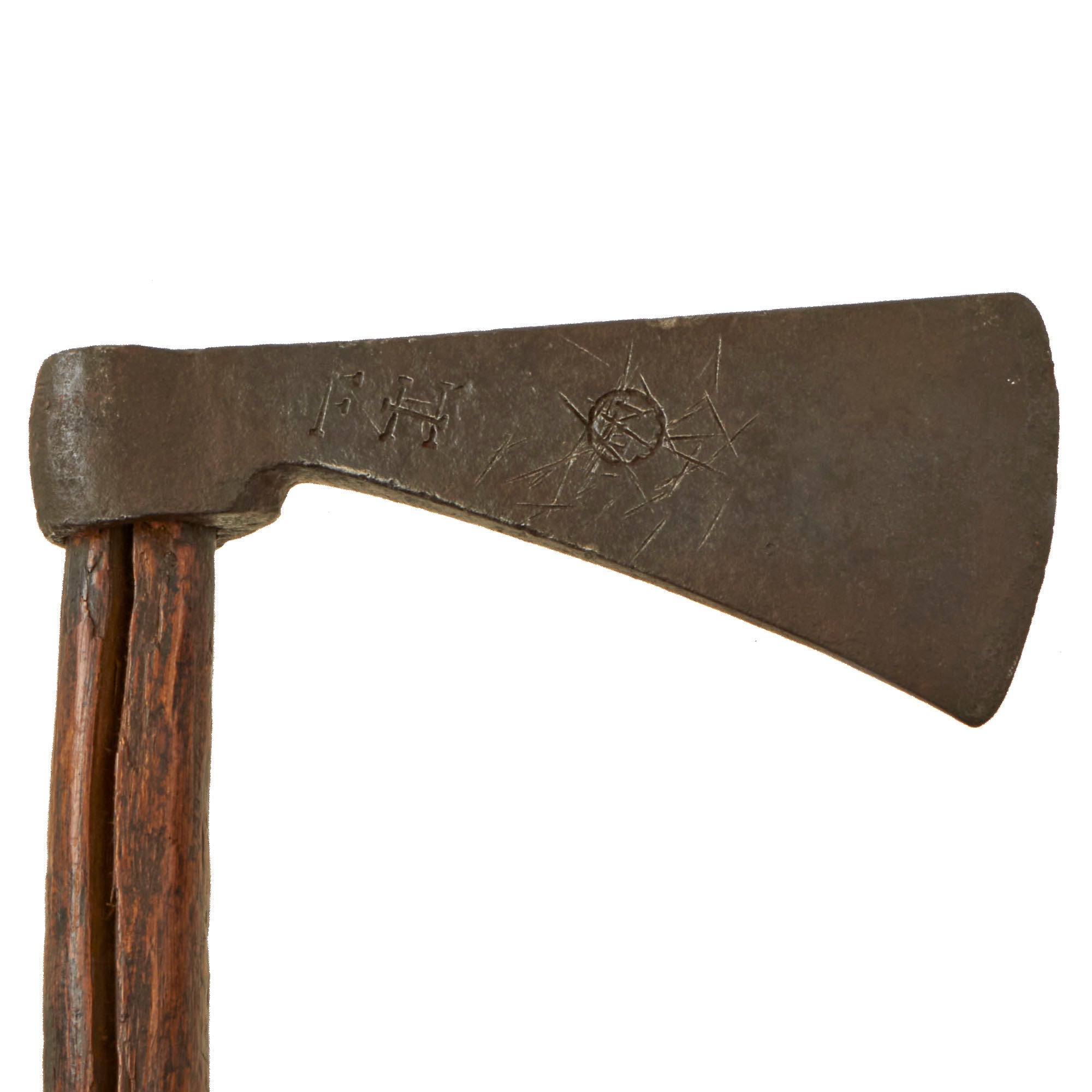The length of the head of the tomahawk measures approximately 8 1/2 inches with an edge width of 3 ¾ inches, while the handle is about 30 1/8 inches long. There are some small chips in the edge. There is a blacksmith marking present that reads 'F.H. (E)’ although we have not been able to find any reliable information regarding this marking. Both sides of the head show heavy period nicks/slashes in the finish. A good research project.