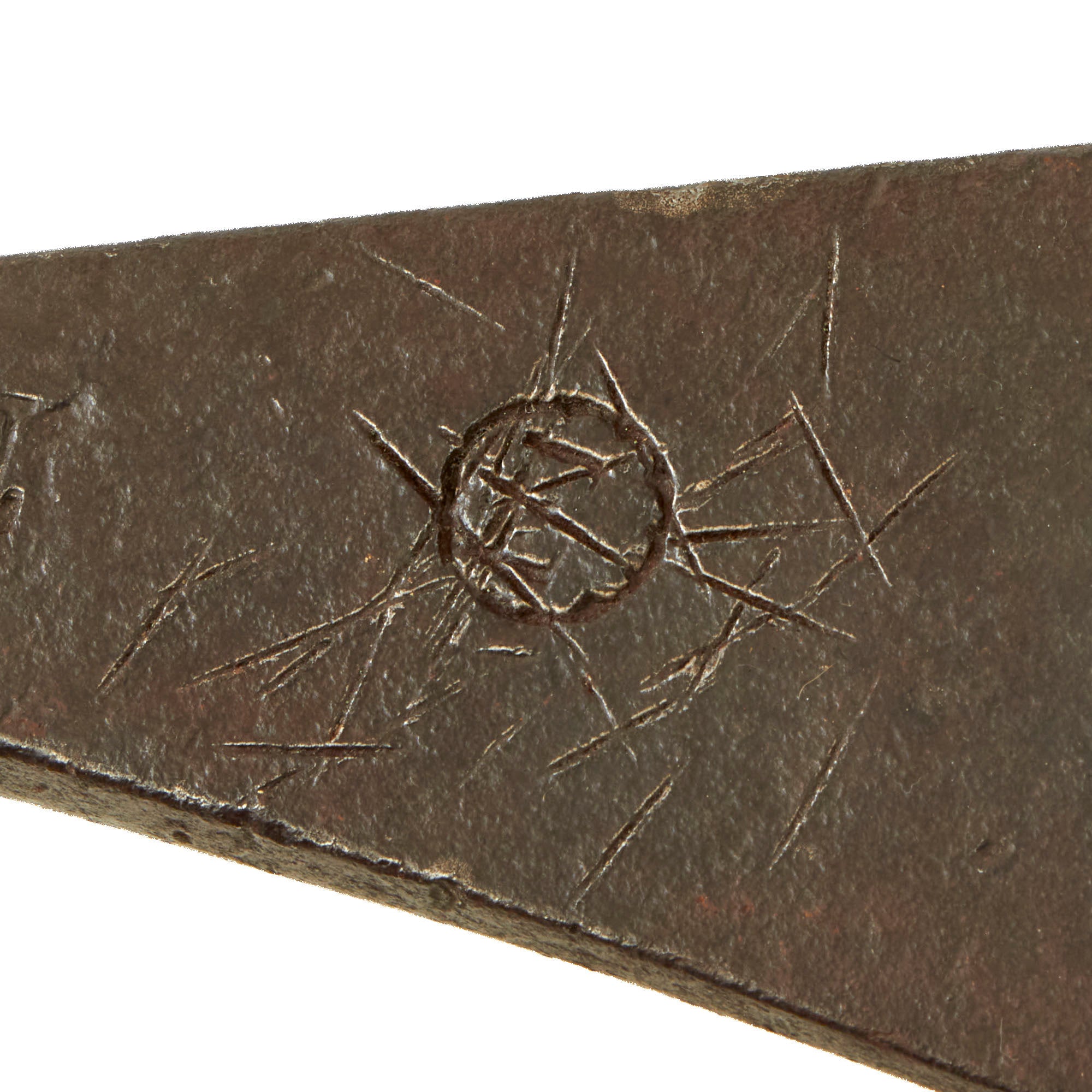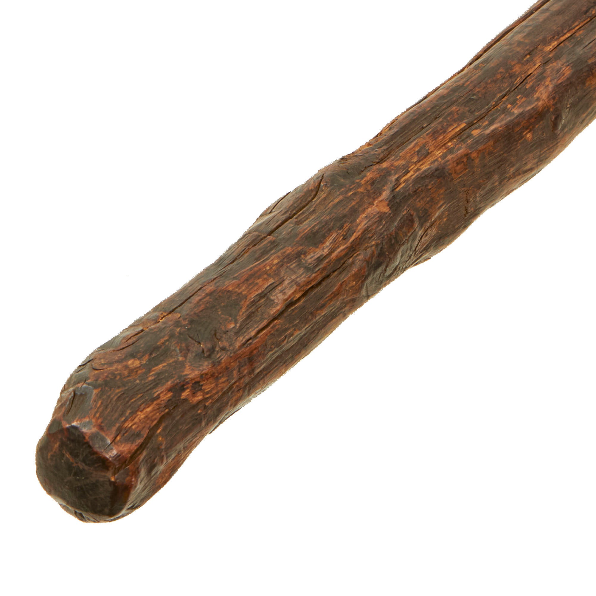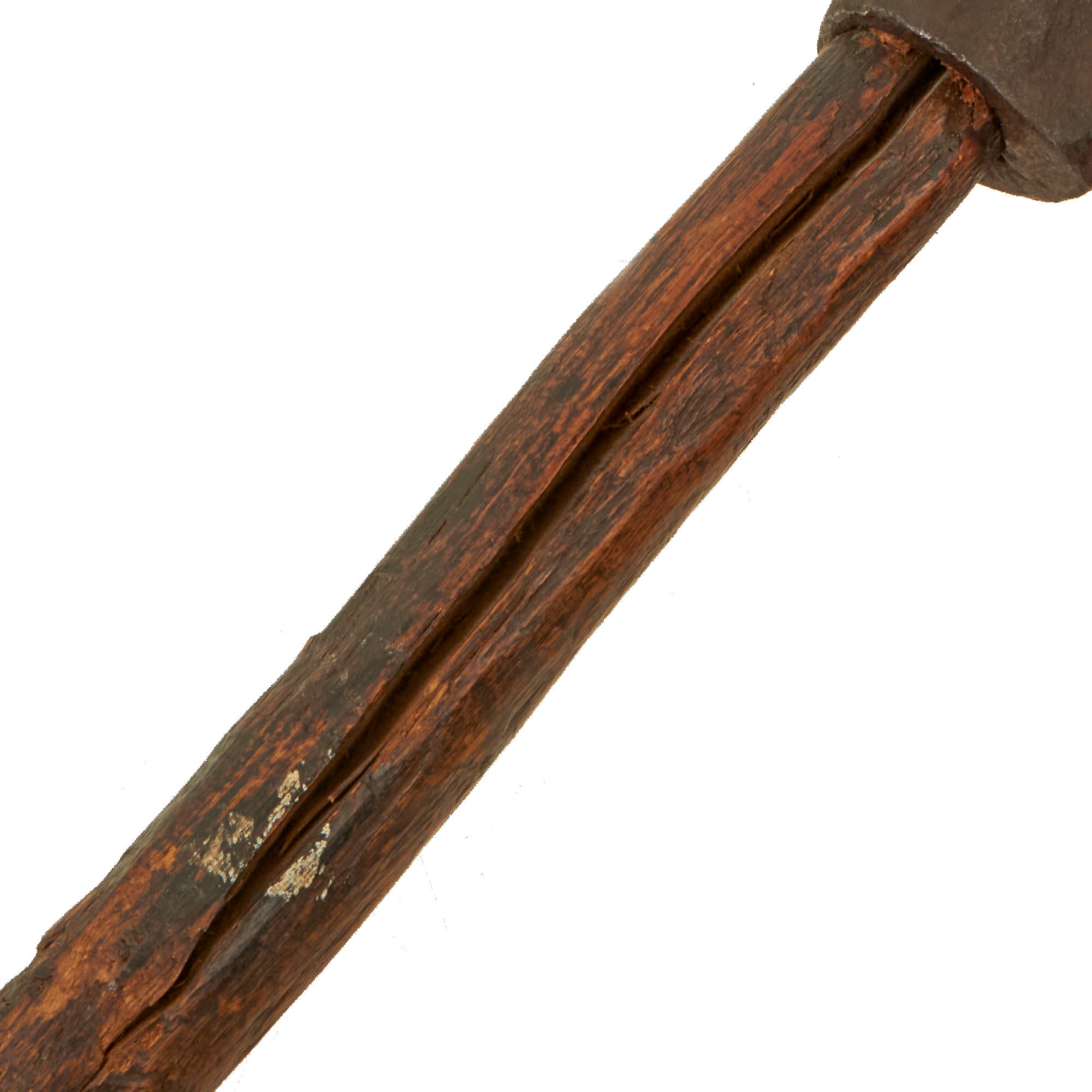 The length of the head of the tomahawk measures approximately 8 1/2 inches with an edge width of 3 ¾ inches, while the handle is about 30 1/8 inches long. There are some small chips in the edge. There is a blacksmith marking present that reads 'F.H. (E)’ although we have not been able to find any reliable information regarding this marking. Both sides of the head show heavy period nicks/slashes in the finish. A good research project.