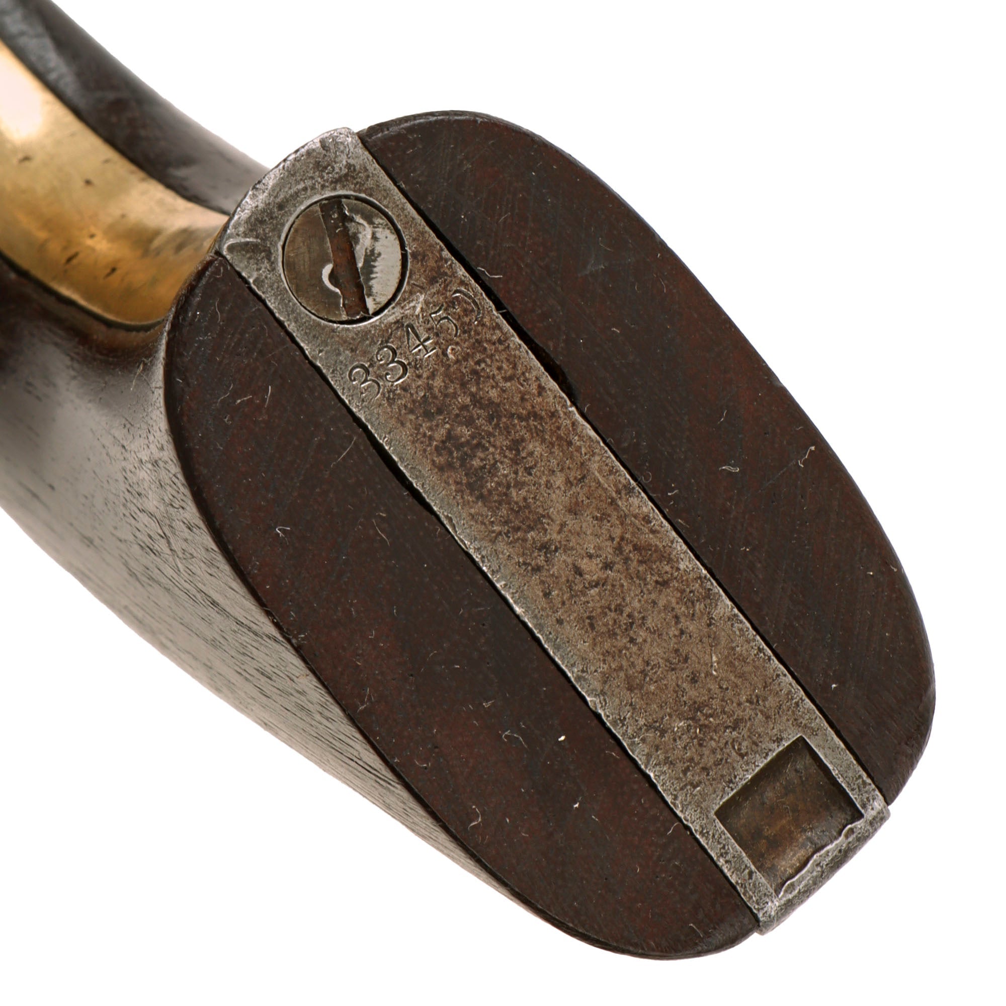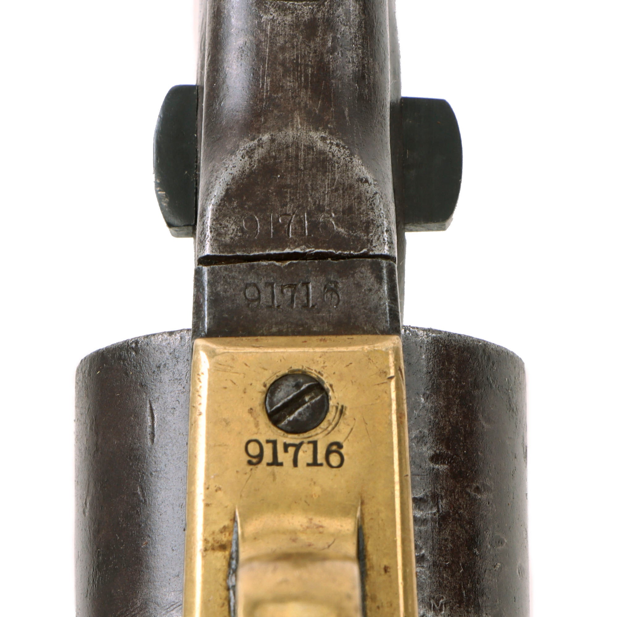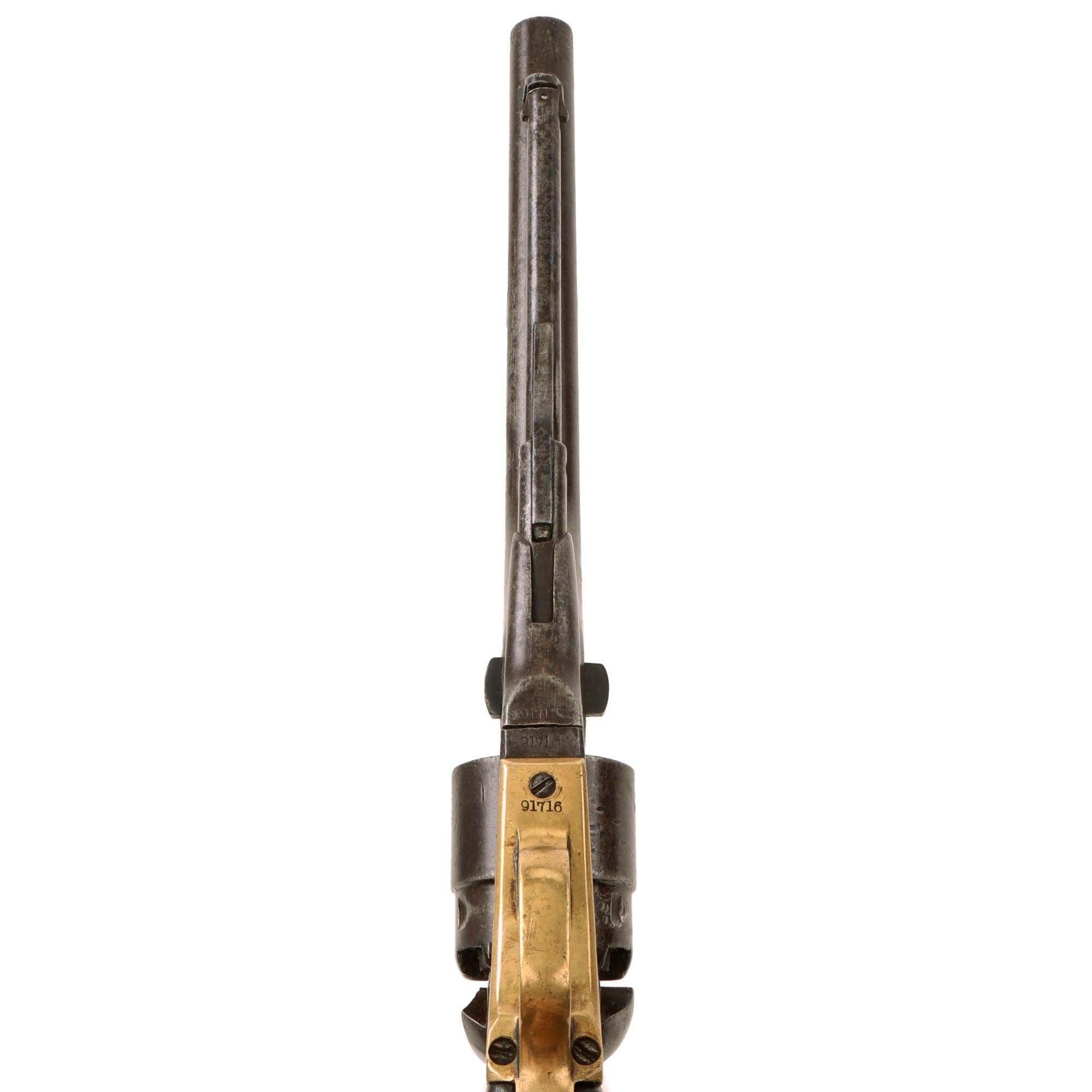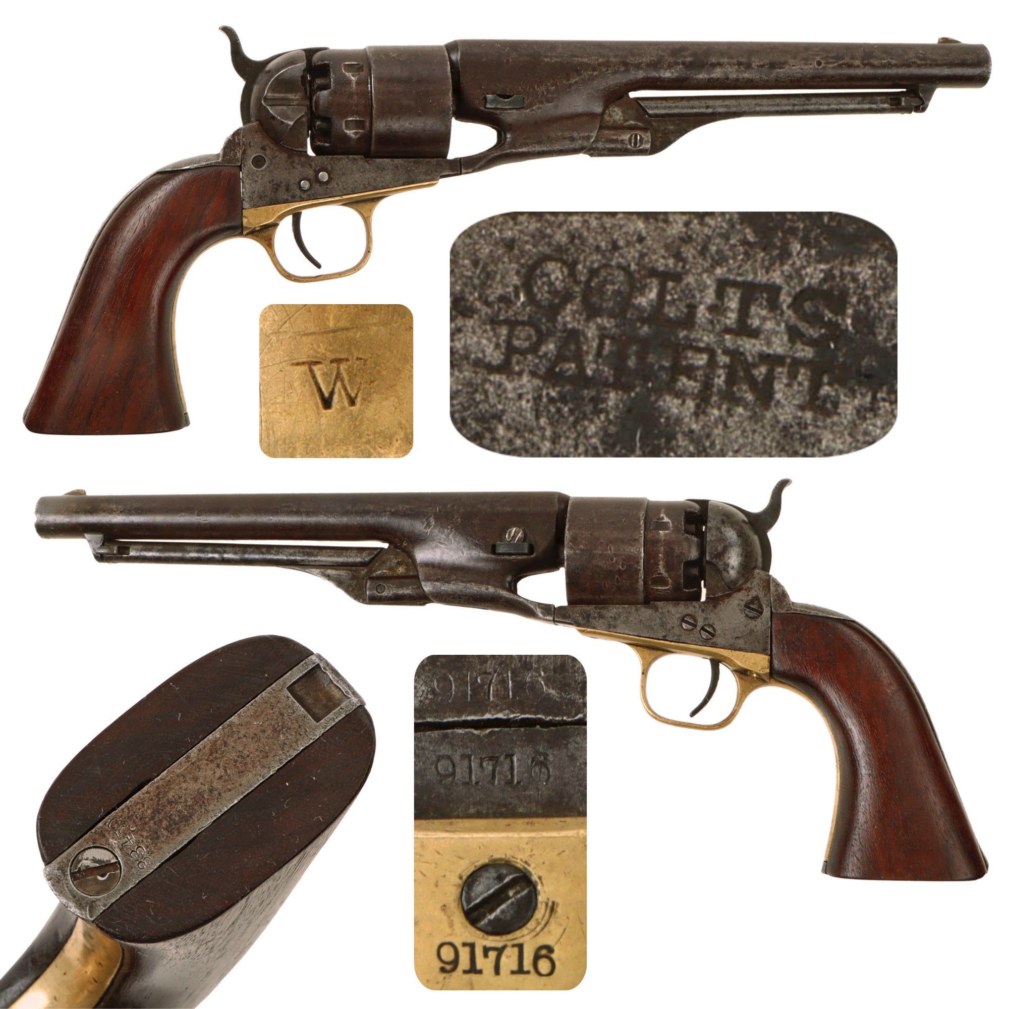 The barrel, frame, and trigger guard all bear matching serial number 91716. This means that it was produced during Colt’s 1863 production, which ran from approximately #85,000 to #150,000. Produced during the height of the Civil War, it almost certainly saw long service in the conflict, and possibly afterwards. The cylinder and arbor pin are both marked with shortened number 1716, while the barrel wedge is an unmarked recent replacement. The grip frame is marked with number 33459, so it was swapped out at arsenal long ago to replace a broken one, and the grip itself was replaced as well, as the original was almost certainly destroyed when the frame was broken.
