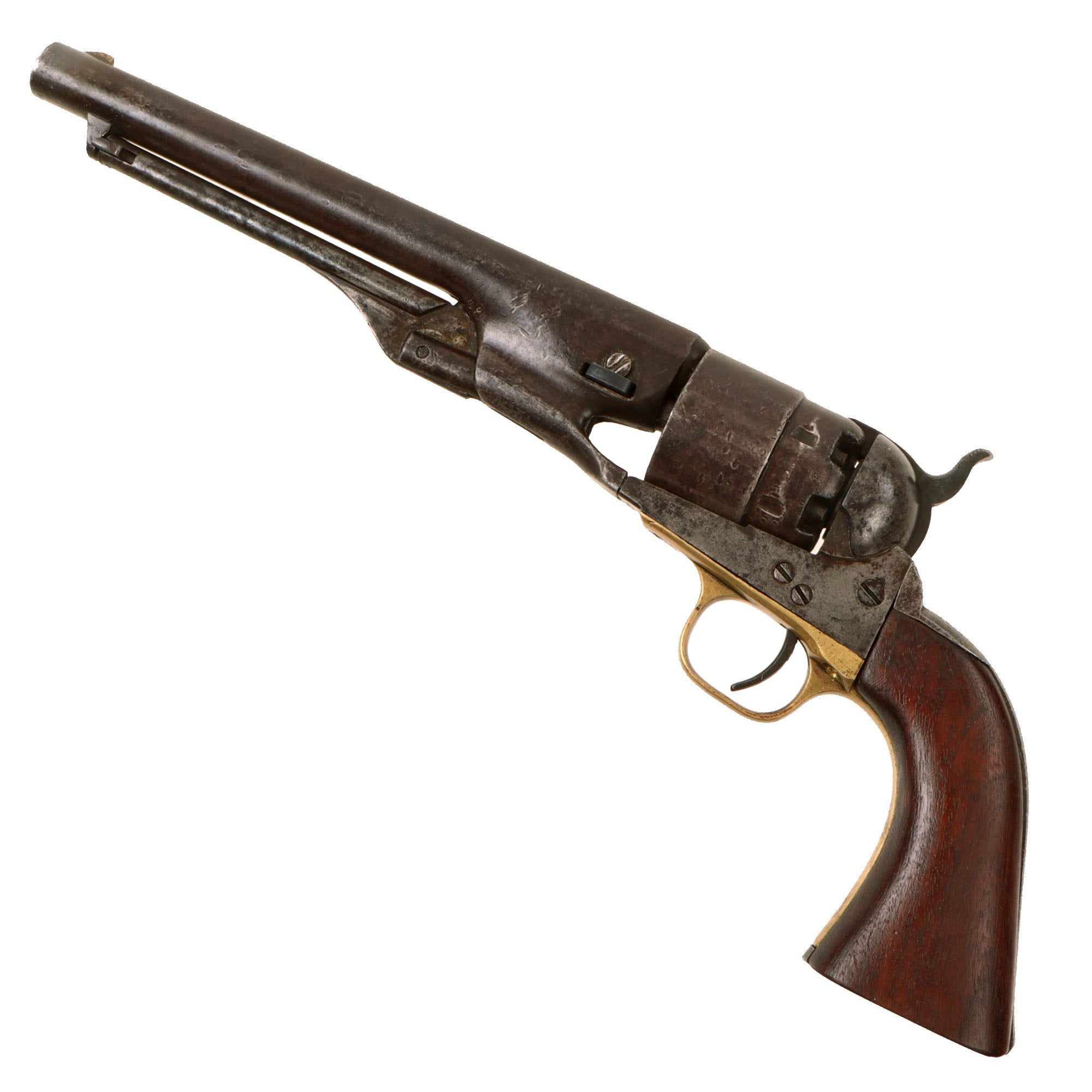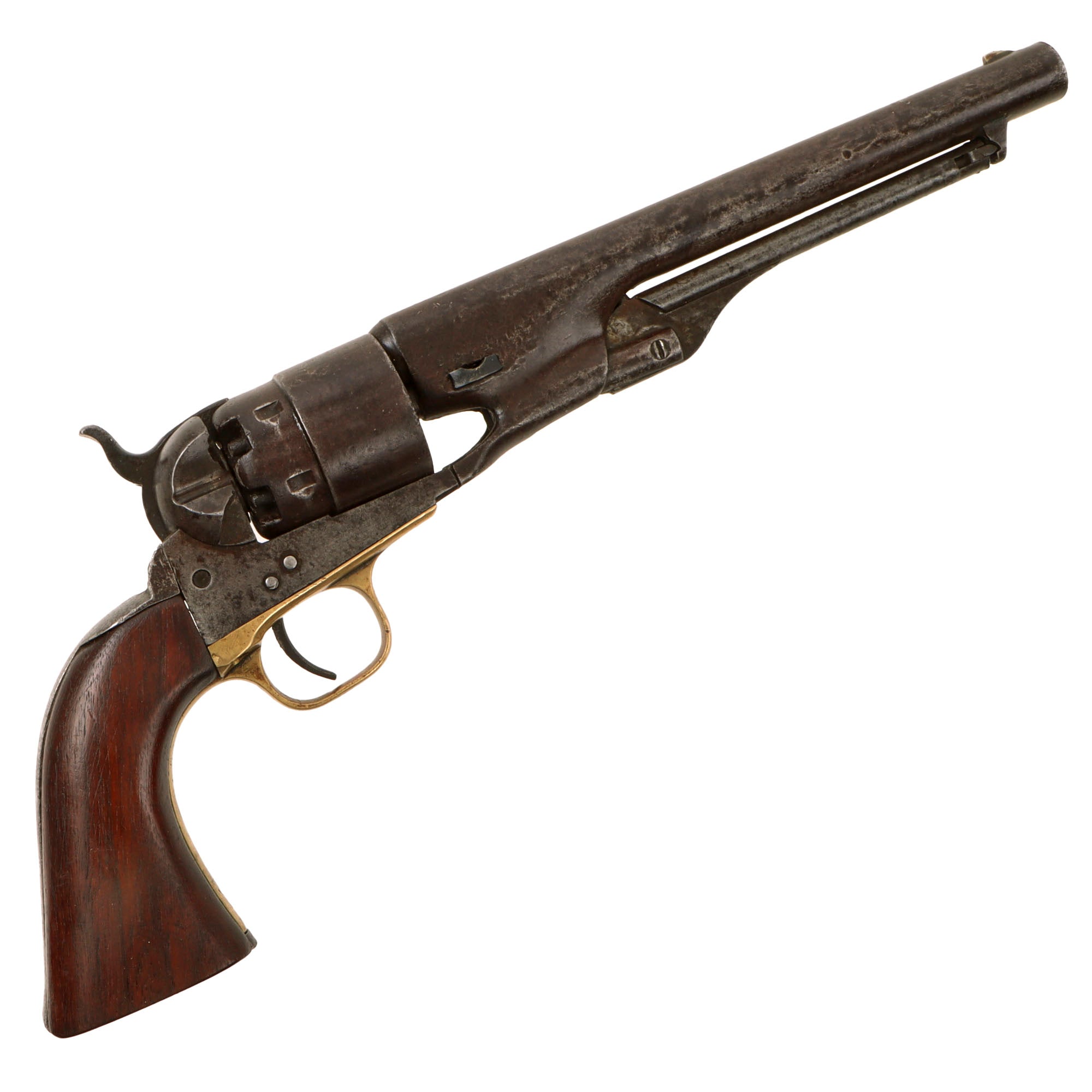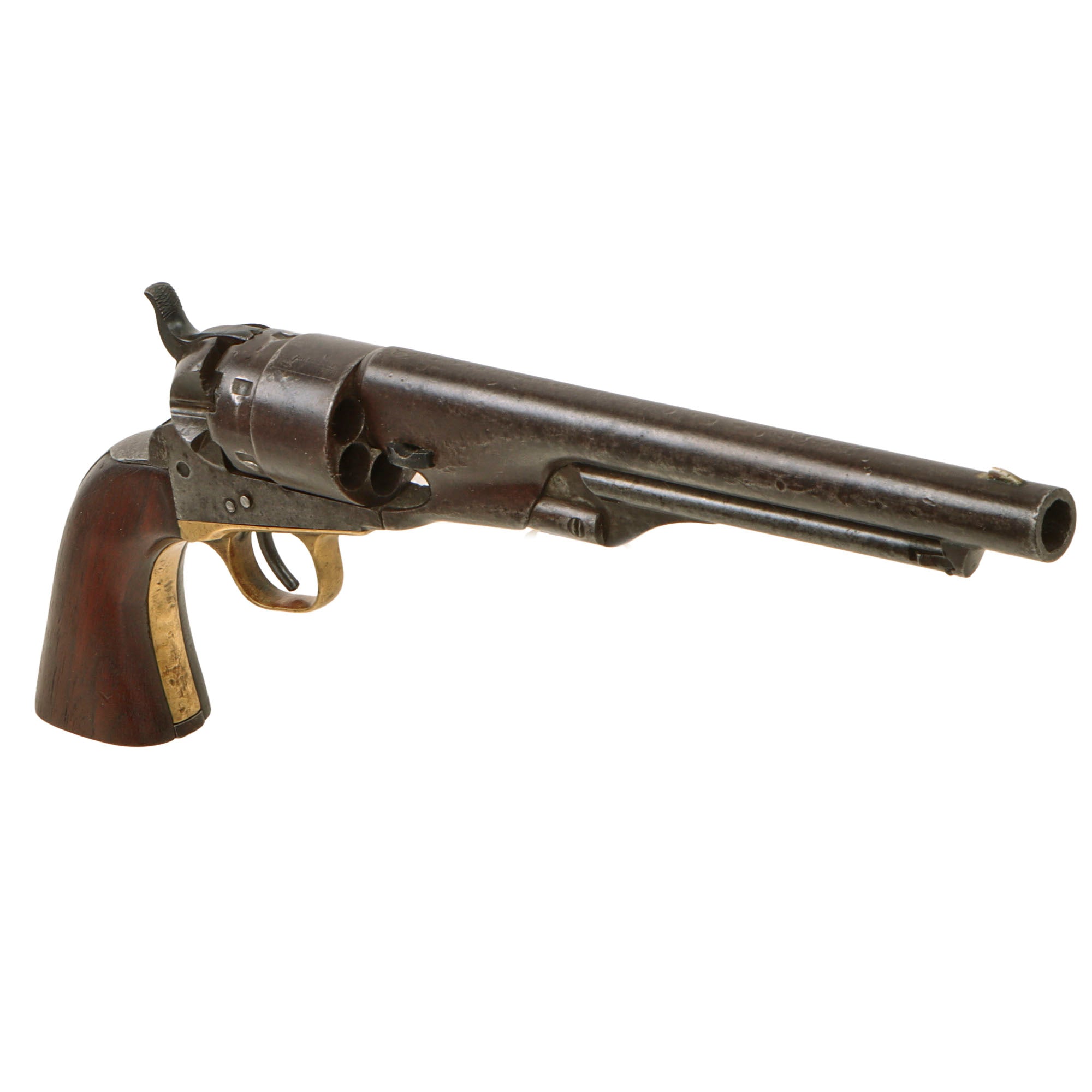 The unfluted cylinder was 'rebated,' meaning that the rear of the cylinder was turned to a smaller diameter than the front. The barrel was rounded and smoothed into the frame, as was the Navy Model. The frame, hammer, and rammer lever were case-hardened, the remainder blued; grips were of one-piece walnut; and the trigger guard and front grip strap were of brass while the backstrap was blued."