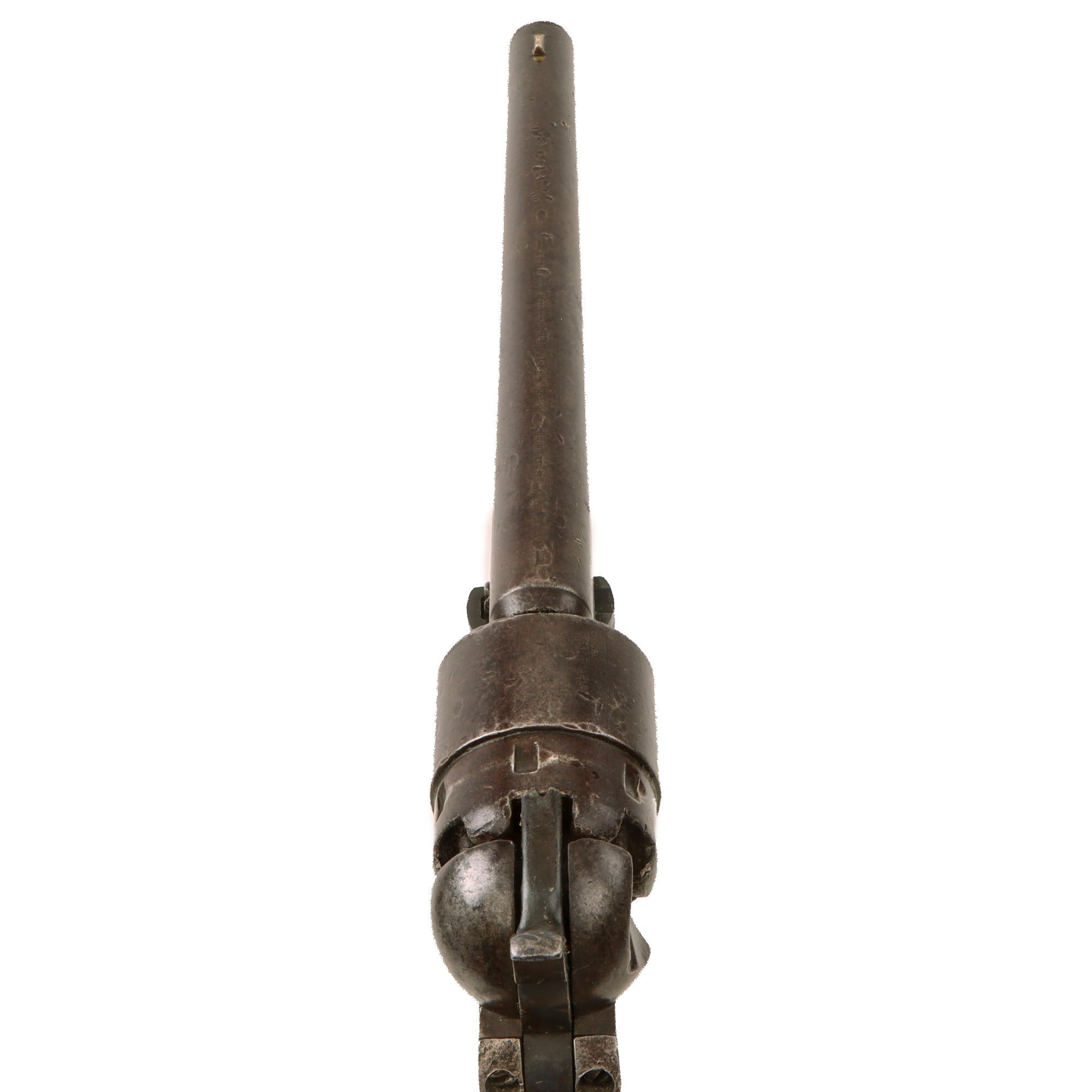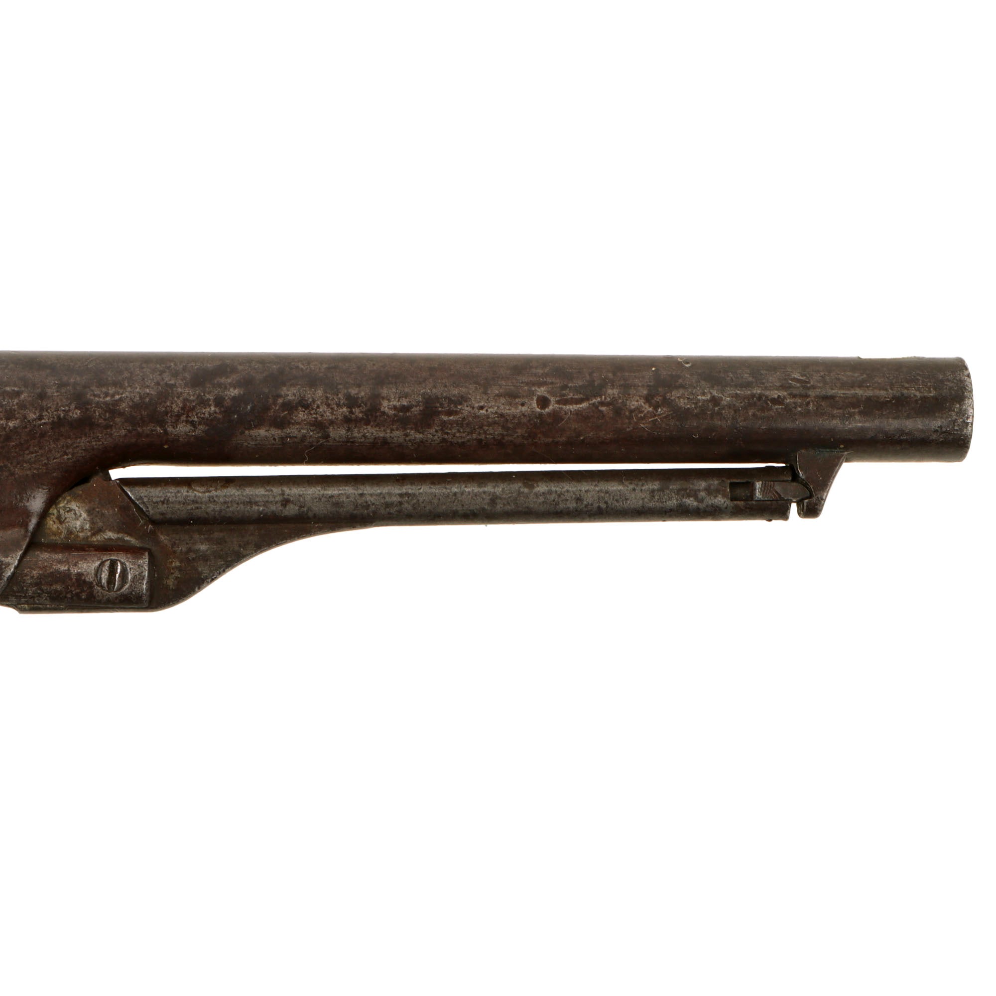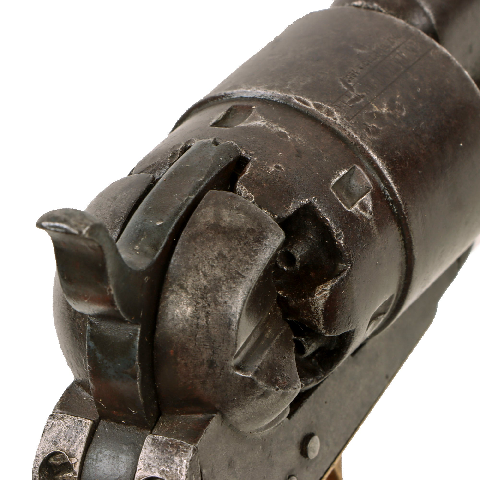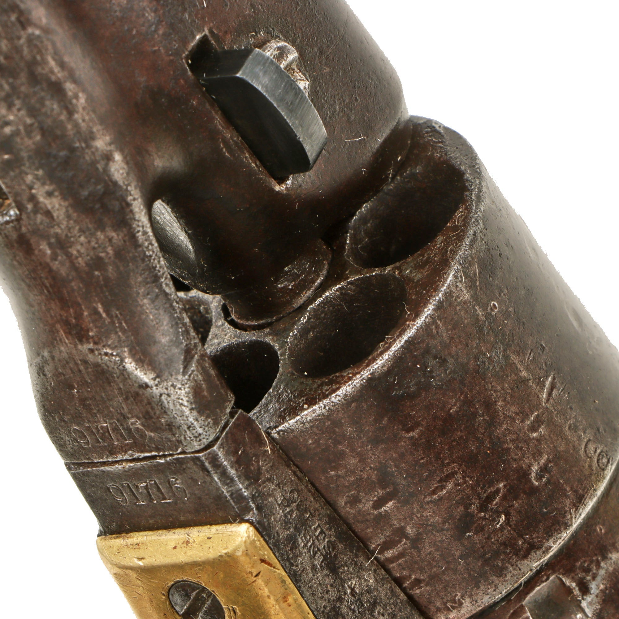 The pistol is complete, and still does function well, with accurate indexing and a relatively good cylinder lockup. Pulling back the hammer fast can cause the cylinder to over rotate due to wear in the cylinder lock inlets. The revolver still breaks down properly with removal of the barrel wedge, and the barrel - frame connection has a bit of wobble, with no signs of past adjustment. The bore is in very good condition, still showing clear lands and grooves with a partly bright finish. The "progressive rifling" is still easily visible, which increases the rate of twist closer to the muzzle. We can see some past oxidation and fouling near the forcing cone, now cleaned away, but overall this is a great condition bore for a black powder percussion revolver. All of the cap nipple cones are present, however all show wear, and one is shattered and blocked, while the others are clear, and one in particular shows a lot of "mushrooming" on the end.