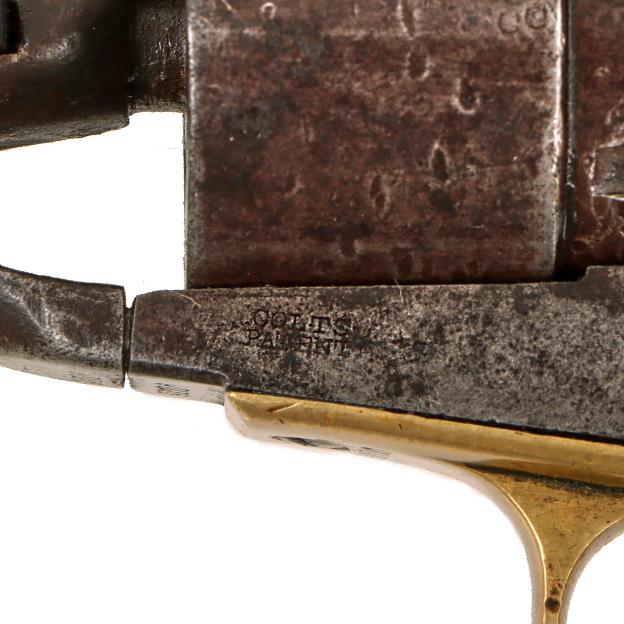 The COLTS PATENT marking is still visible on the left side of the frame, and unlike most we see, the markings on the cylinder are actually relatively well retained! Both the COLT'S PATENT № and PAT. SEPT 10th 1850 markings are almost legible next to the faint shortened serial number. These early Colt revolvers did not have the additional patent dates listed on the frame. The "Naval Engagement Scene" however is almost completely worn away. There are proof marks stamped on various components as well, though there is no "44CAL" stamping on the trigger guard, which is not uncommon. The walnut grip is in great shape, with a lovely color, showing little to no damage.