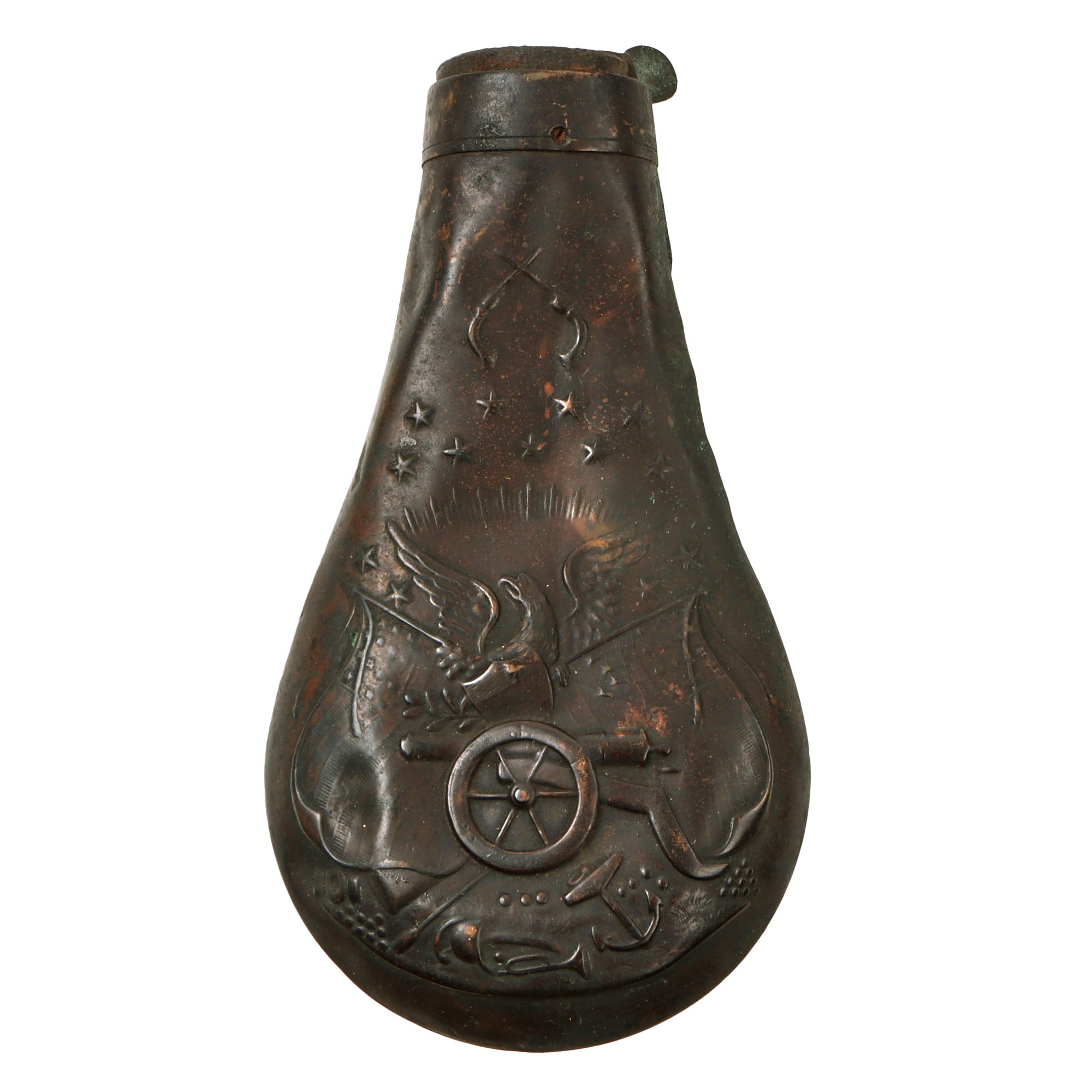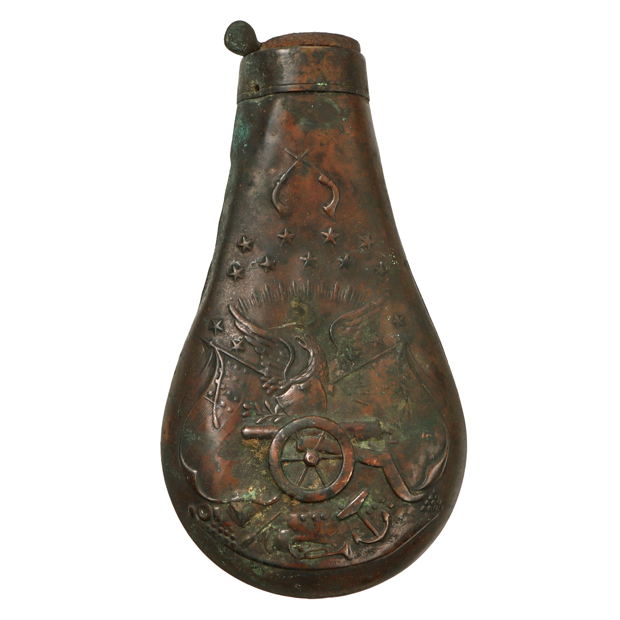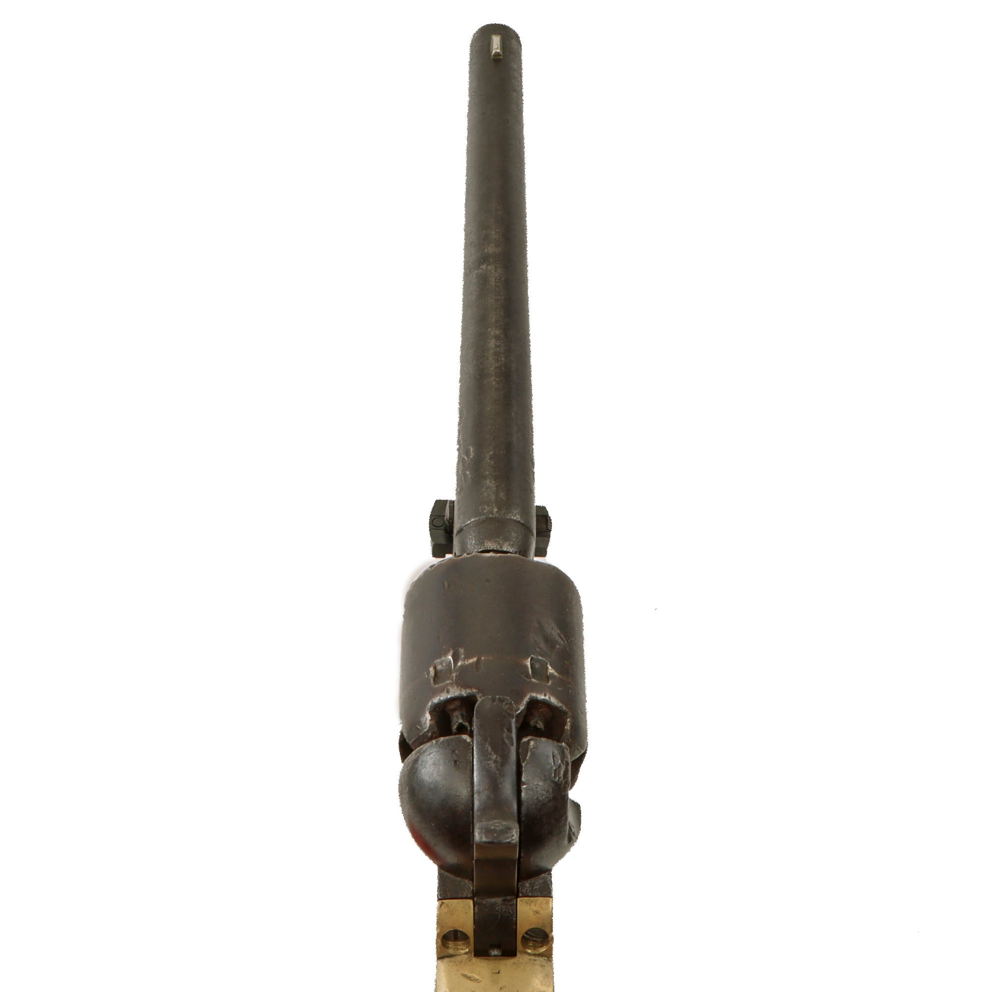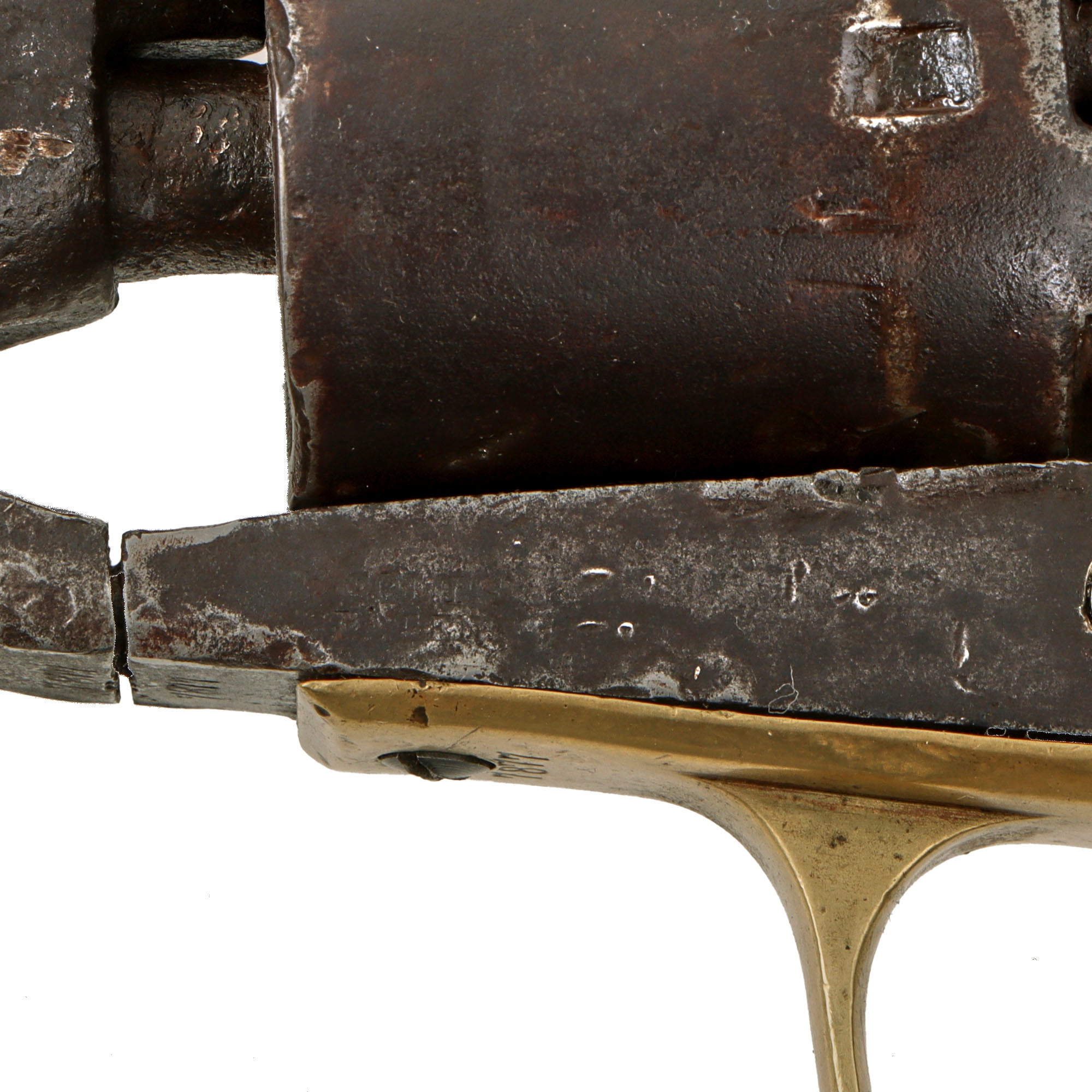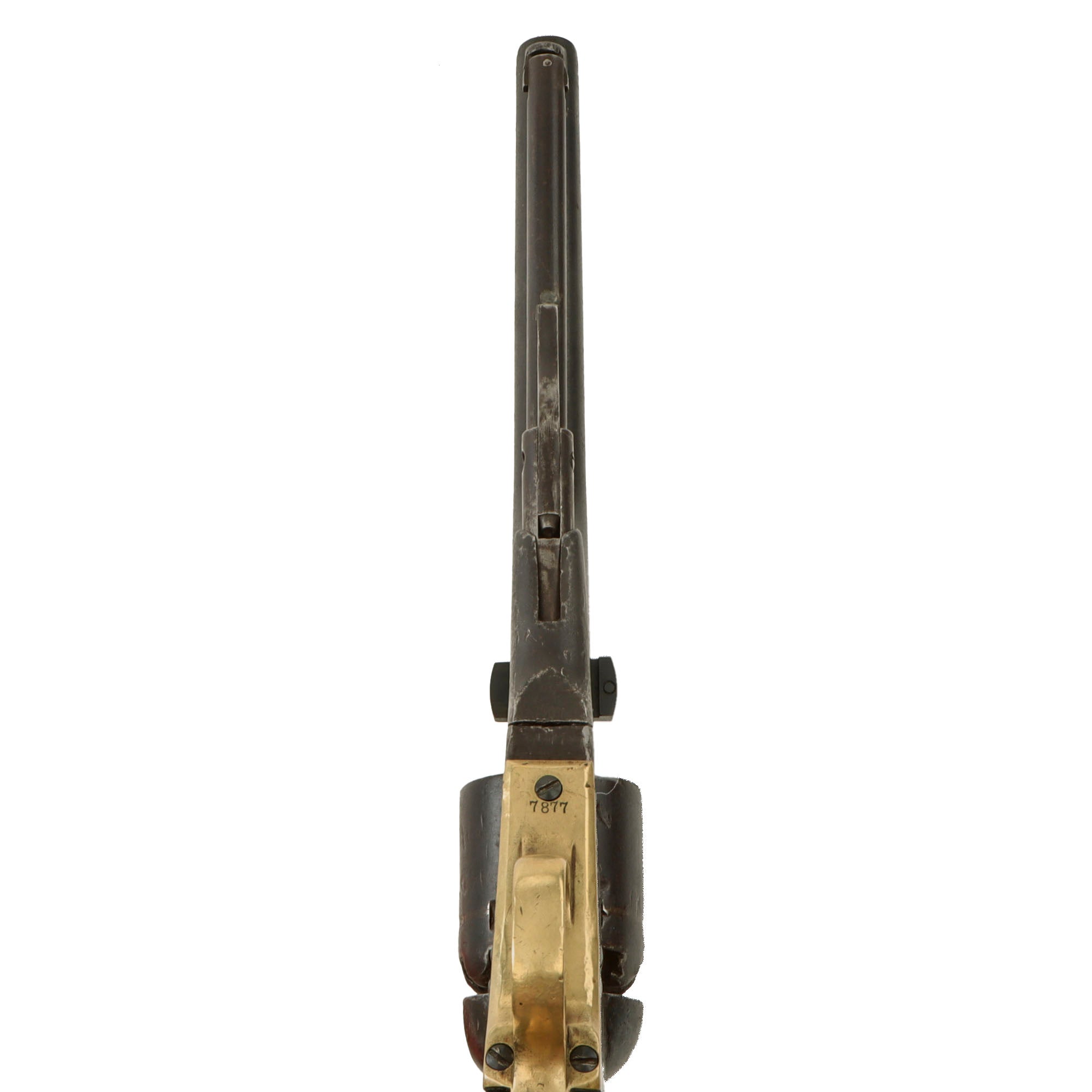 Our example has a Serial Number of 7877, indicating manufacture in 1862, early in the Civil War, so it was almost certainly used during the conflict. It bears the same serial number on the barrel, frame, trigger guard, and grip frame, however the serial number on the cylinder is completely worn away. The cylinder arbor pin is marked with shortened number 877, and the barrel wedge is a recent replacement. It is in the expected .36 caliber and shows a lovely aged dark patina on the exterior, looking to have seen extensive service and cleaning. However the revolver is totally original and shows no signs of refinishing or other modifications.