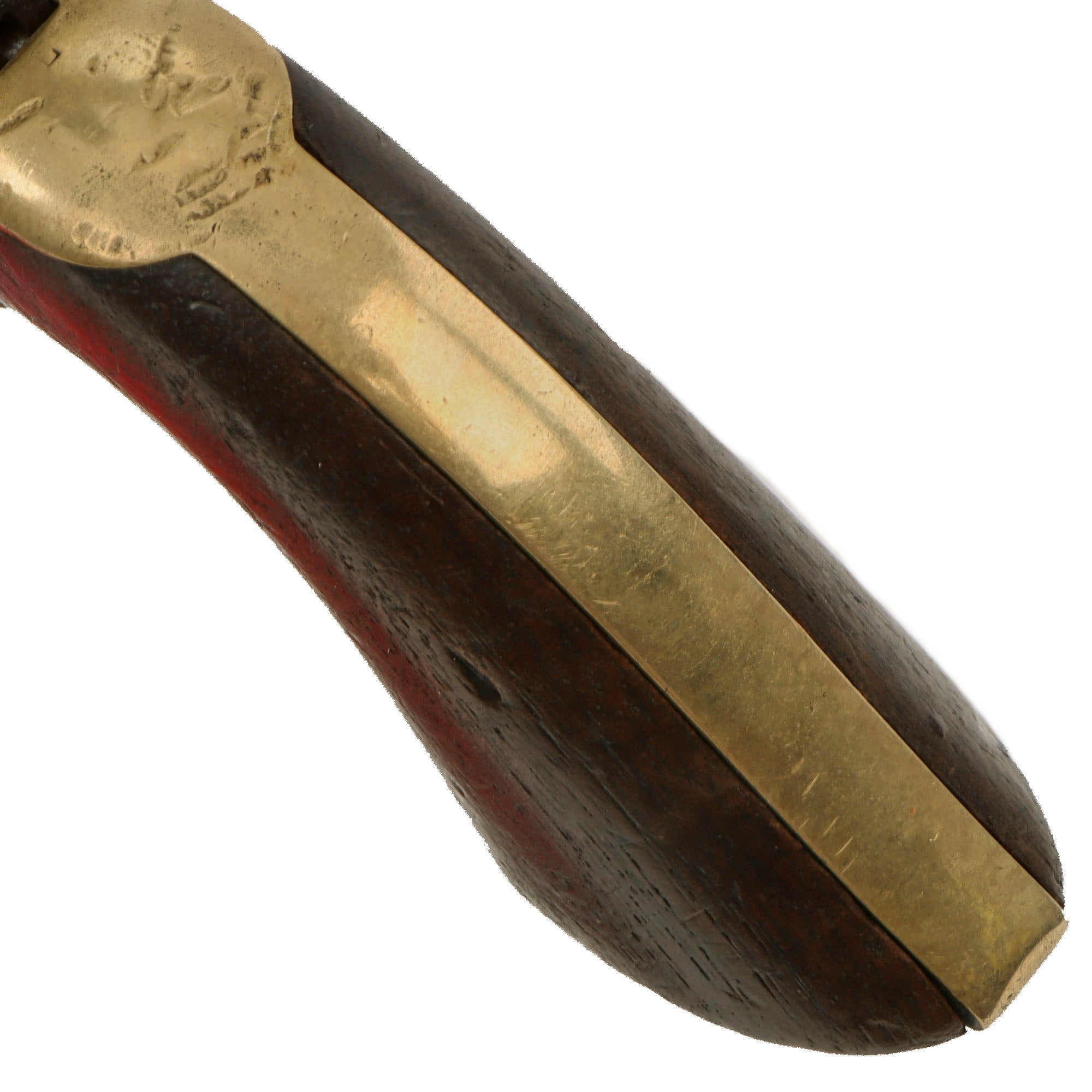 The COLT'S PATENT marking on the left side of the frame is mostly clear, however the trigger guard des not have a "36CAL" stamping, which is relatively common. The cylinder has been worn down and cleaned extensively, so all of the original markings on the sides have been removed. The original walnut grip is quite worn and rounded at the edges, now showing a dark stained color. There are no major cracks or chunks missing.