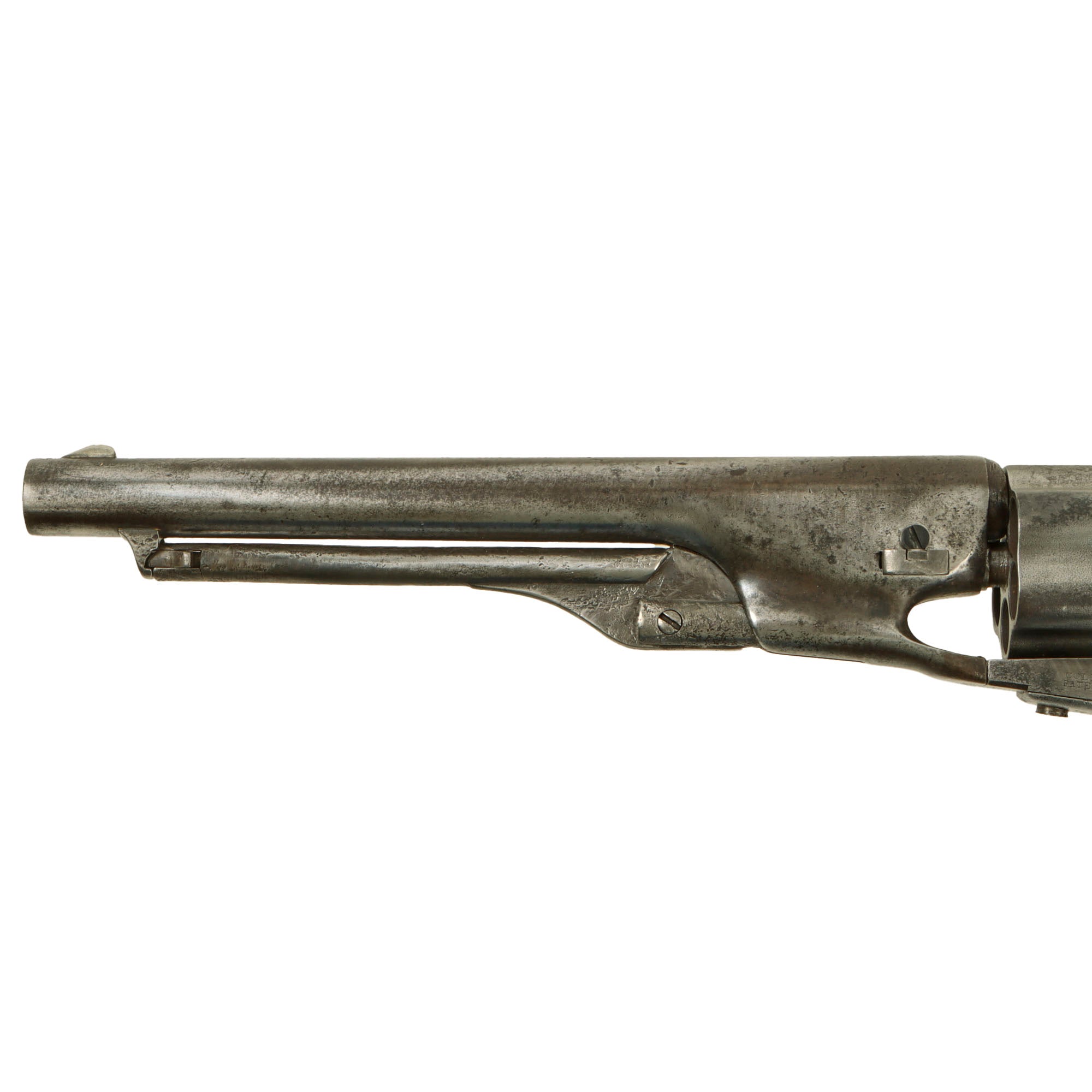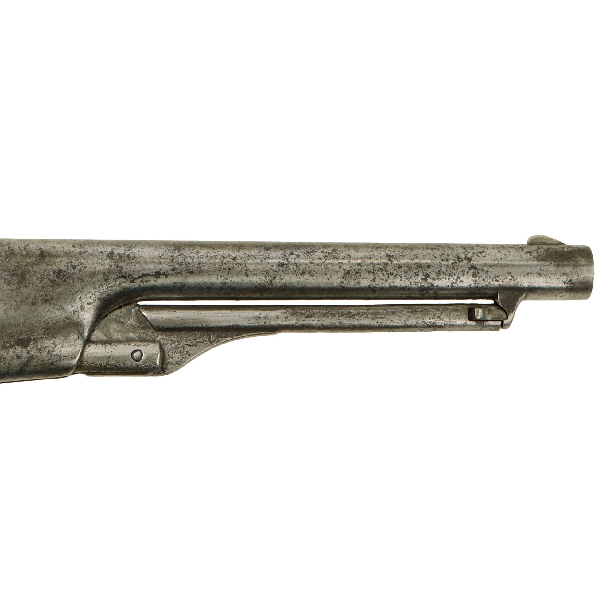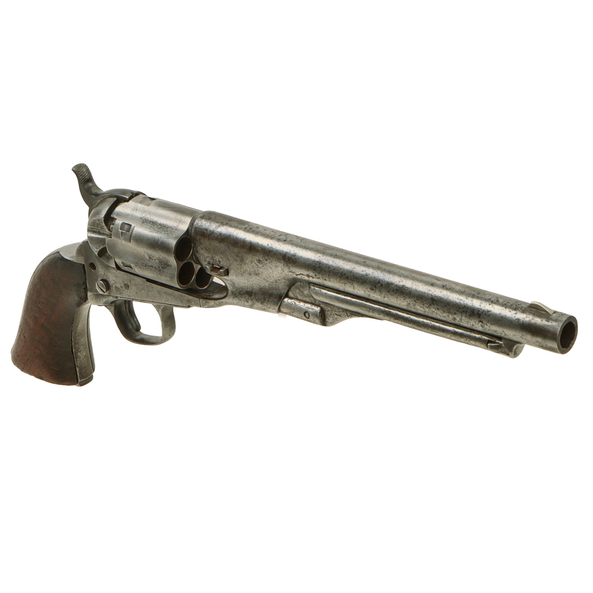 This is one of some 200,000 M1860 Army revolvers made from 1860 through 1873, and was the successor type to the larger Colt Third Model Dragoon horse pistol. The government-issued Colt Army 44 was the major sidearm in use by US troops during the Civil War. This particular handgun is a nice .44 caliber, early production four-screw frame model with a 6-shot fluted cylinder and an 7 ½” round barrel, which was probably shortened slightly due to muzzle damage. It has a lovely worn gray patina, with no signs of refinishing.