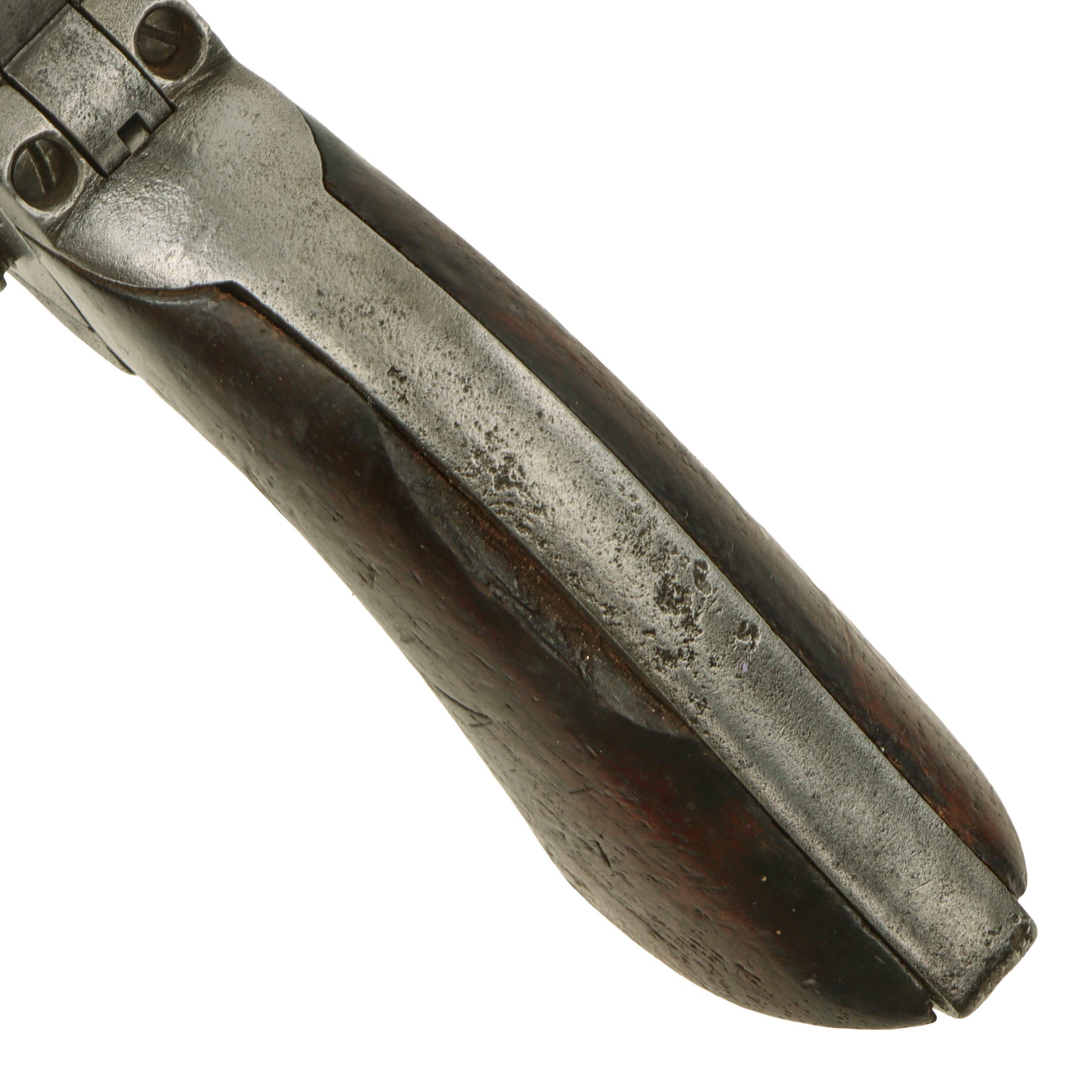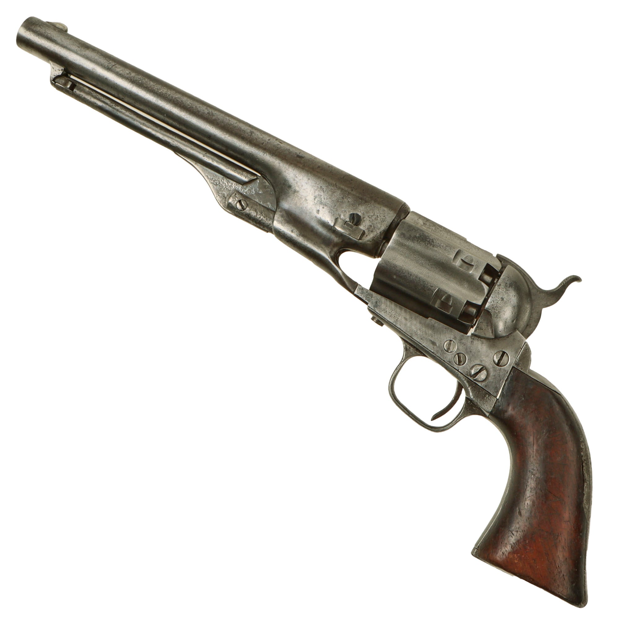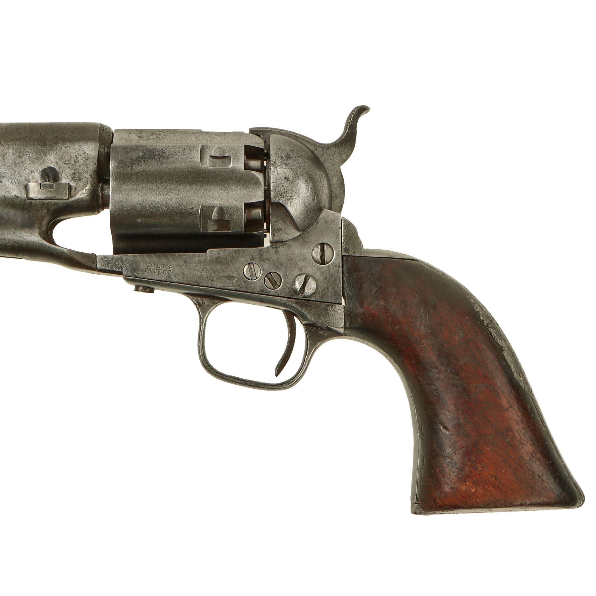 Equipped with a four-screw frame, this revolver was made to fit a shoulder stock and has the recoil shield cutouts on the frame and has the small notch in the iron butt plate. The COLT'S PATENT marking is still fully visible on the left side of the frame, with just a bit of wear to the top. The fluted cylinder is worn on the sides, so if there were any markings present when made, they are now missing. Overall the pistol has a lovely patina of age from use and cleaning. The walnut grip shows relatively heavy period wear, and now is loose in the frame. There is a chunk missing from the right side near the frame, and also one on the left from the rear of the grip. It looks to have seen long use, and any original cartouches are long gone.